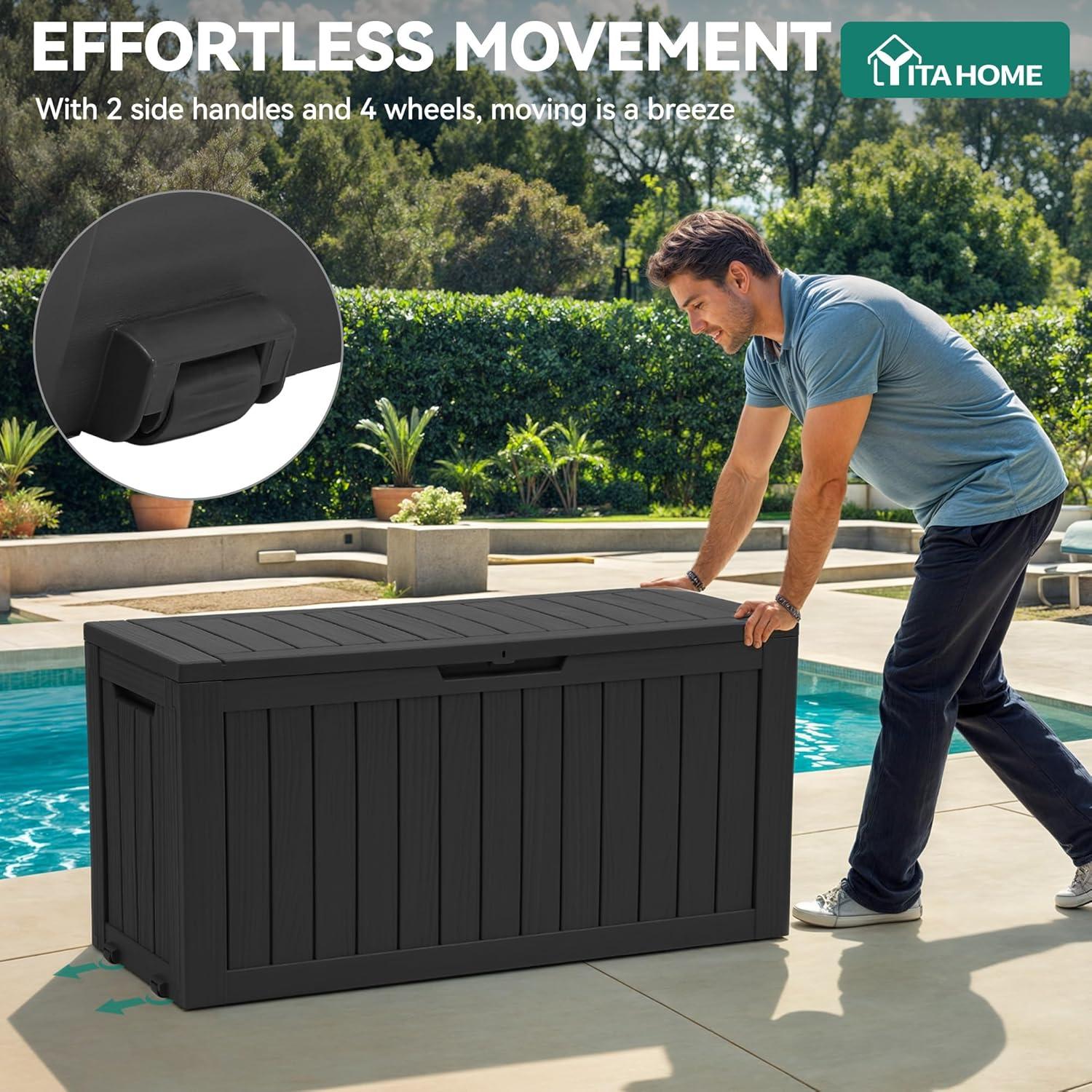 User-Friendly Design: This YITAHOME outdoor cushion storage offers convenience with side handles for easy lifting, a lockable lid for added security (lock not included), and hydraulic struts to prevent lid slamming for user safety