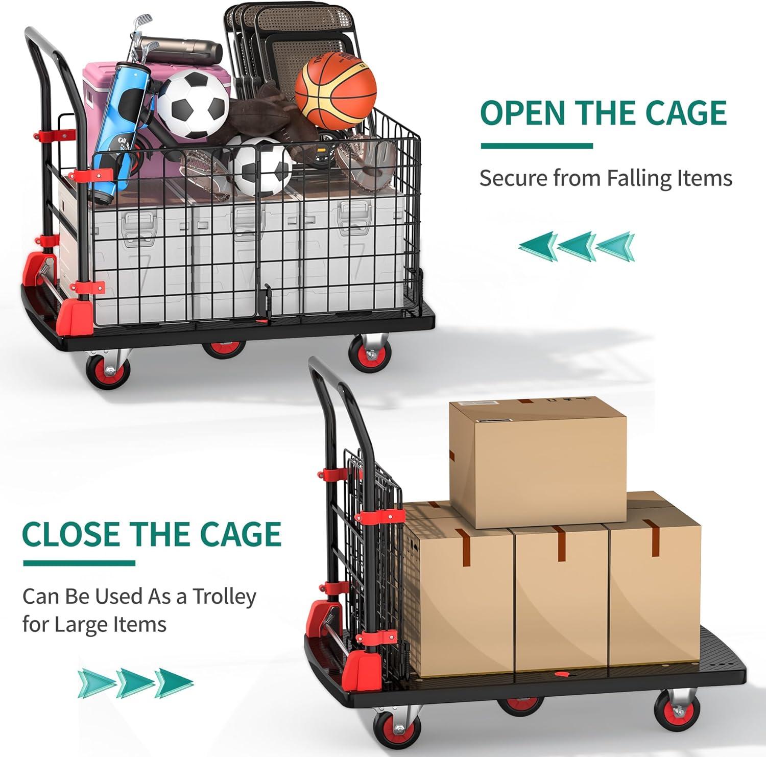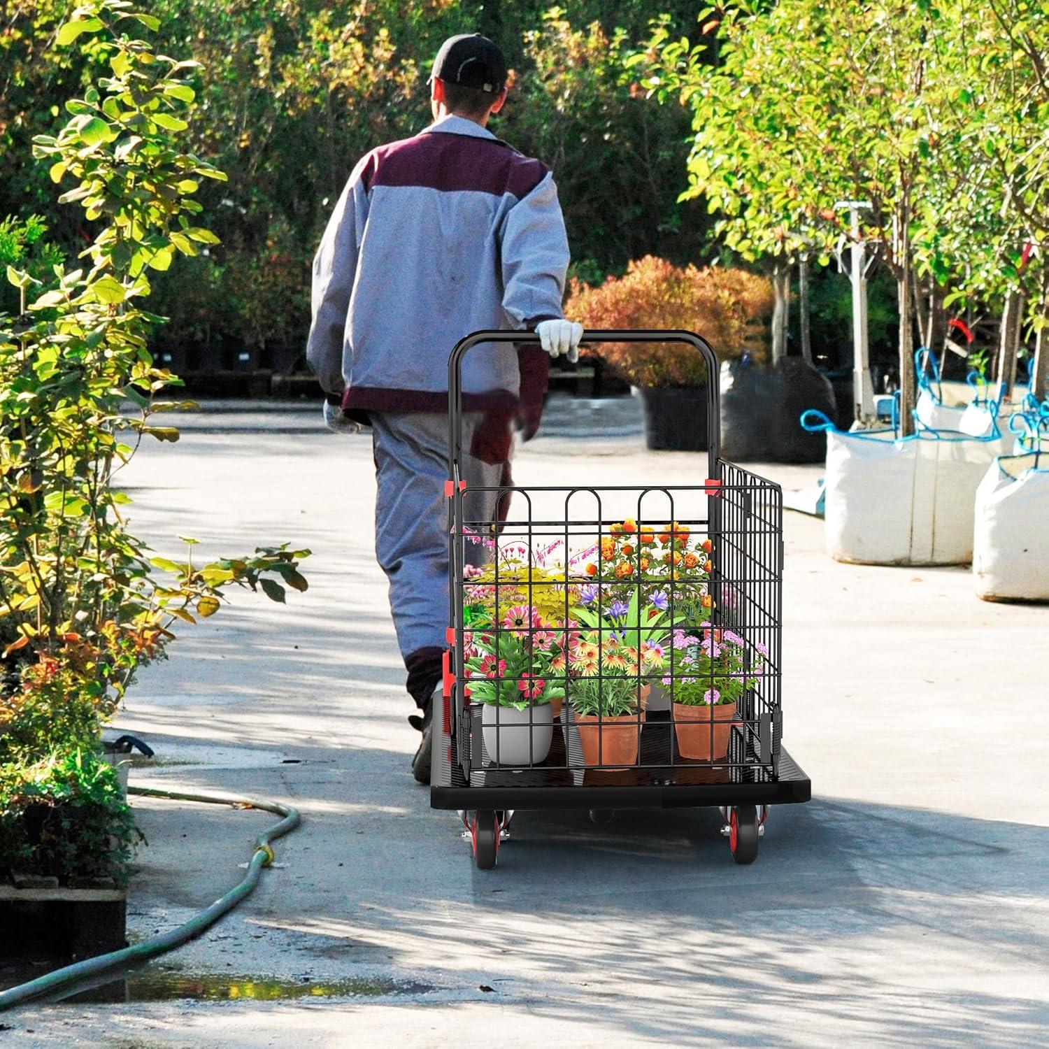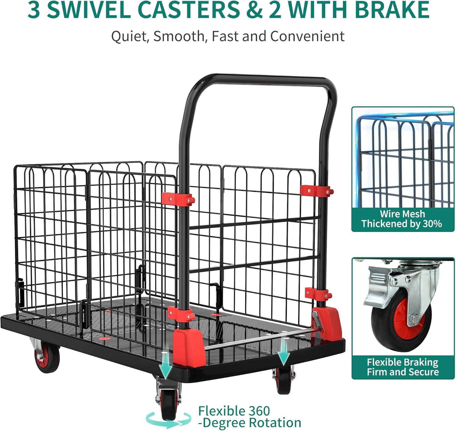 ​​2-in-1 Cart Design​​: Multifunctional 2-in-1 platform panel cart combines panel and flat truck functions for material handling, moving furniture, waste, gardening; 4 side handrails boost practicality versus flatbeds for this hand cart, enhancing organization and protecting materials of the steel panel truck cart from damage or mixing