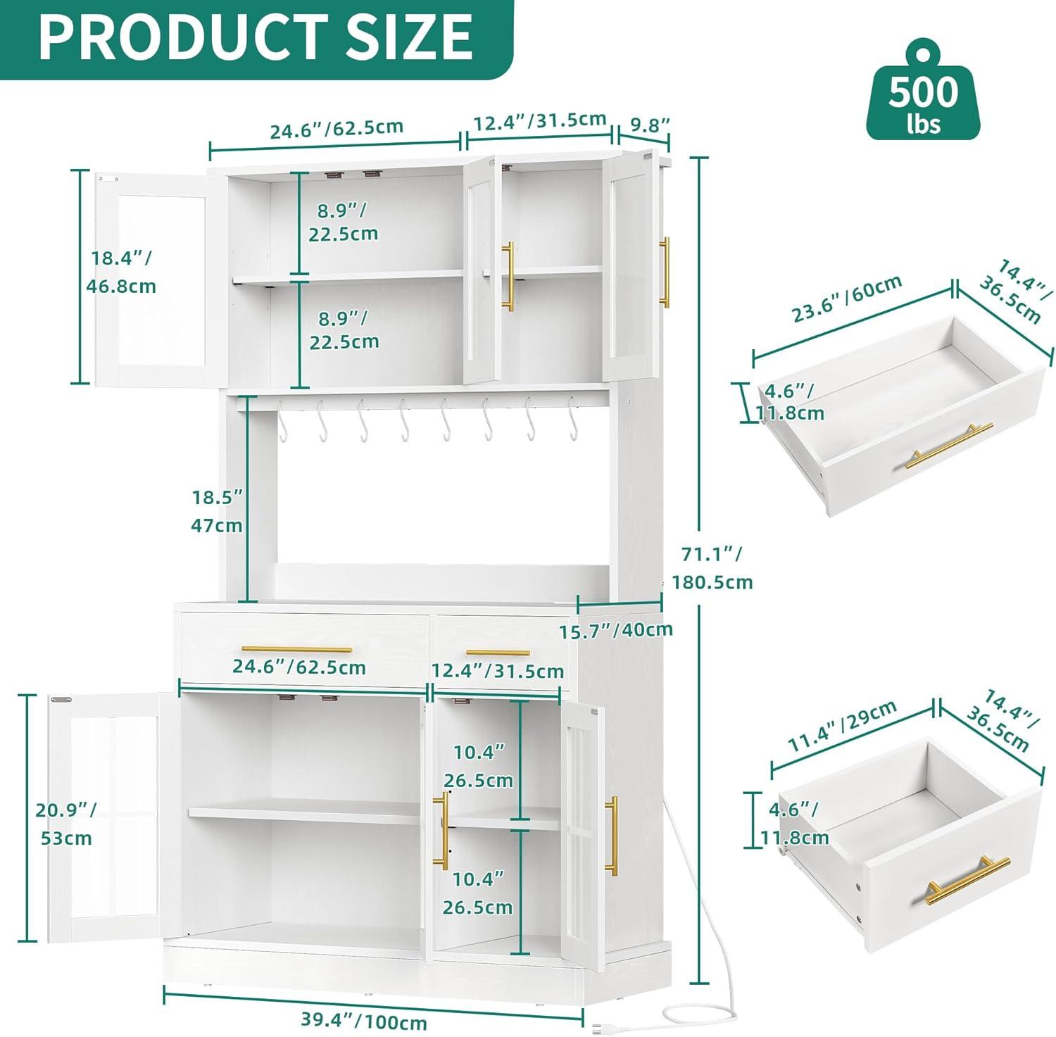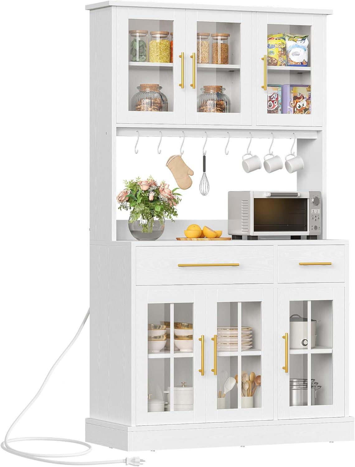 Extra Large Pantry Storage Space: kitchen pantry has 2 enclosed cupboards at the top, great for storing small bottles and jars. With spacious open countertop, you can place coffee makers, toasters, microwaves, etc. Has 2 drawers in the middle for storing a large number of utensils and napkins. Has 2 large enclosed cupboards for storing big items at the bottom. Additional 8 hooks to easily hang your cups or other lightweight items. Its unique design solves most of your storage needs!