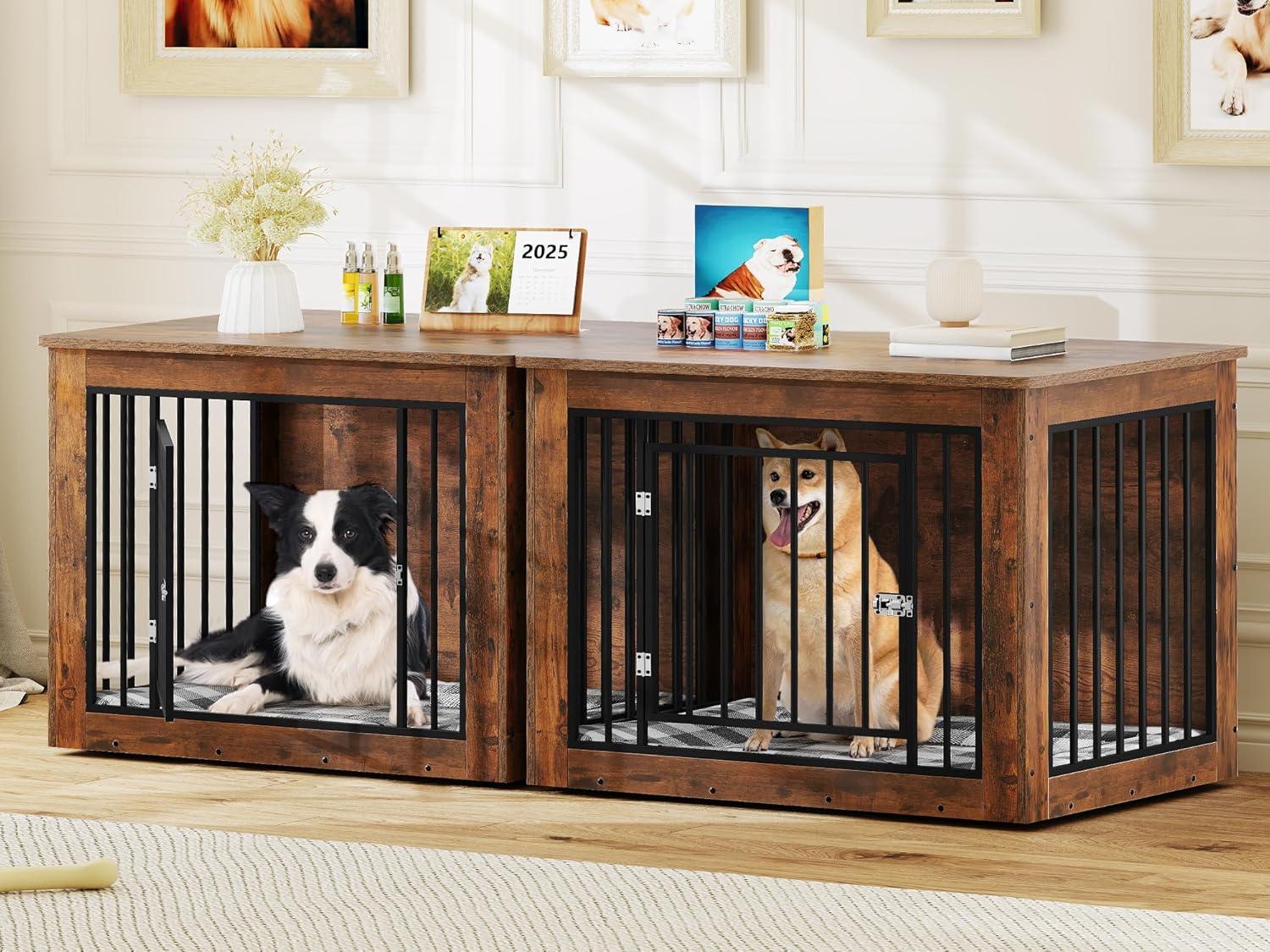 Iron-Wood Fusion: The large dog crate combines a 15mm square tube and 15mm chipboard for added solidity and durability; This fusion promotes both strength and aesthetic appeal; The rustic brown finish blends well with any home decor, making it a versatile addition to your living space