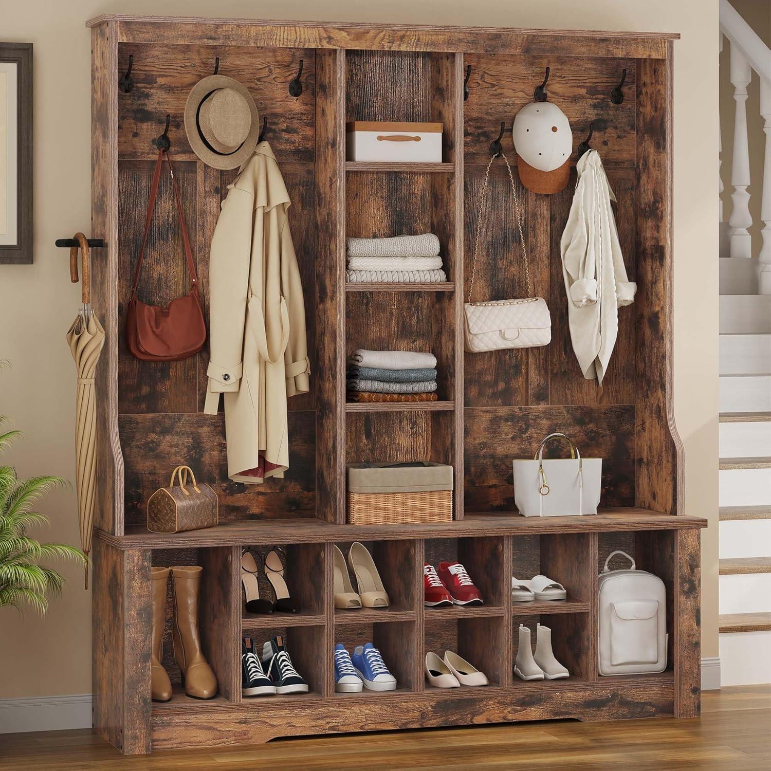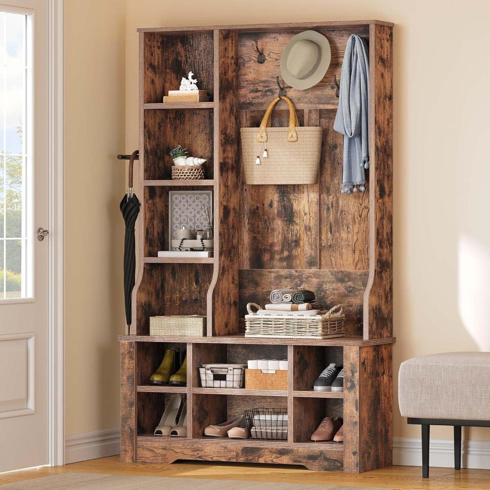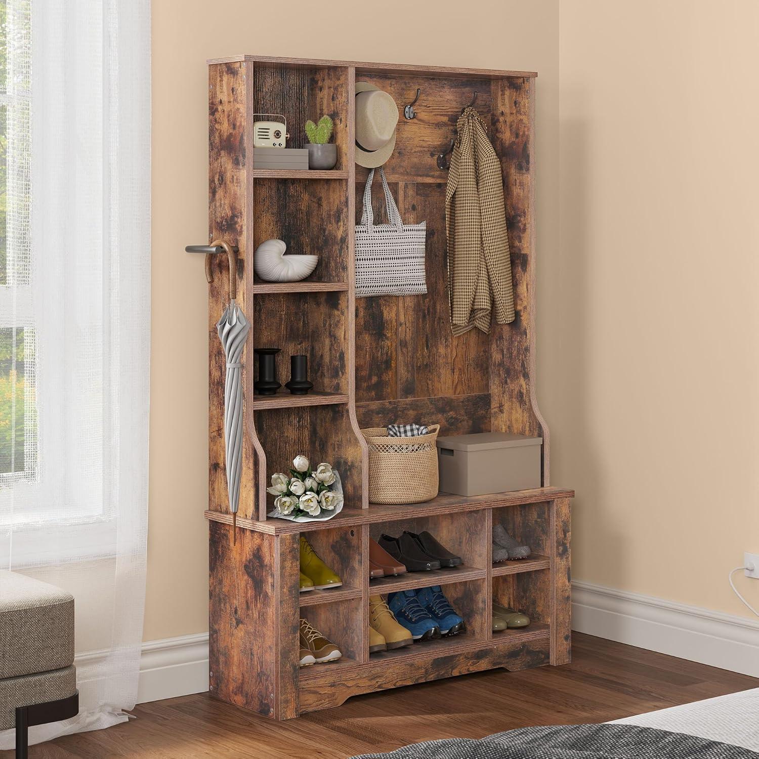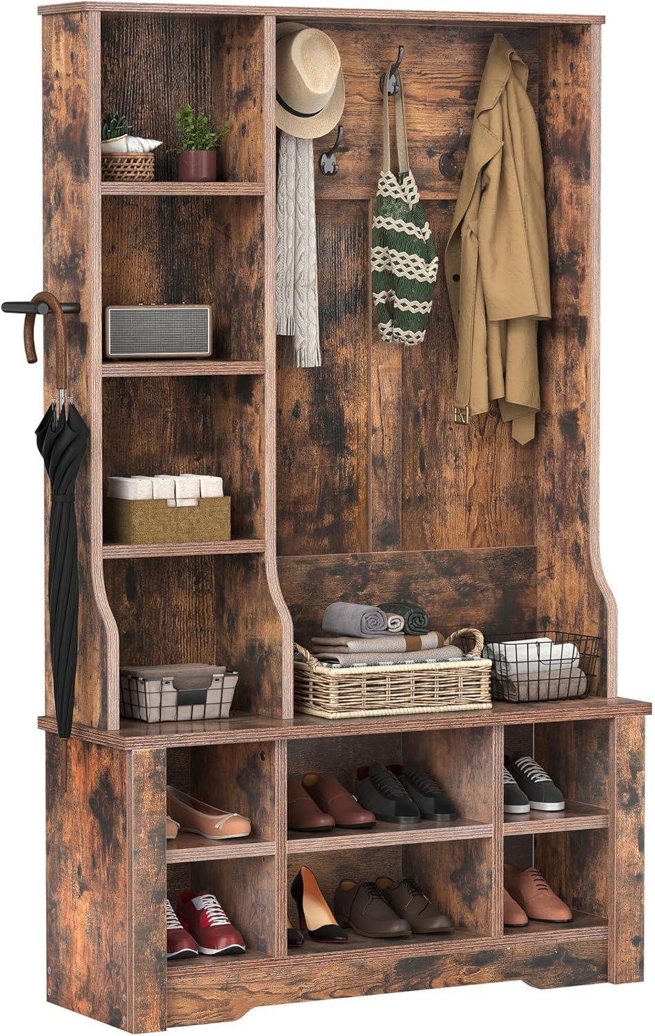YITAHOME 39″ Farmhouse Hall Tree with Entryway Bench, Wood Coat Rack with Storage Shelves, 5 Coat Hooks, 6 Shoe Cubbies w/Adjustable Shelves, Rustic Hall Tree for Entryway Hallway Foyer Narrow, Brown(Rustic Brown)