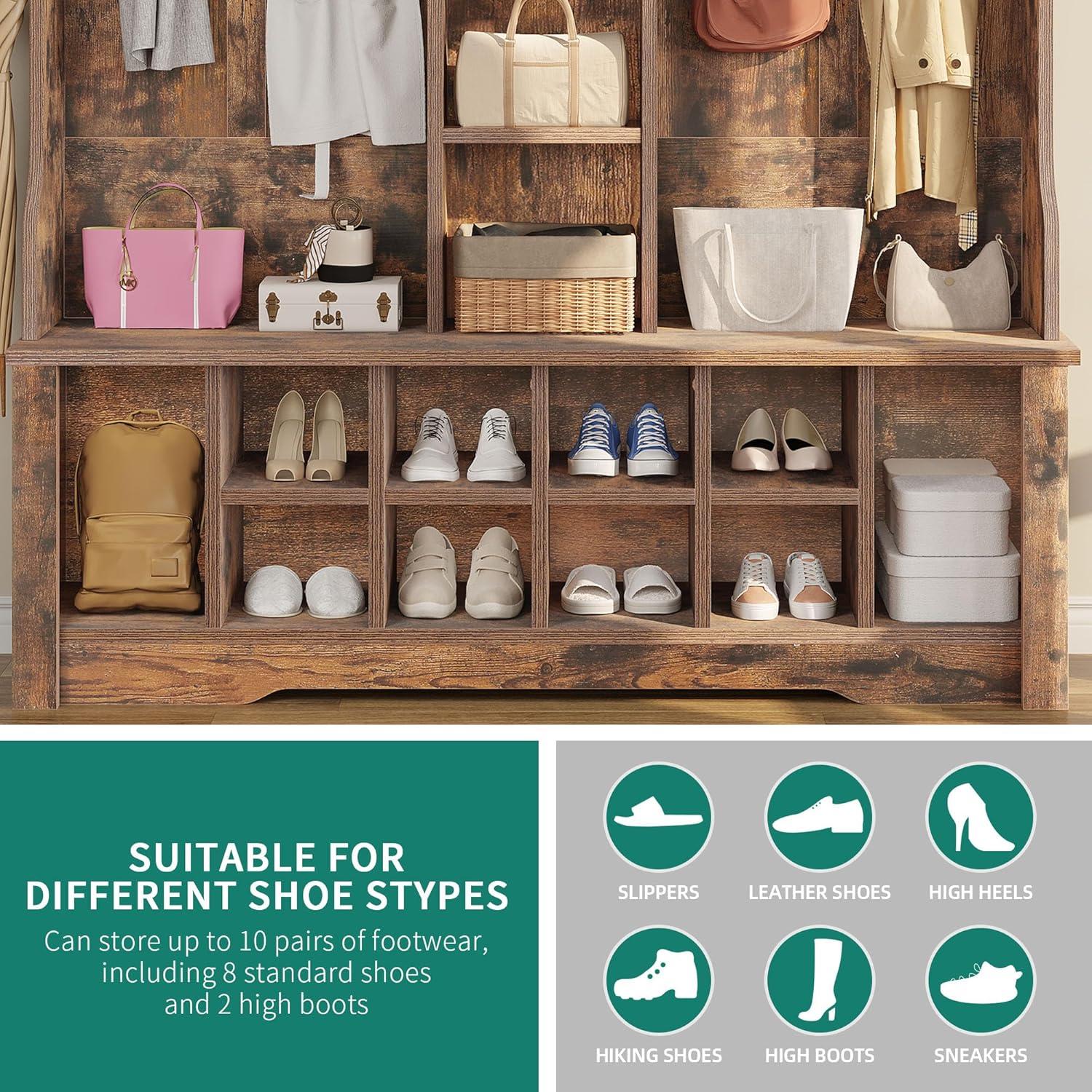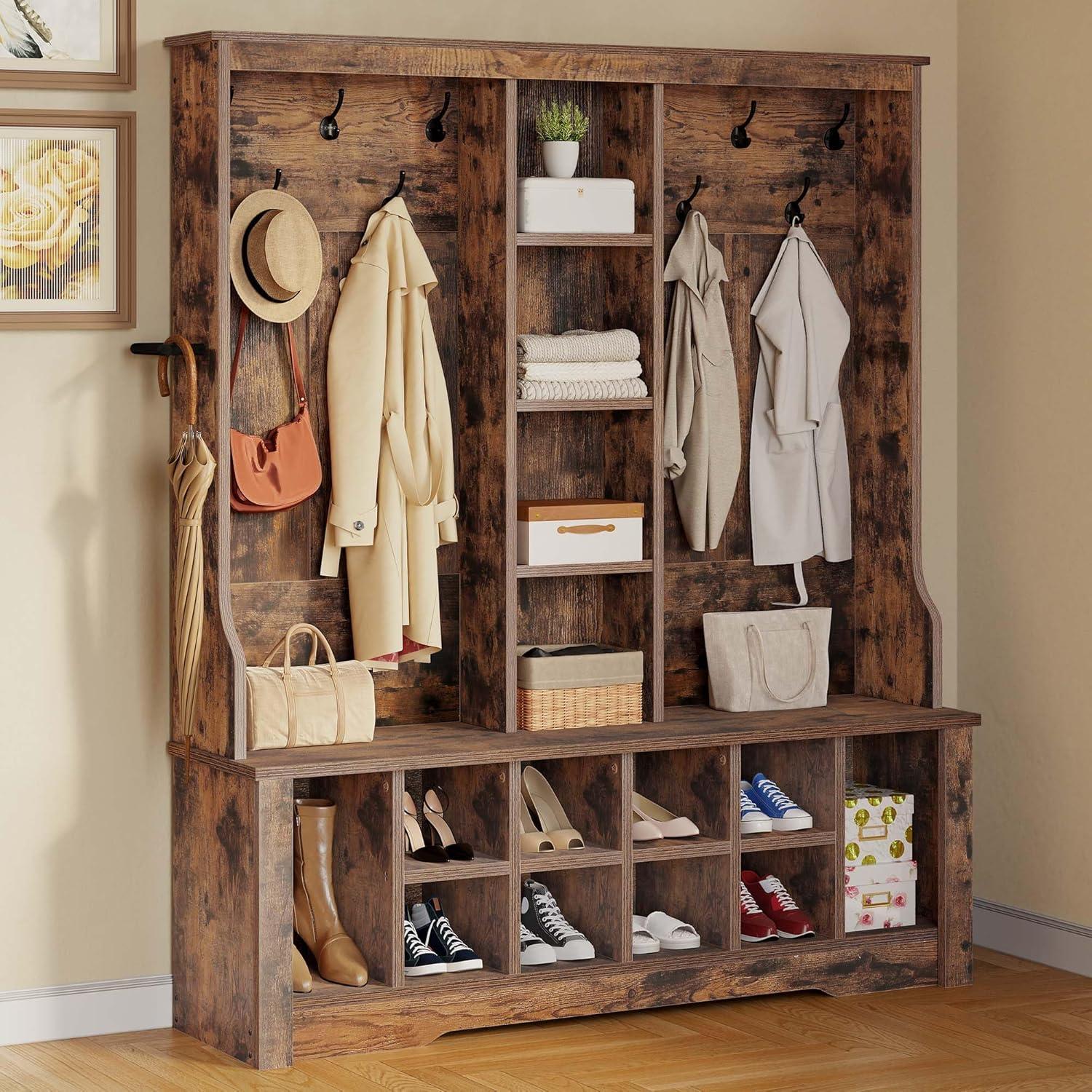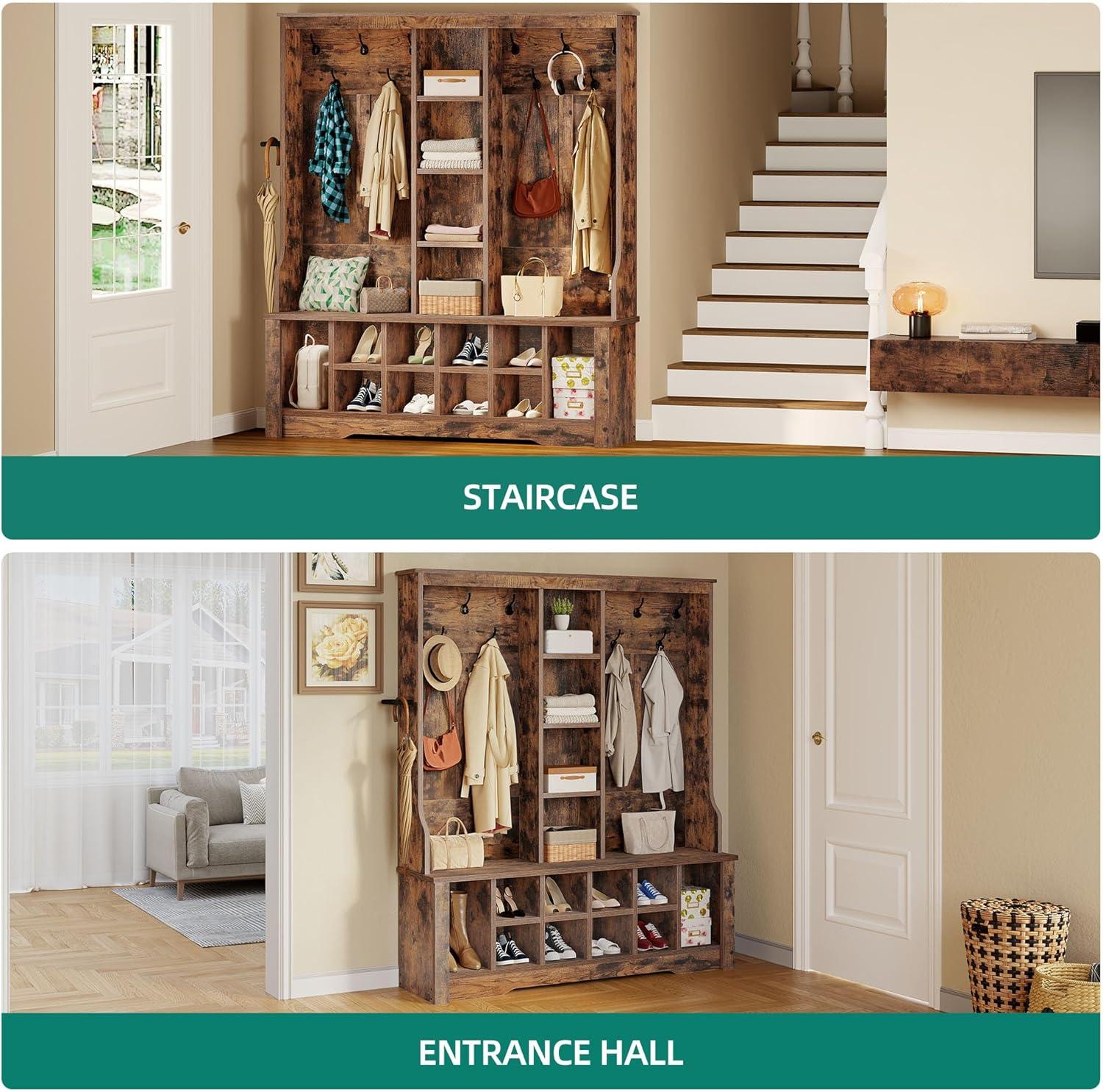 YITAHOME 39″ Farmhouse Hall Tree with Entryway Bench, Wood Coat Rack with Storage Shelves, 5 Coat Hooks, 6 Shoe Cubbies w/Adjustable Shelves, Rustic Hall Tree for Entryway Hallway Foyer Narrow, Brown(Rustic Brown)