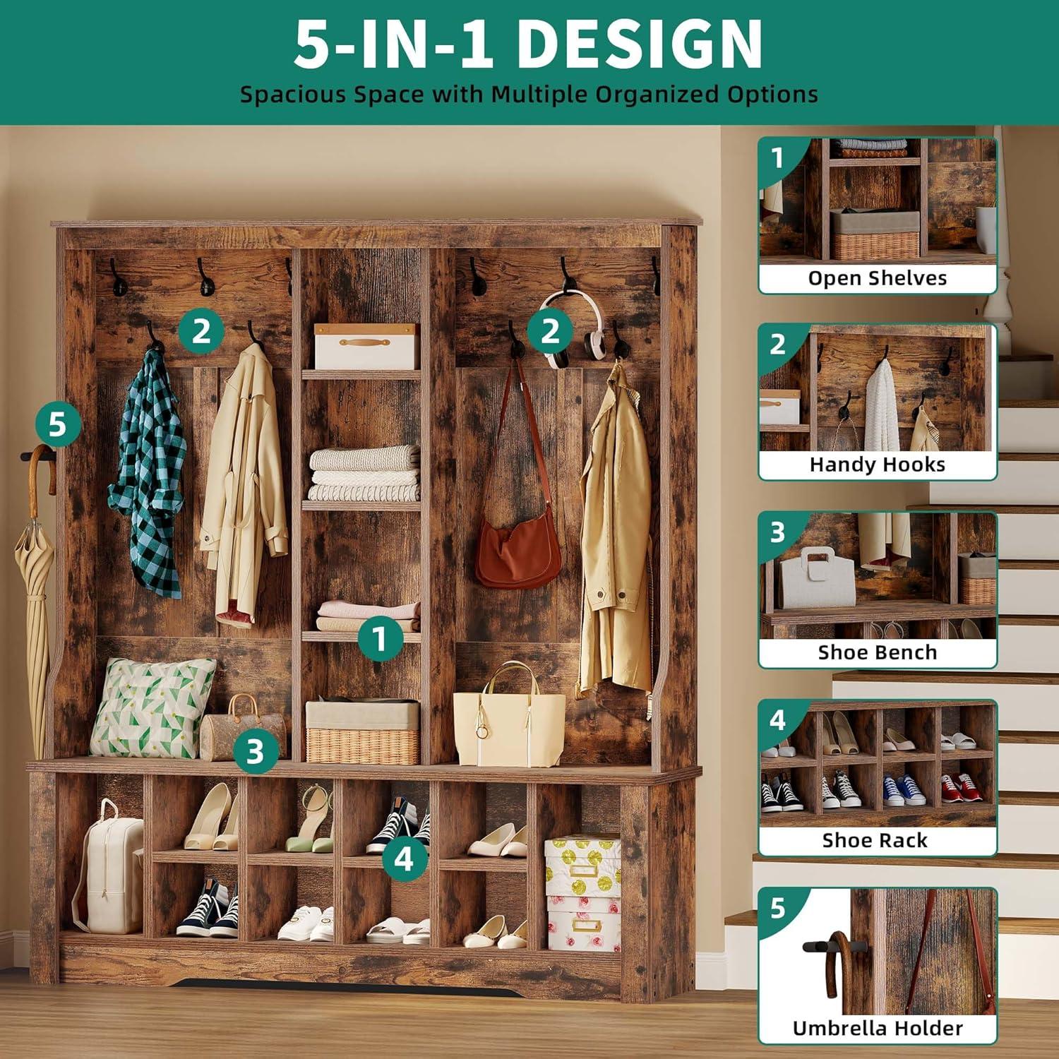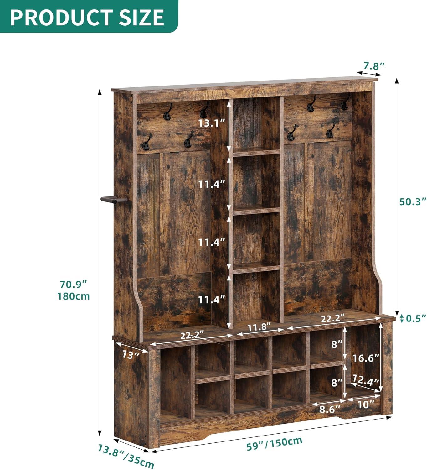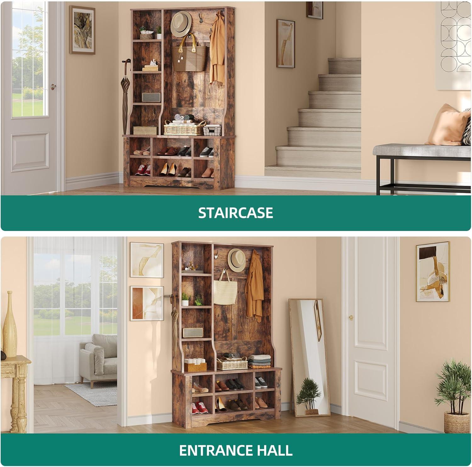 Space-Saving Storage Solution: This hall tree is your one-stop organizer. With a roomy shoe bench, 5 solid coat hooks, 6 spacious shoe compartments, 4 side shelves, and an umbrella holder, everything you need is right where you want it. Tidy up and stay organized in an instant