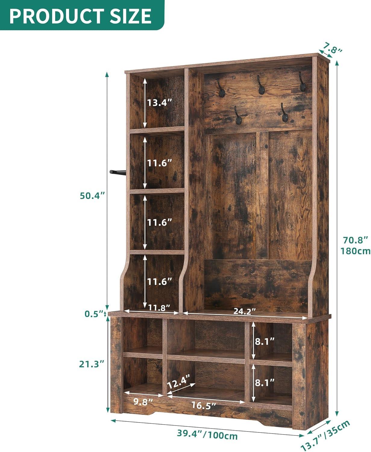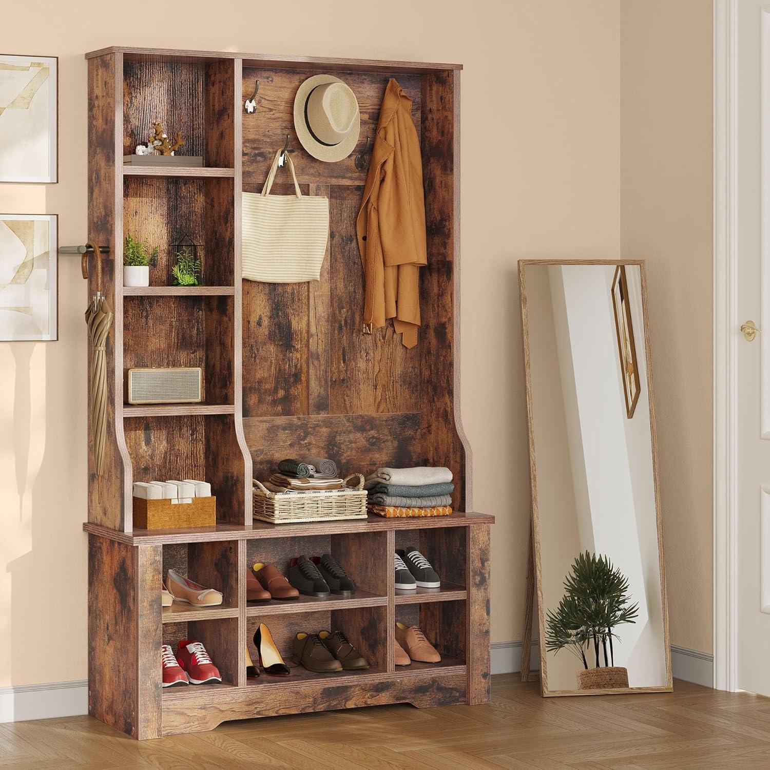 YITAHOME 39" Farmhouse Hall Tree with Entryway Bench, Wood Coat Rack with Storage Shelves, 5 Coat Hooks, 6 Shoe Cubbies w/Adjustable Shelves, Rustic Hall Tree for Entryway Hallway Foyer Narrow, Brown(Brown)