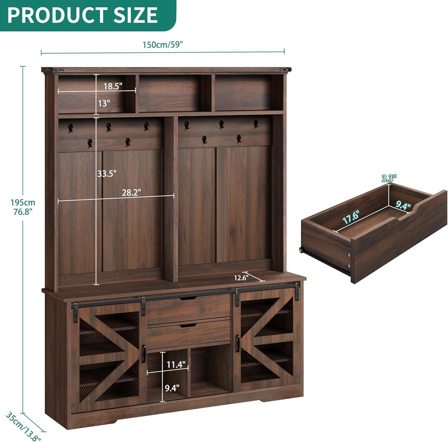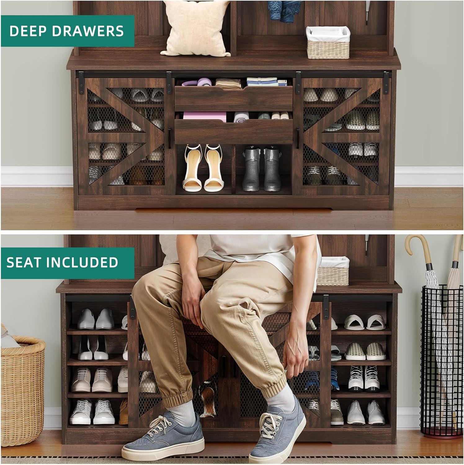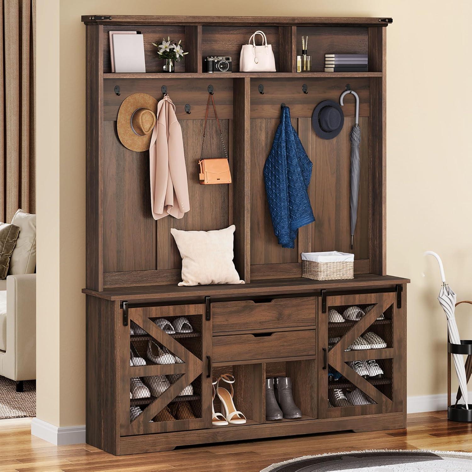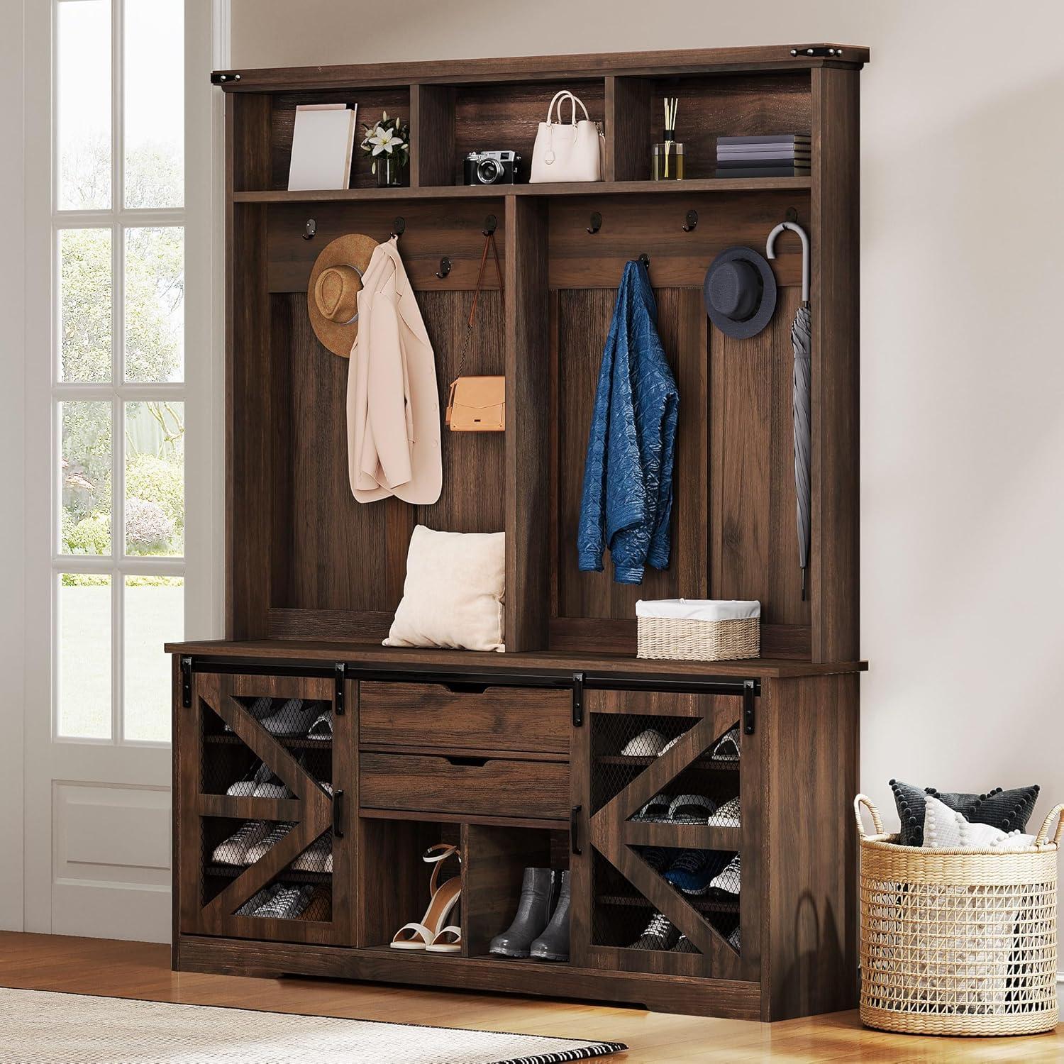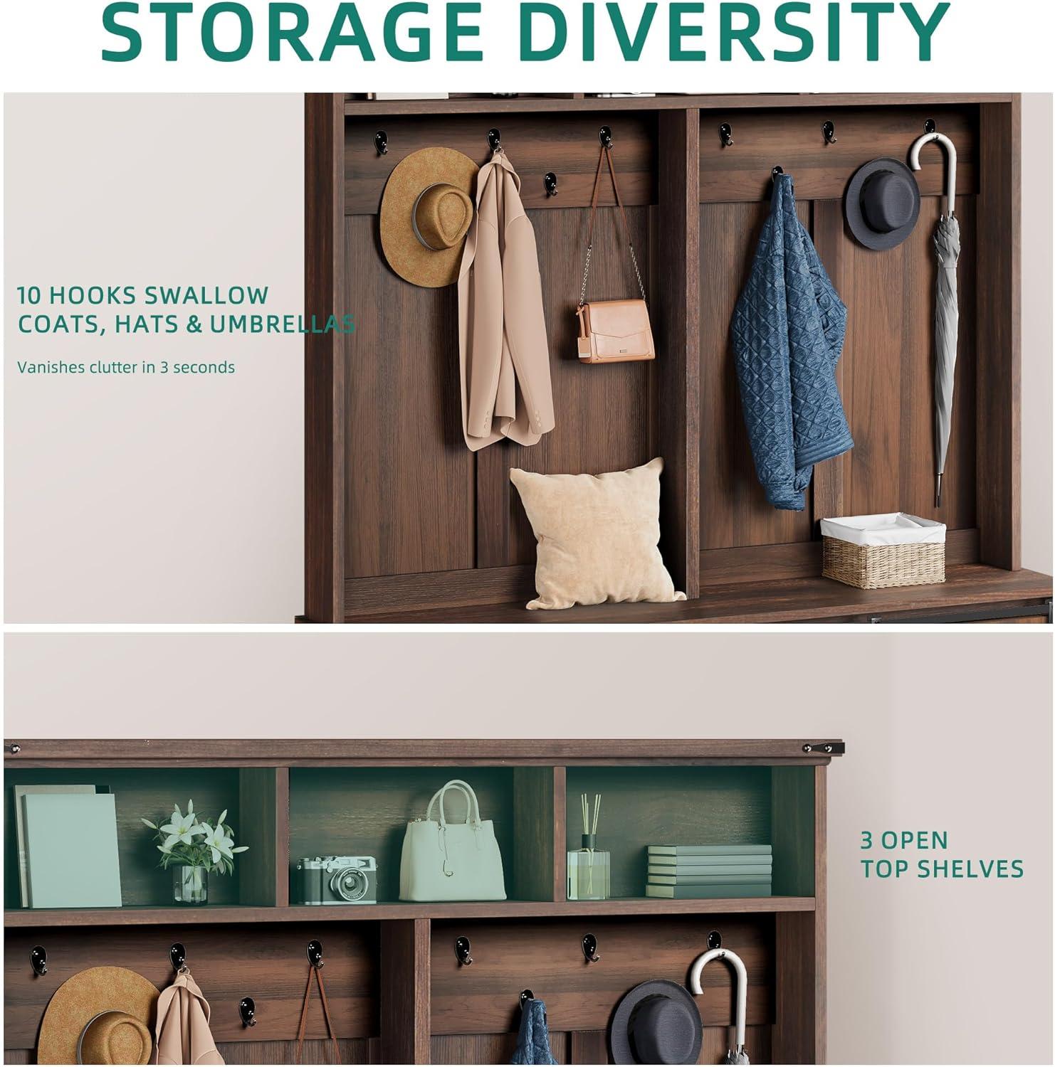 Rustic Elegance: Suitable for your entryway, hallway, or living room, this hall tree adds both function and style. The brown tones bring a farmhouse charm that’s inviting and versatile, fitting seamlessly into your home