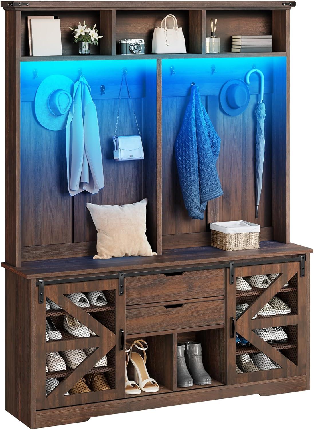 YITAHOME 39″ Farmhouse Hall Tree with Entryway Bench, Wood Coat Rack with Storage Shelves, 5 Coat Hooks, 6 Shoe Cubbies w/Adjustable Shelves, Rustic Hall Tree for Entryway Hallway Foyer Narrow, Brown(Rustic Brown)