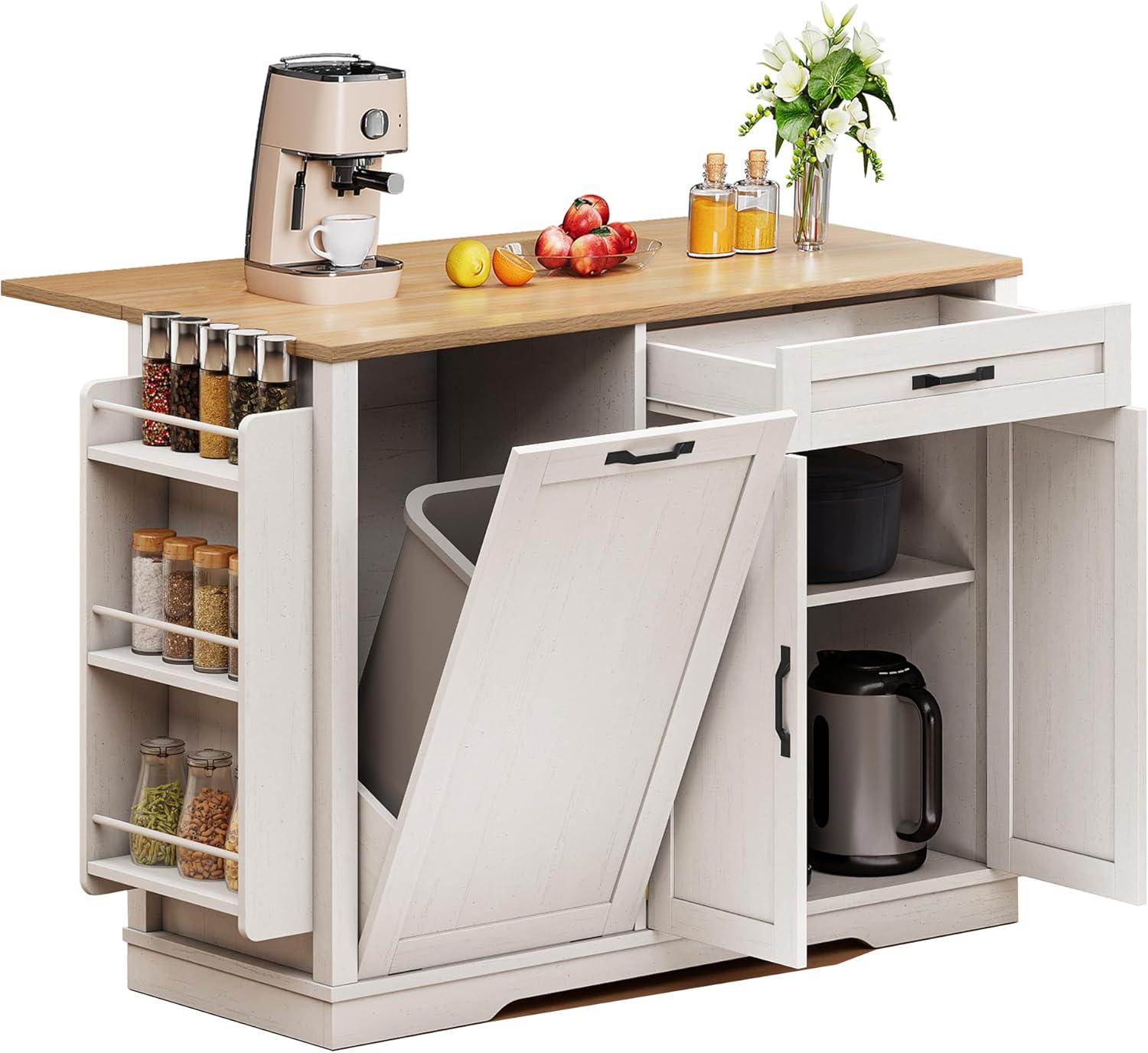 YITAHOME 50 Inch Rolling Kitchen Island with Trash Can Storage Cabinet & Drop Leaf, Portable Mobile Islands Table Long Floating Movable w Wheels Drawer Cabinet for 13 Gallon Garbage Bin, Off White(Off White)