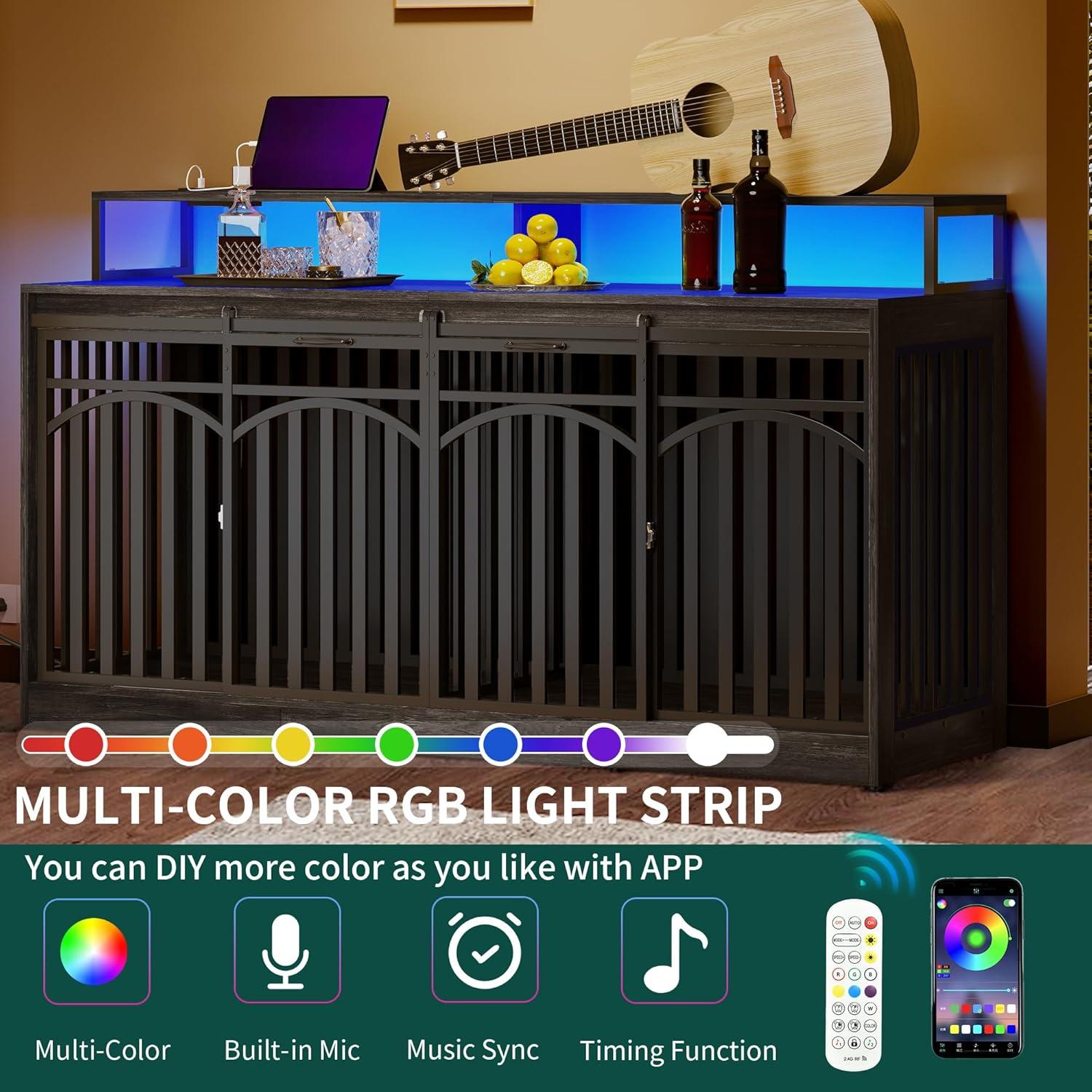 imageYITAHOME 55 Inch Large Dog Crate Furniture Heavy Duty Wooden Dog Crate TV Stand with 2 Dog Bowls Metal Dog Kennel Indoor Furniture Sliding Barn Door Design for Extra Large Dogs Black OakBlack OakLed Light