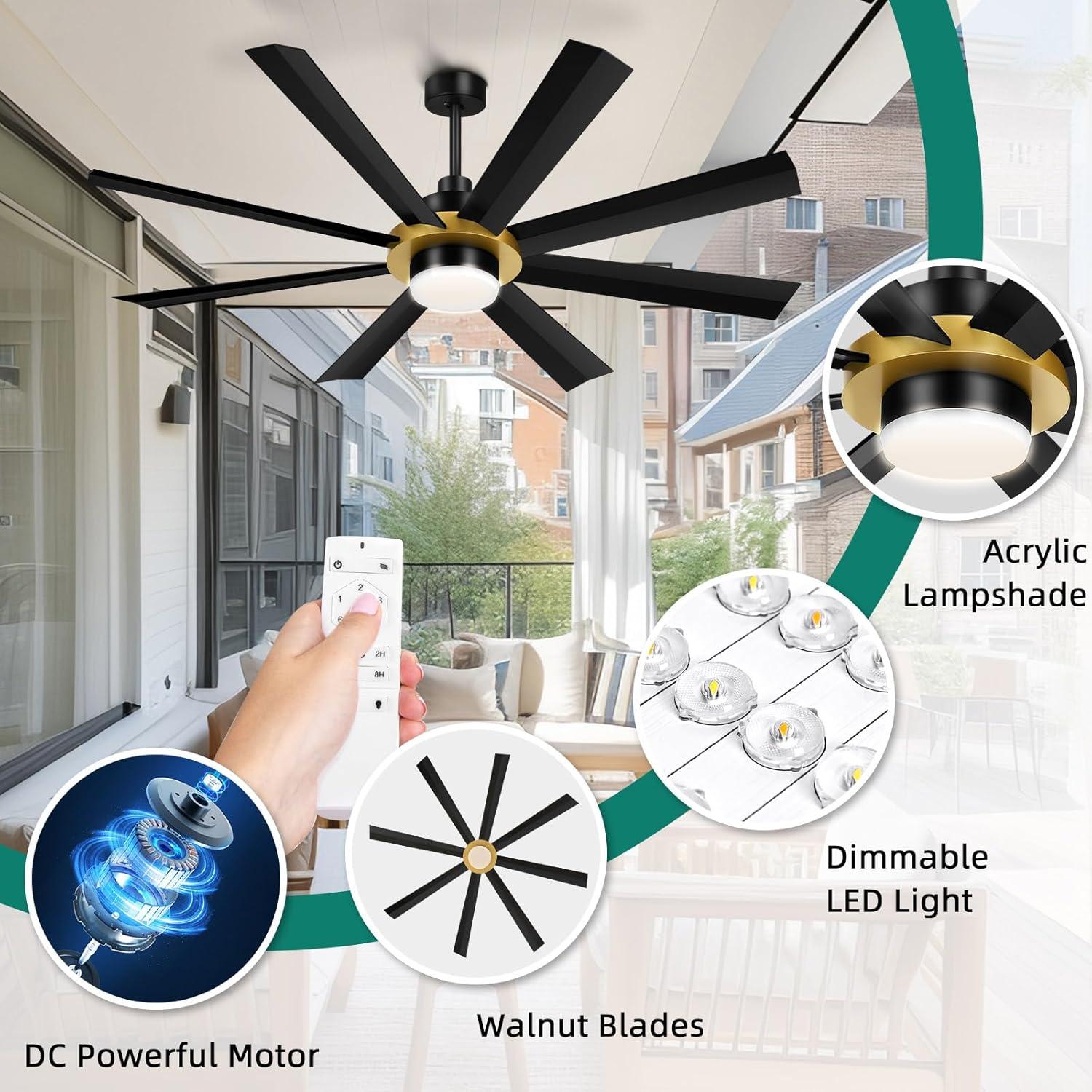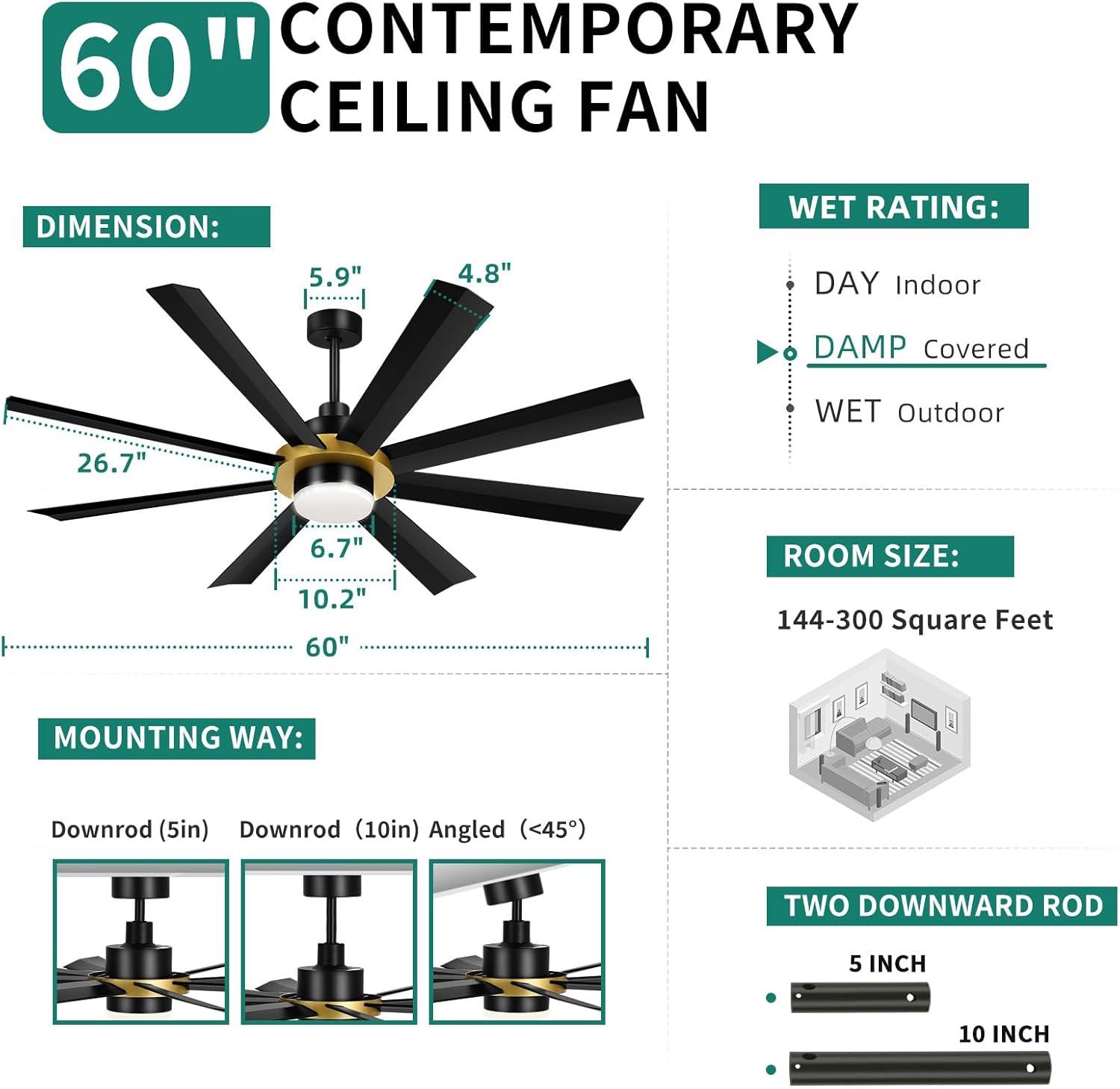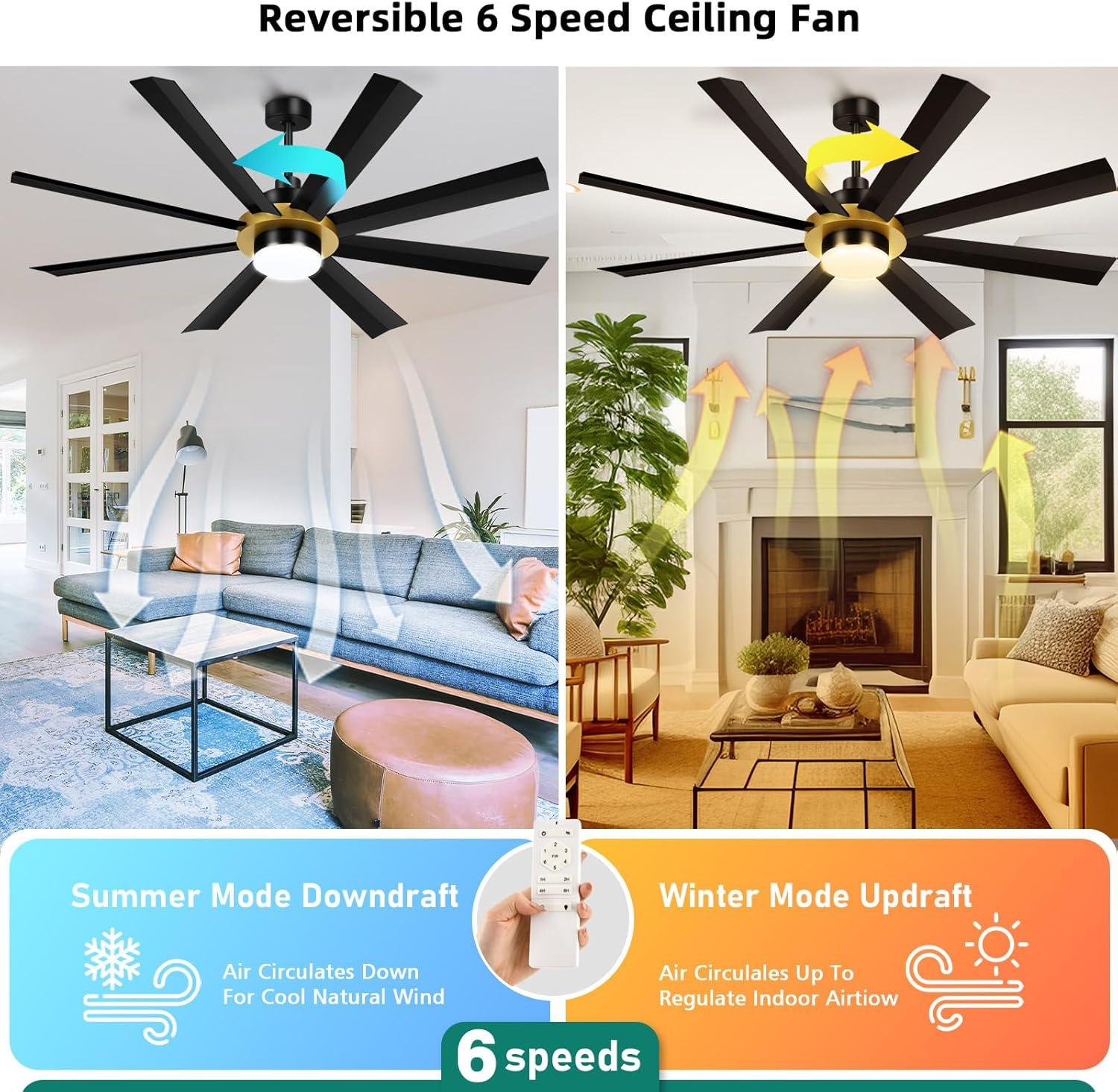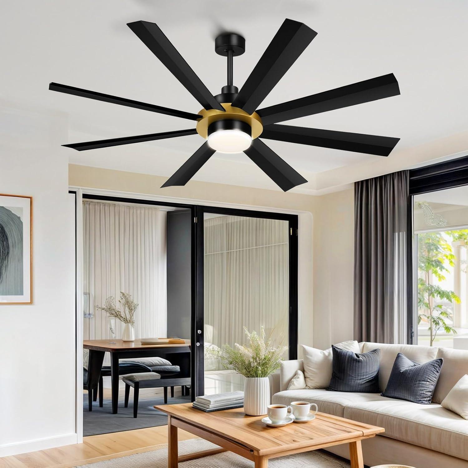 Modern 60-Inch Ceiling Fan Light: This 8-blade ceiling fan for living room features a sleek, modern design with 8 black blades and a distinctive gold light cover, blending industrial and farmhouse styles Excellently. Ideal for living rooms, garages, barns, and covered patios, its large size is a cost-effective and eye-catching alternative to multiple smaller fans