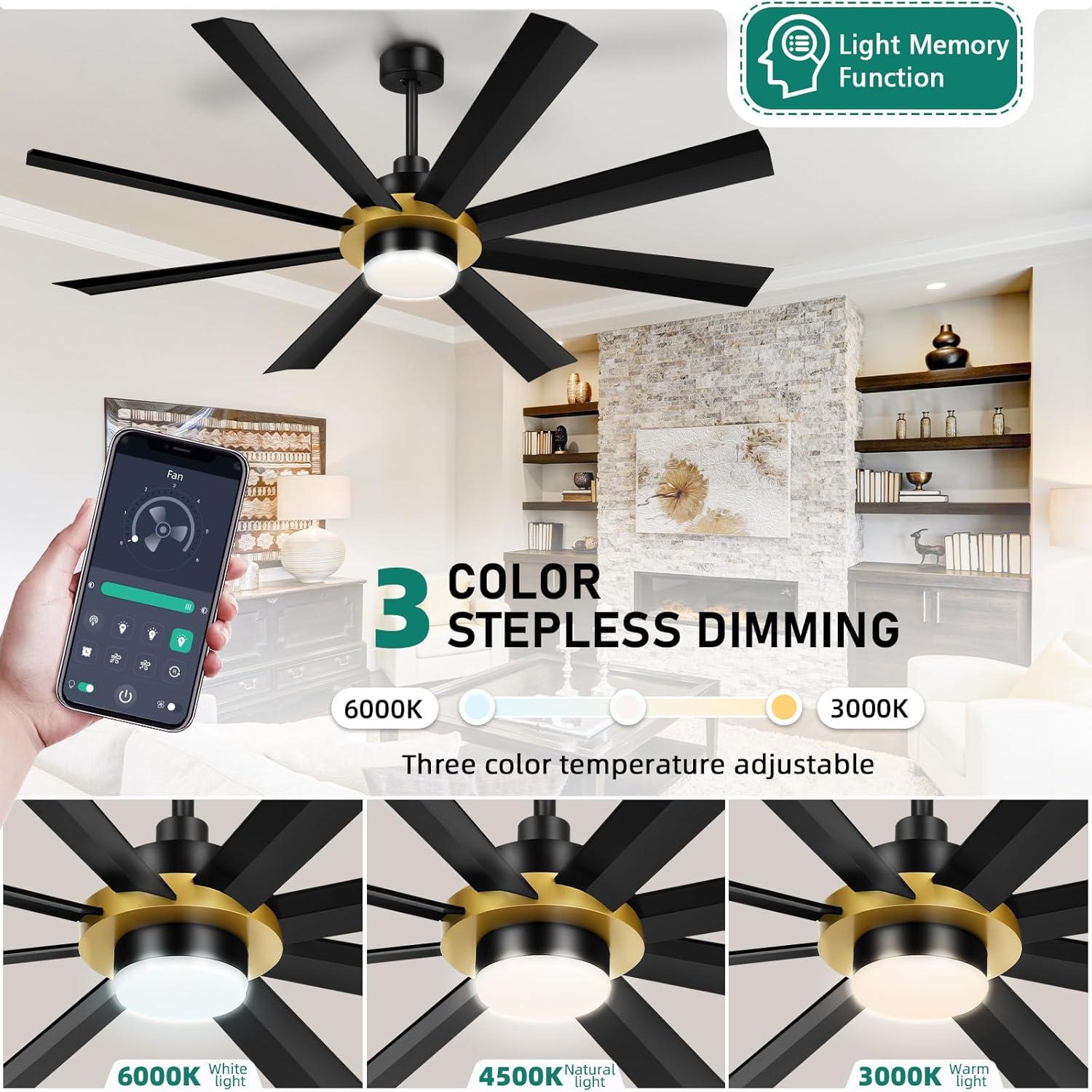 3-Color Changing and Memory Function: The porch ceiling fan is equipped with an integrated LED light that supports 3000K warm white, 4500K natural, and 6000K cool white light options. Adjustable brightness and a smart memory function of the ceiling fans that recalls your last setting, providing a personalized lighting experience