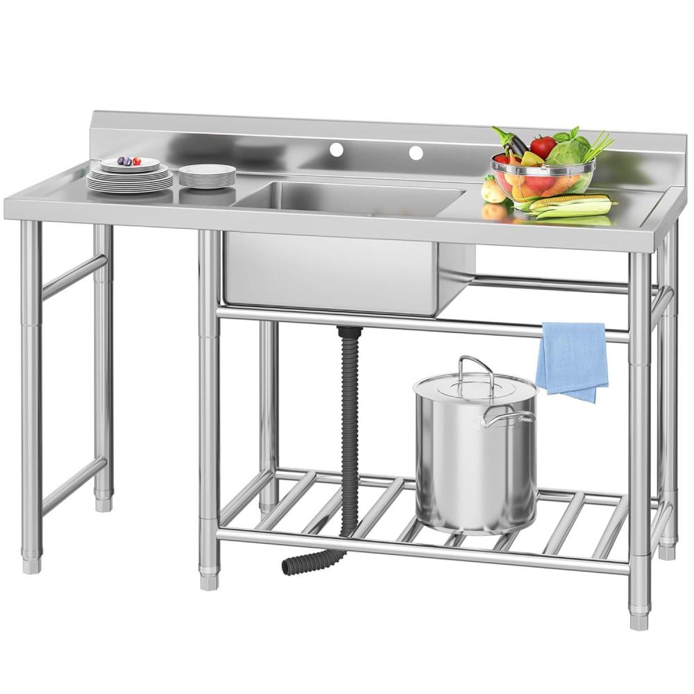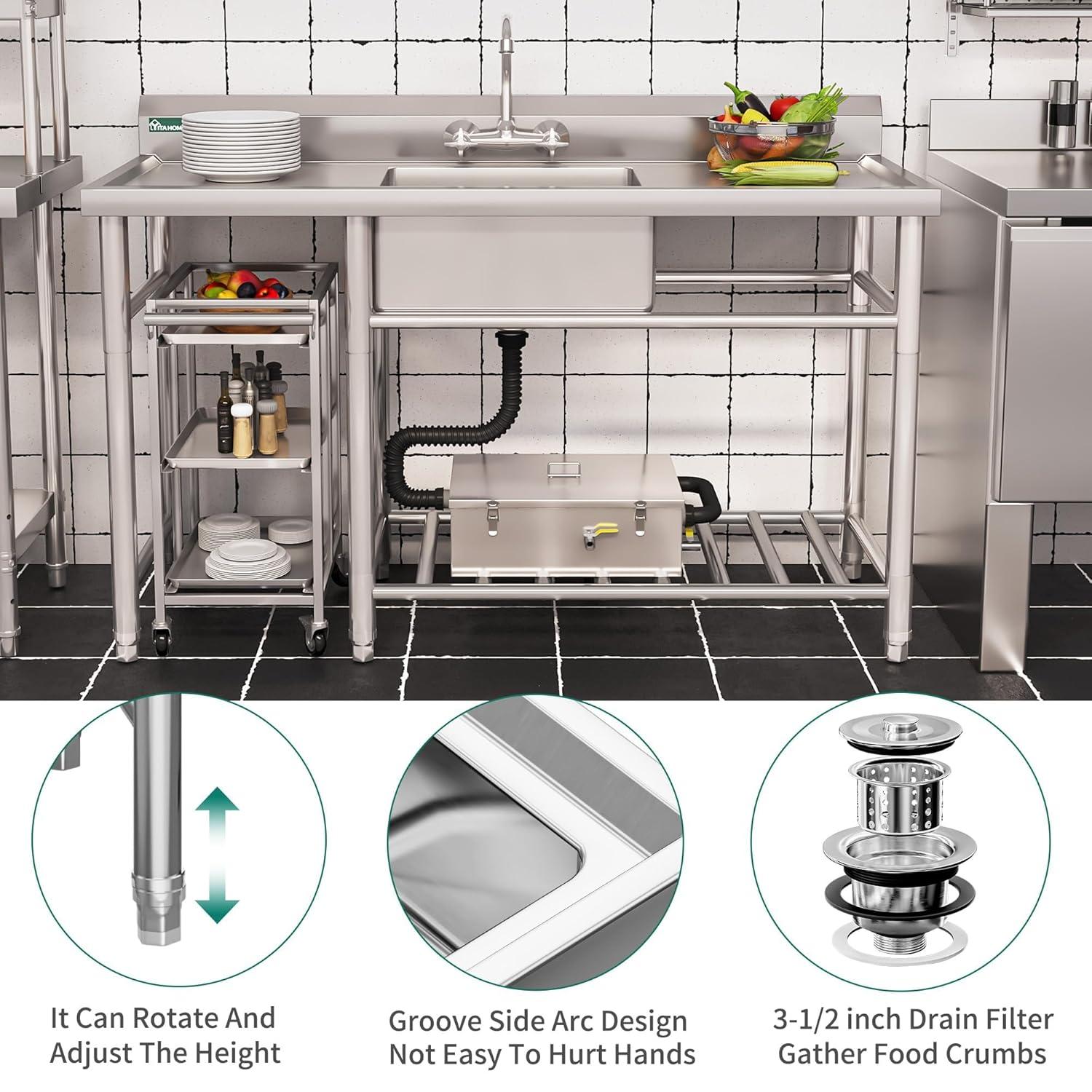 3 Bowl Prep & Utility Station: Transform your kitchen operations! the overall size is 59.8″x18.7″x32.7″ , bowl size – 14″ x 10″ , 9.8″ depth; allow for multi-tasking, wash, rinse, and sanitize simultaneously. The double drainboards provide ample space for air-drying dishes or preparing food.