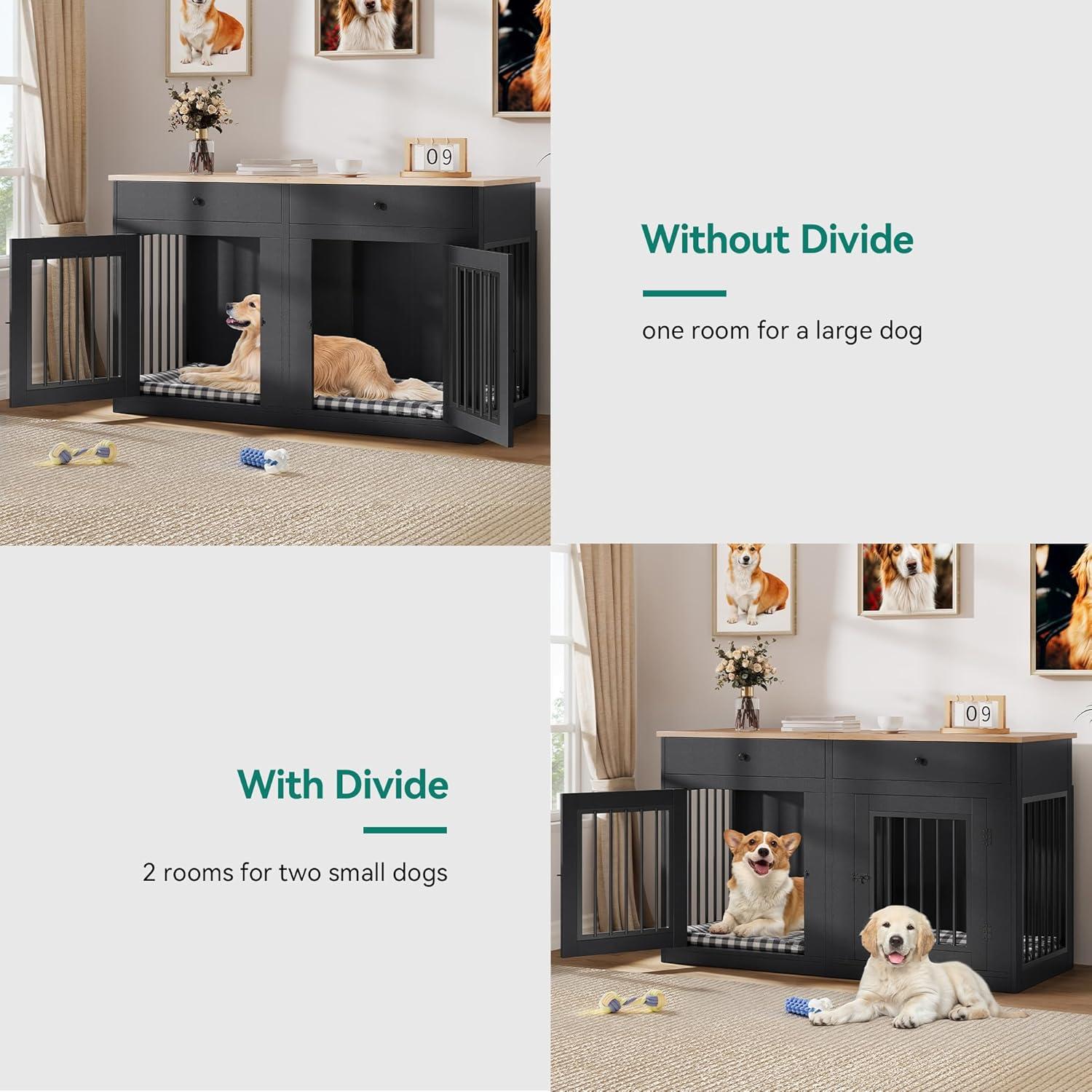Tailored Comfort: A spacious dual-chamber dog crate with a removable divider, ideal for multi-pet homes. Let your furry friends enjoy separate spaces for peaceful retreats, promoting harmony in your household