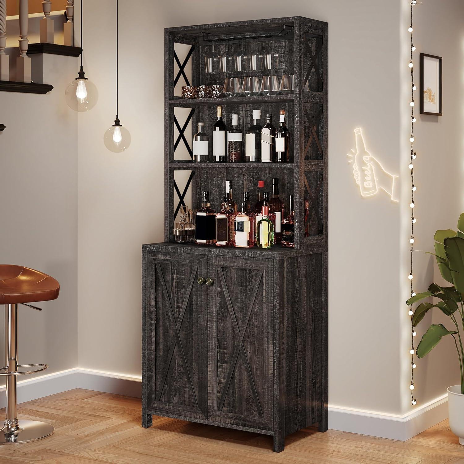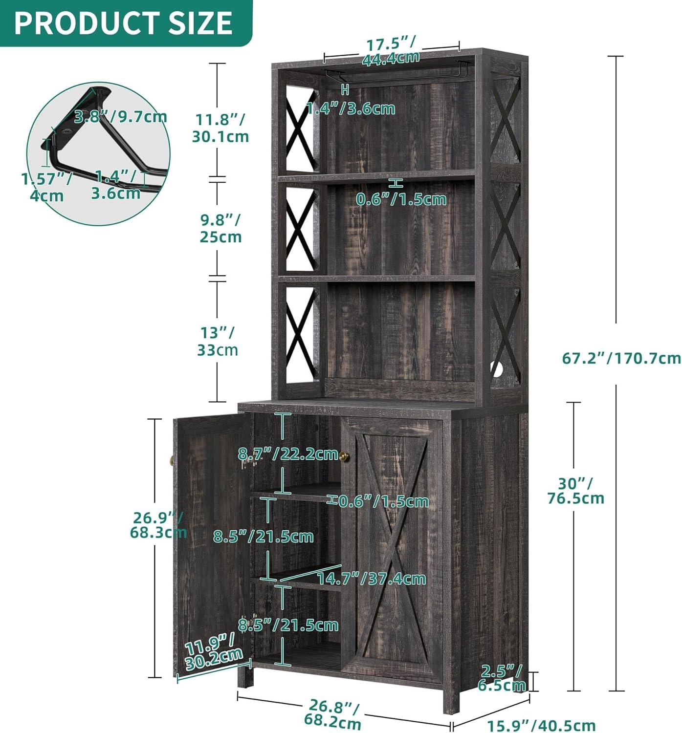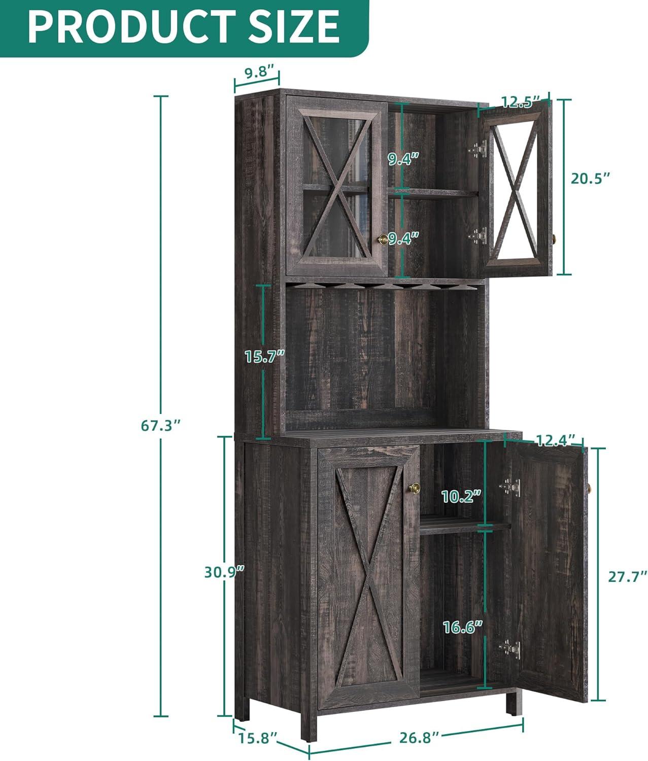 YITAHOME 67″ Tall Wine Bar Cabinet for Liquor and Glasses, Farmhouse Freestanding Coffee Bar Cabinet with Glasses Racks & Storage Shelves W/Glass Doors for Living Dining Room, Hallway, Dark Rustic Oak(Dark Rustic Oak)