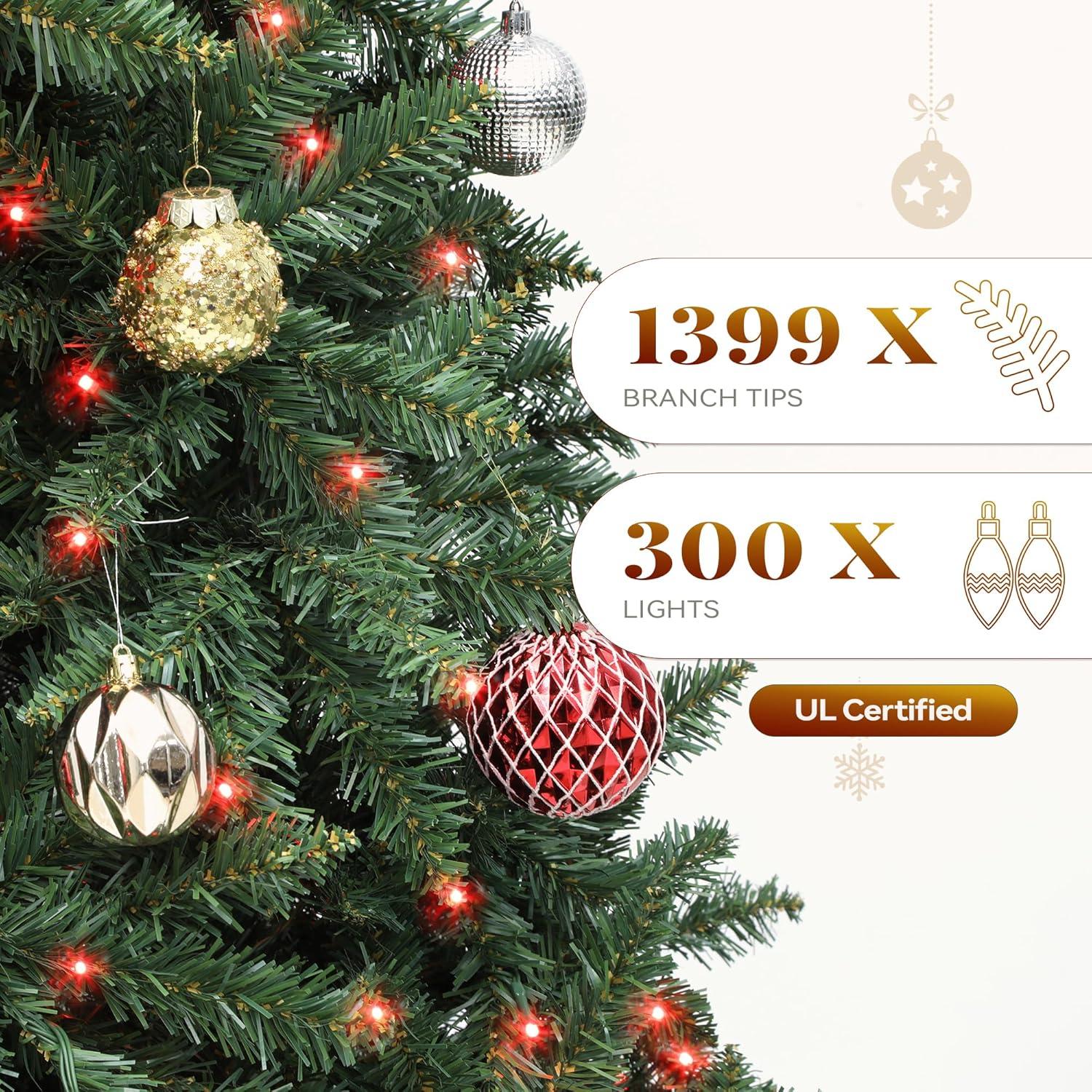 Pre-Lit Design: Our Christmas tree shines bright with 300 pre-strung RGB lights; Offering more than 16 colors ( Single- & Multi-color Changing Lights) and 9 lighting modes for simple operation, it caters to all your lighting needs, creating a warm and joyous atmosphere in every corner