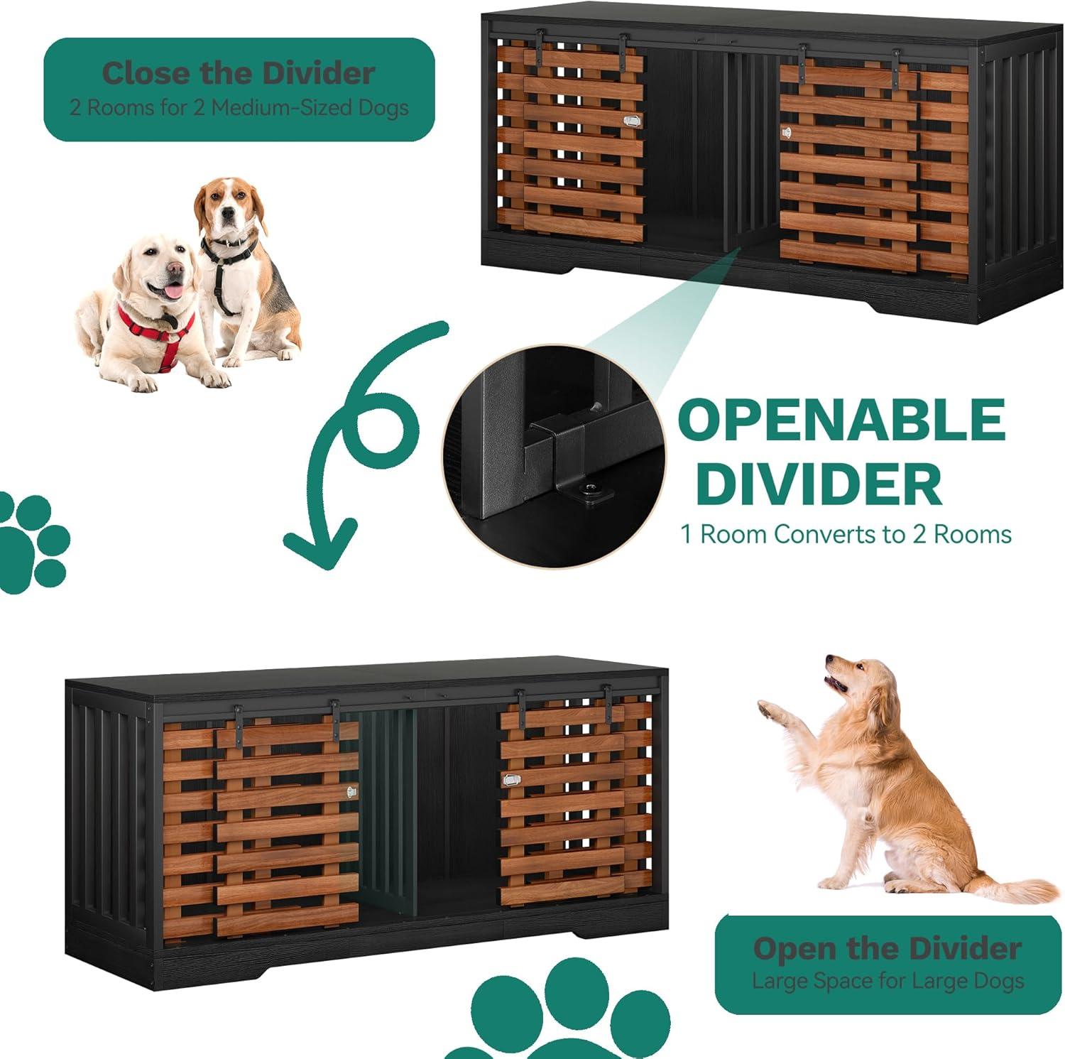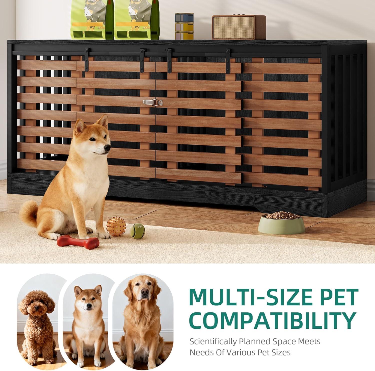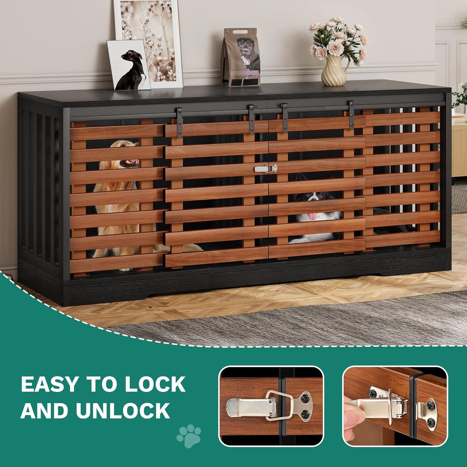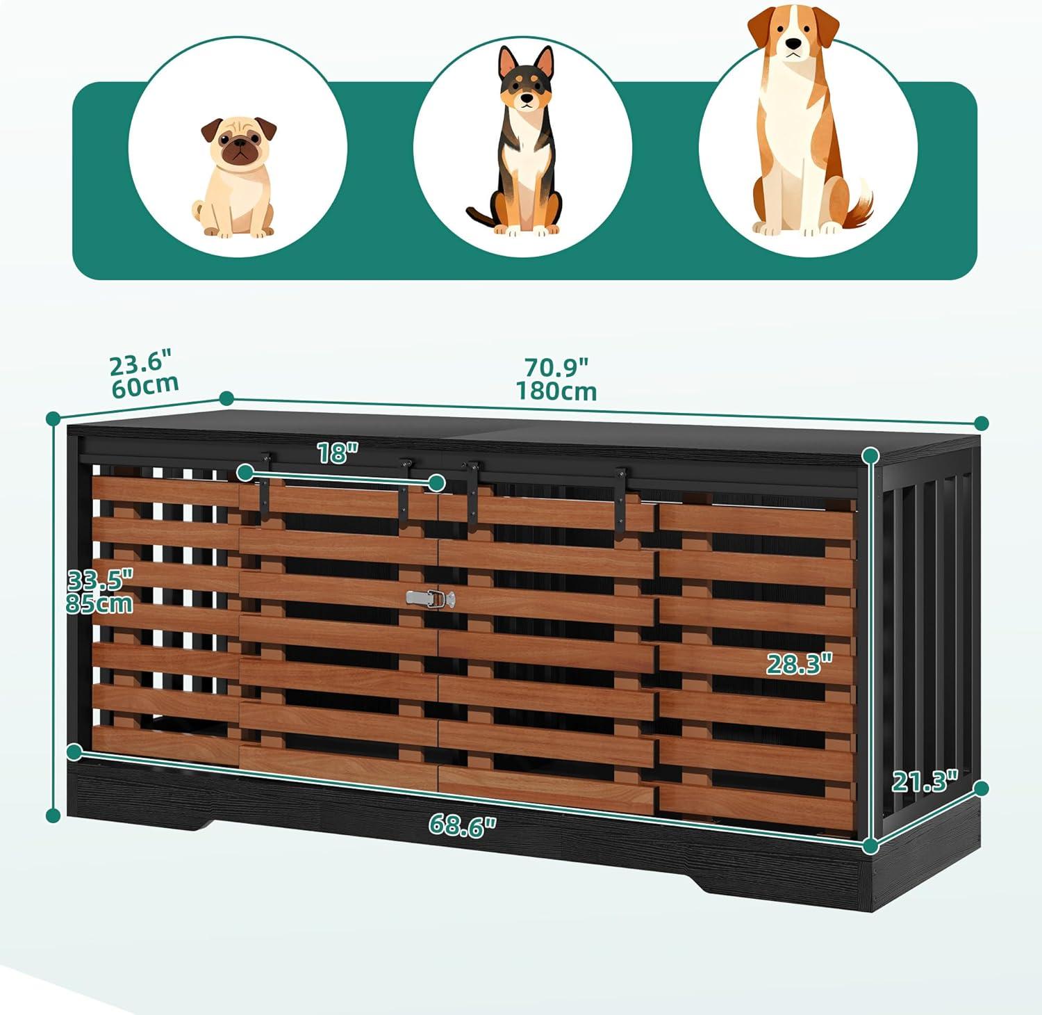 Dog Crate for 2 Dogs: Upgrade your furry friends' comfort. Our spacious dog crate furniture, featuring dimensions of 70.87″L×31.50″Hx23.62″W, easily accommodates medium to large dogs, offering a well-crafted, safe, and cozy space they'll love indoors