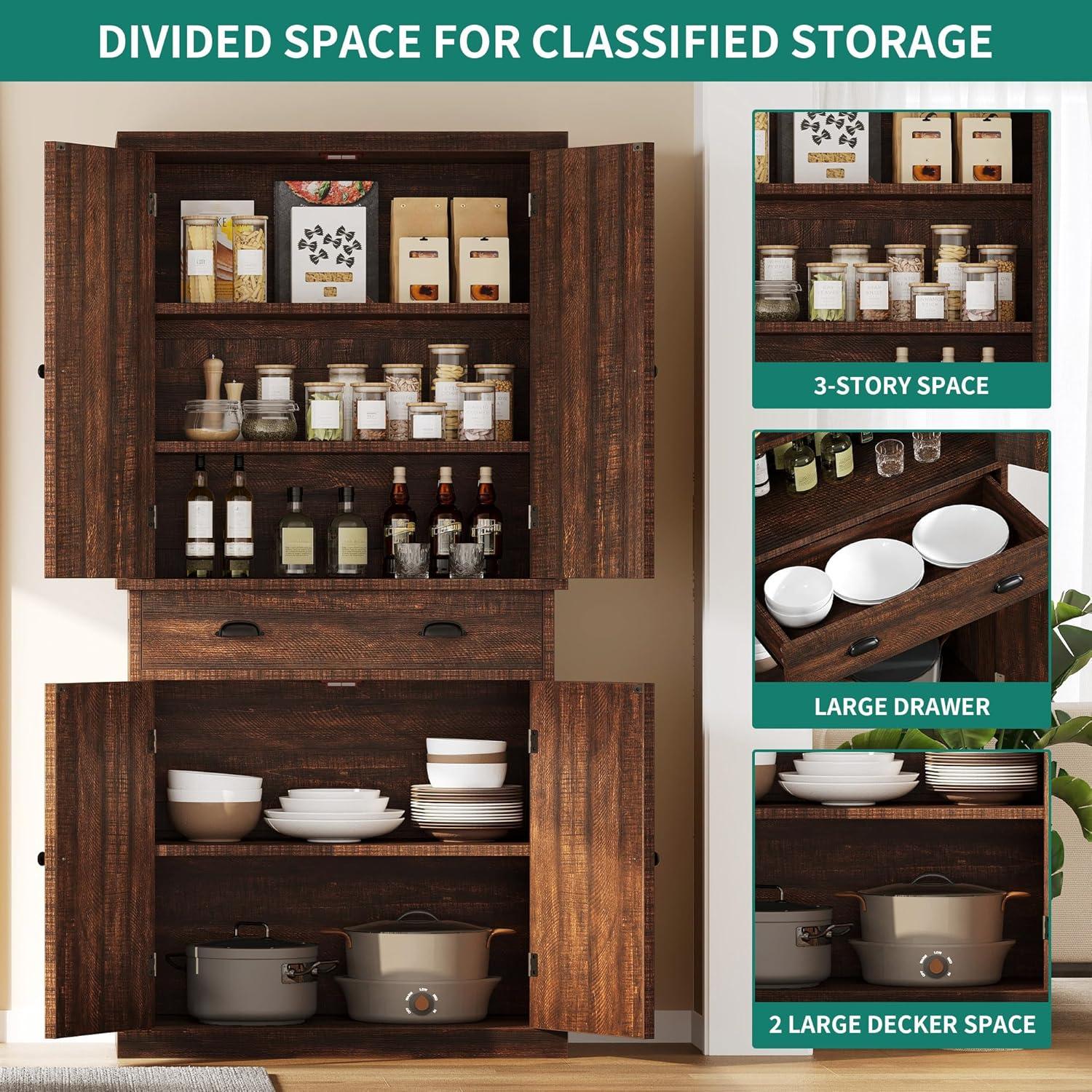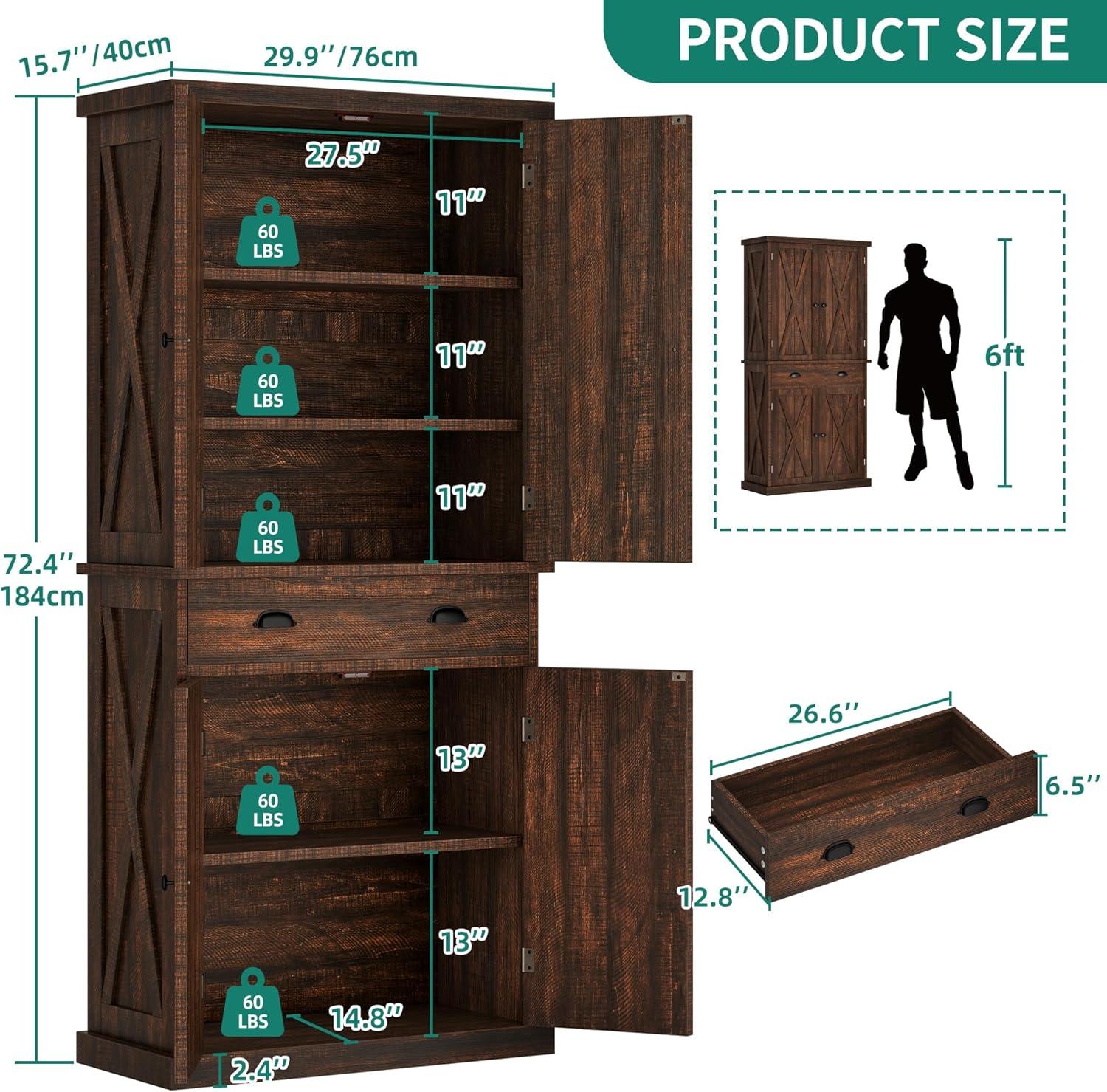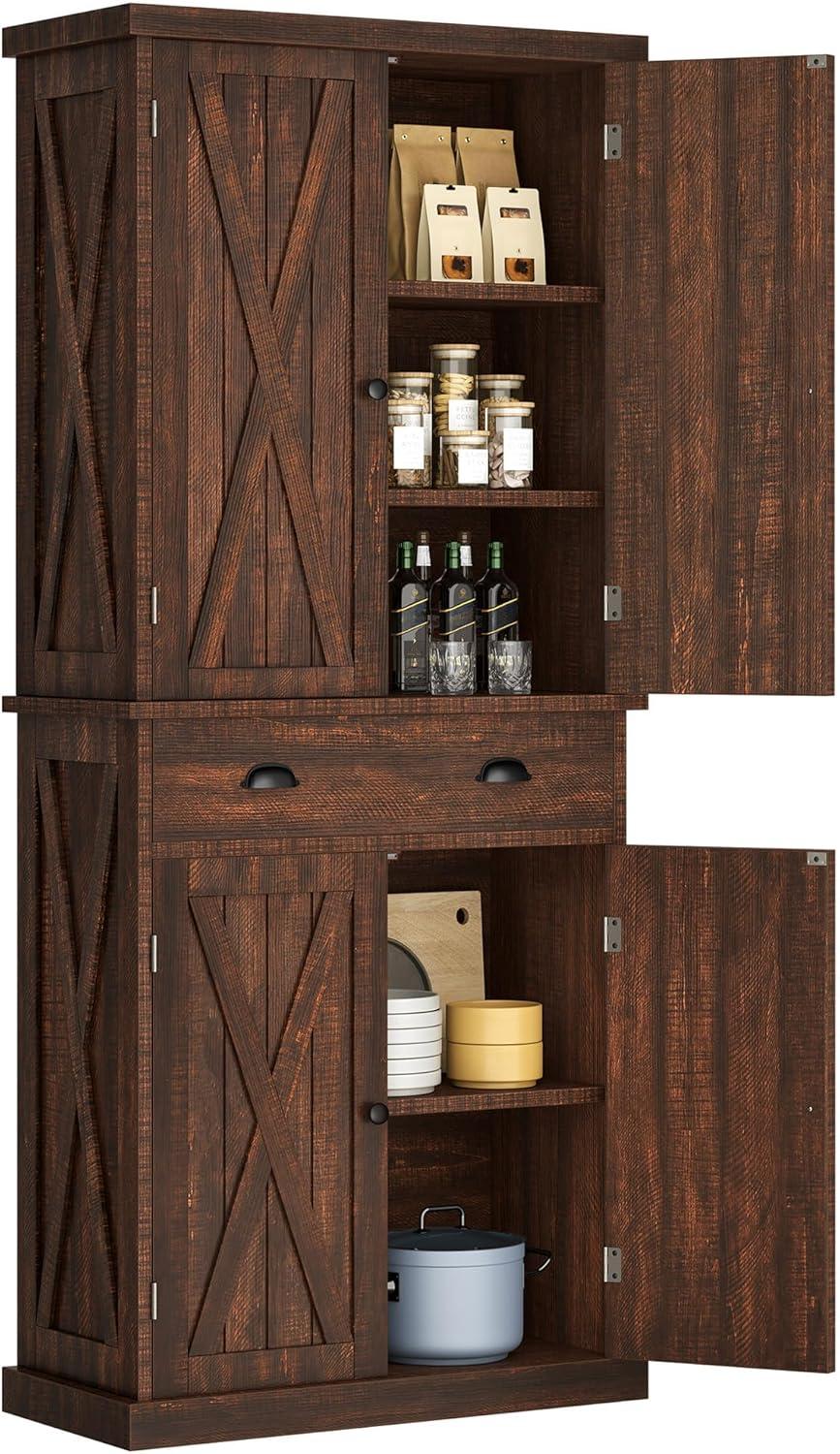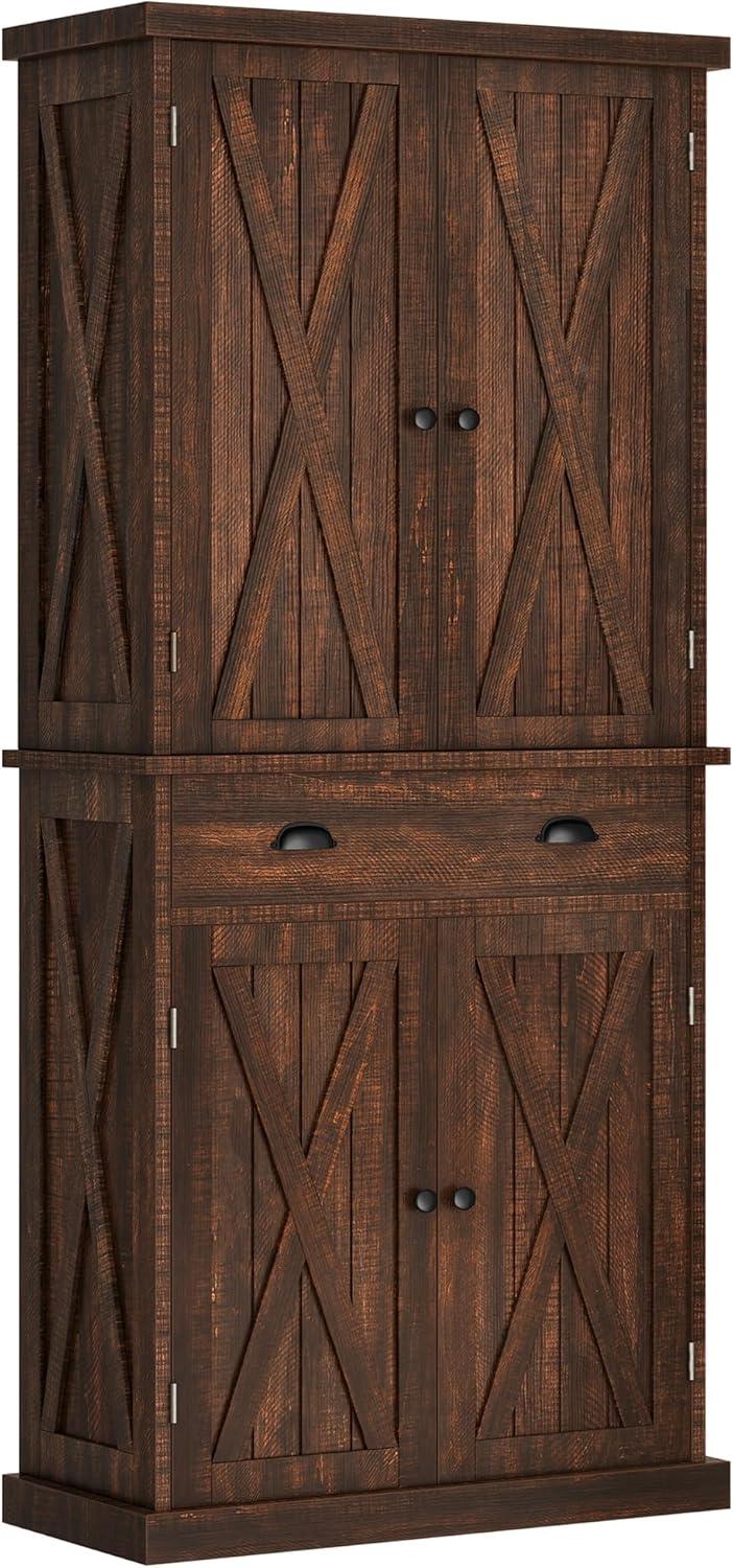 YITAHOME 72'' Tall Kitchen Pantry, Farmhouse Kitchen Storage Cabinets with Barn Doors, Drawer and Adjustable Shelves, Wood Cupboard for Kitchen, Dining Room, Bathroom, White(Dark Rustic)
