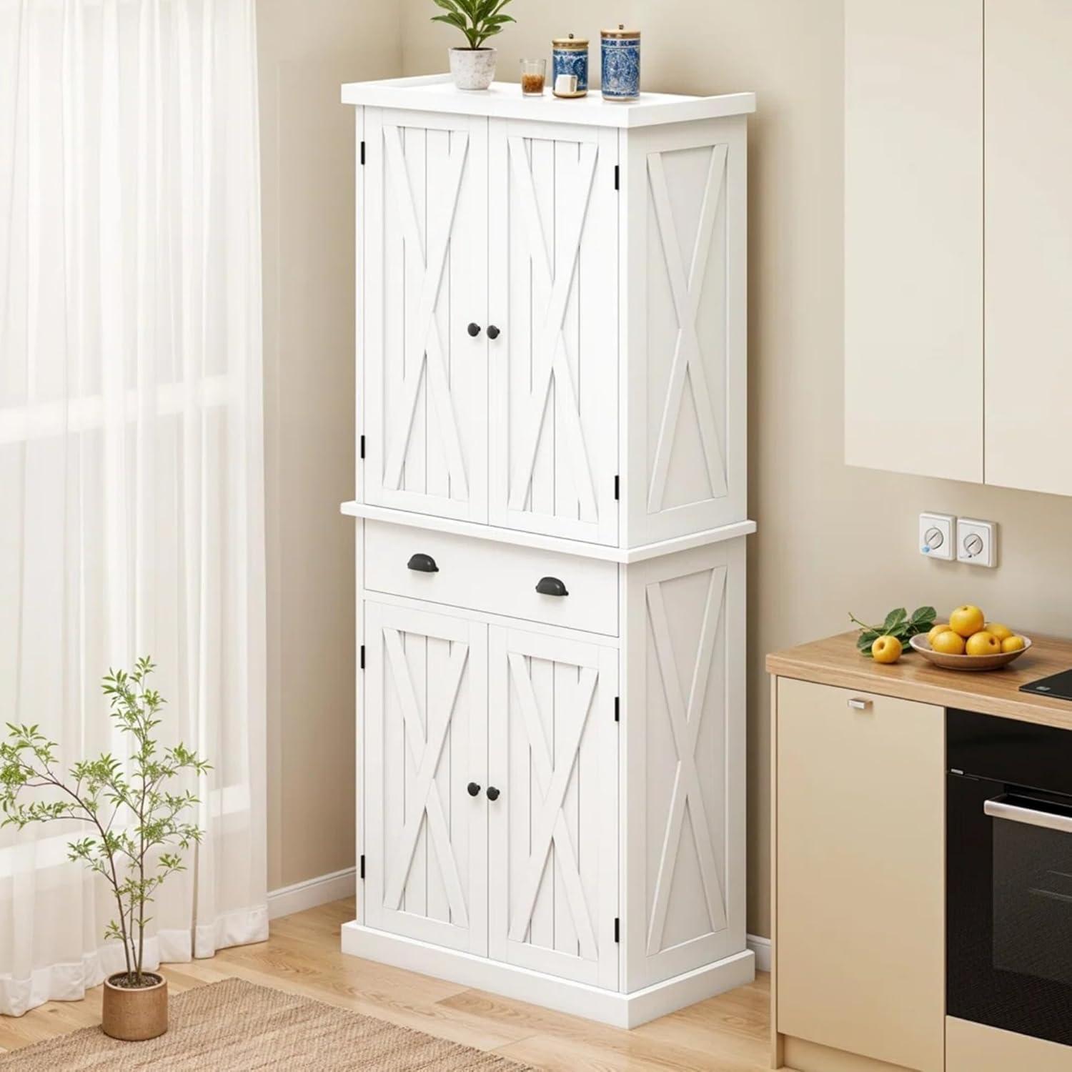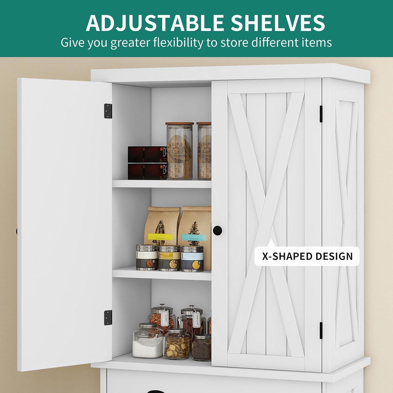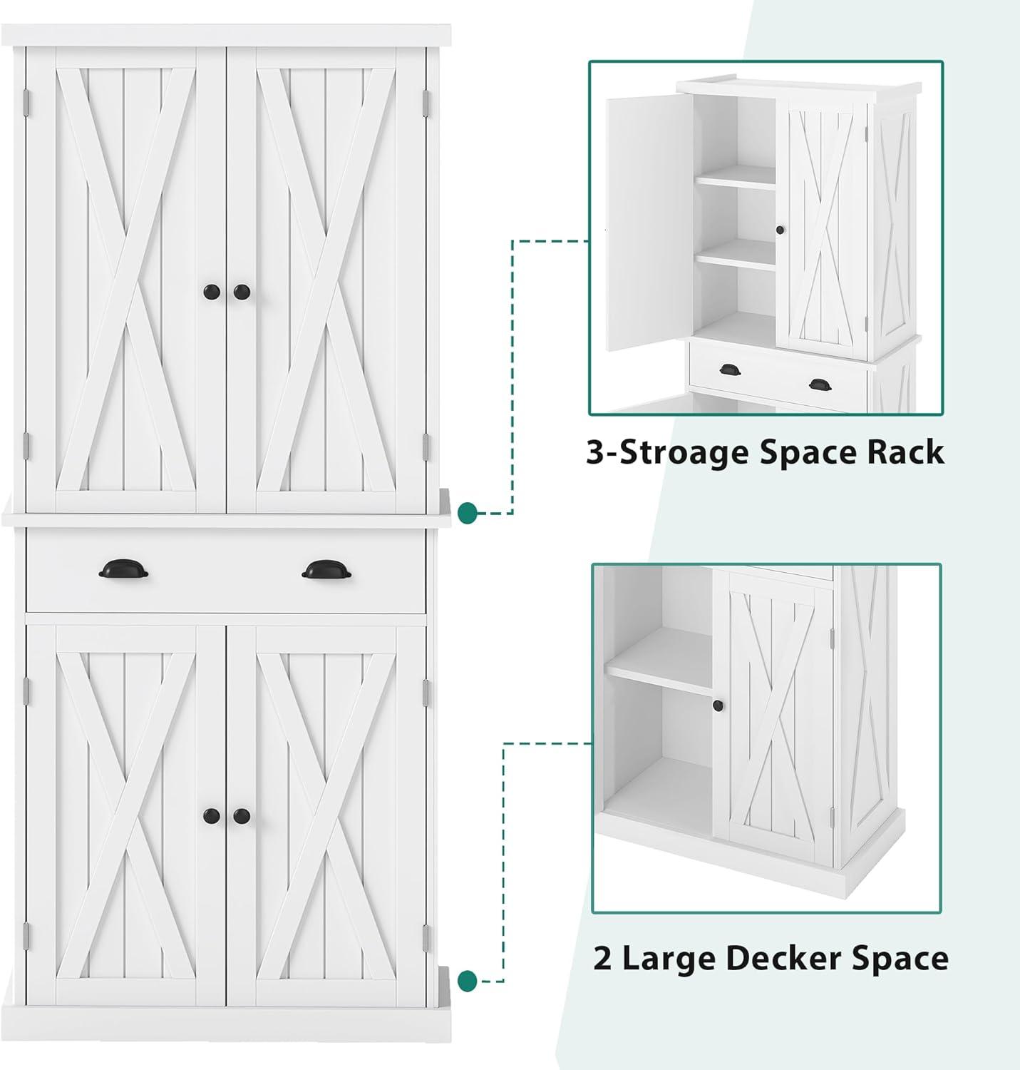 Multipurpose Pantry Cabinet: Adorned with barn doors and enriched by distressed off-white finish, the cabinet emanates a timeless appeal. Our pantry storage cabinet with an X-shaped barn door design, antique metal handles and exquisite wood grain, make it adds rich farmhouse style, suitable for for kitchen, living room, hallway or dining room etc.