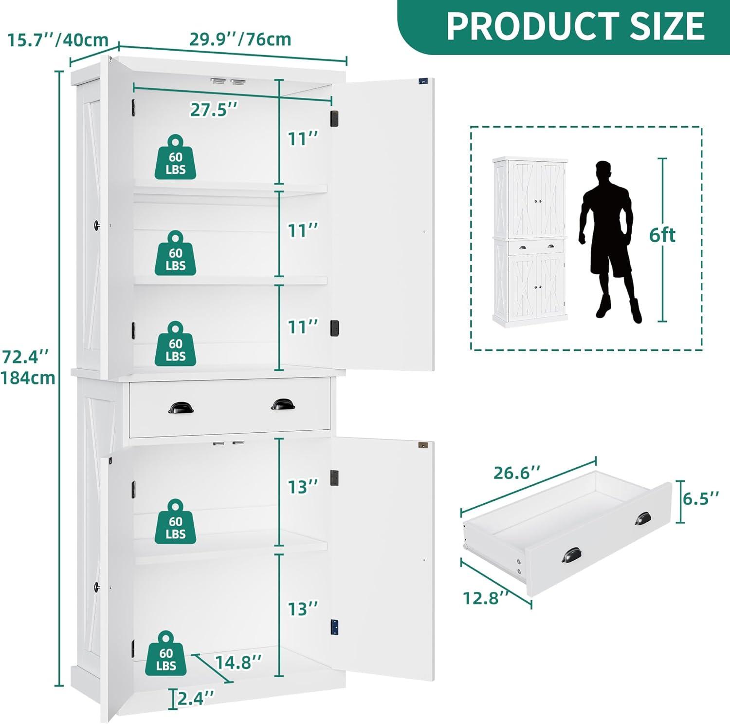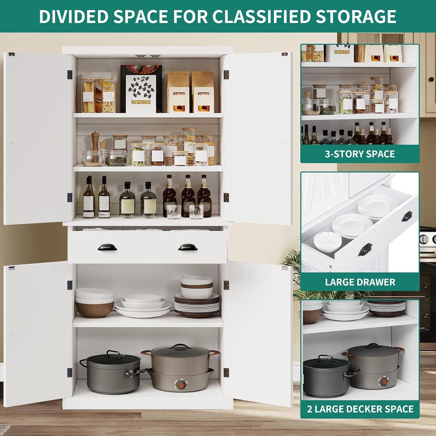 Extra Large Storage Space: Unleash the potential of your space with our storage cabinent, generously sized at 30″W × 16″D × 72″H. The kitchen cabinet has 5-tier shelves and 1 large drawer, gives you plenty of room for dishes, pots and canned food, dry goods or plastic containers, while the central drawer allow you to put away napkins, towels and silverware. Keep organized behind the four doors, so your items stay safe and dust-free.