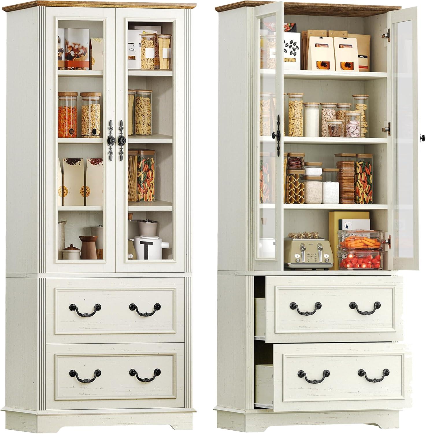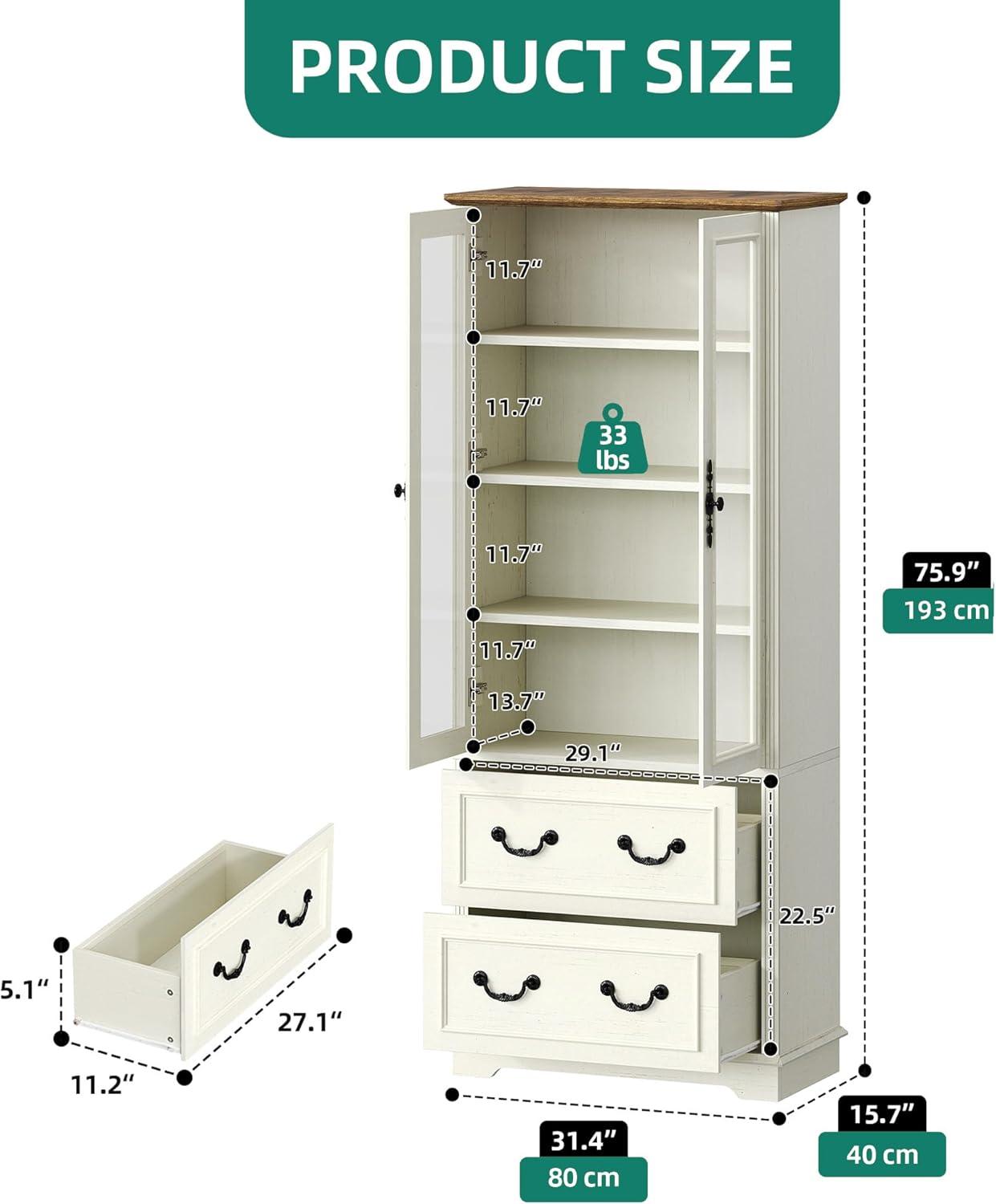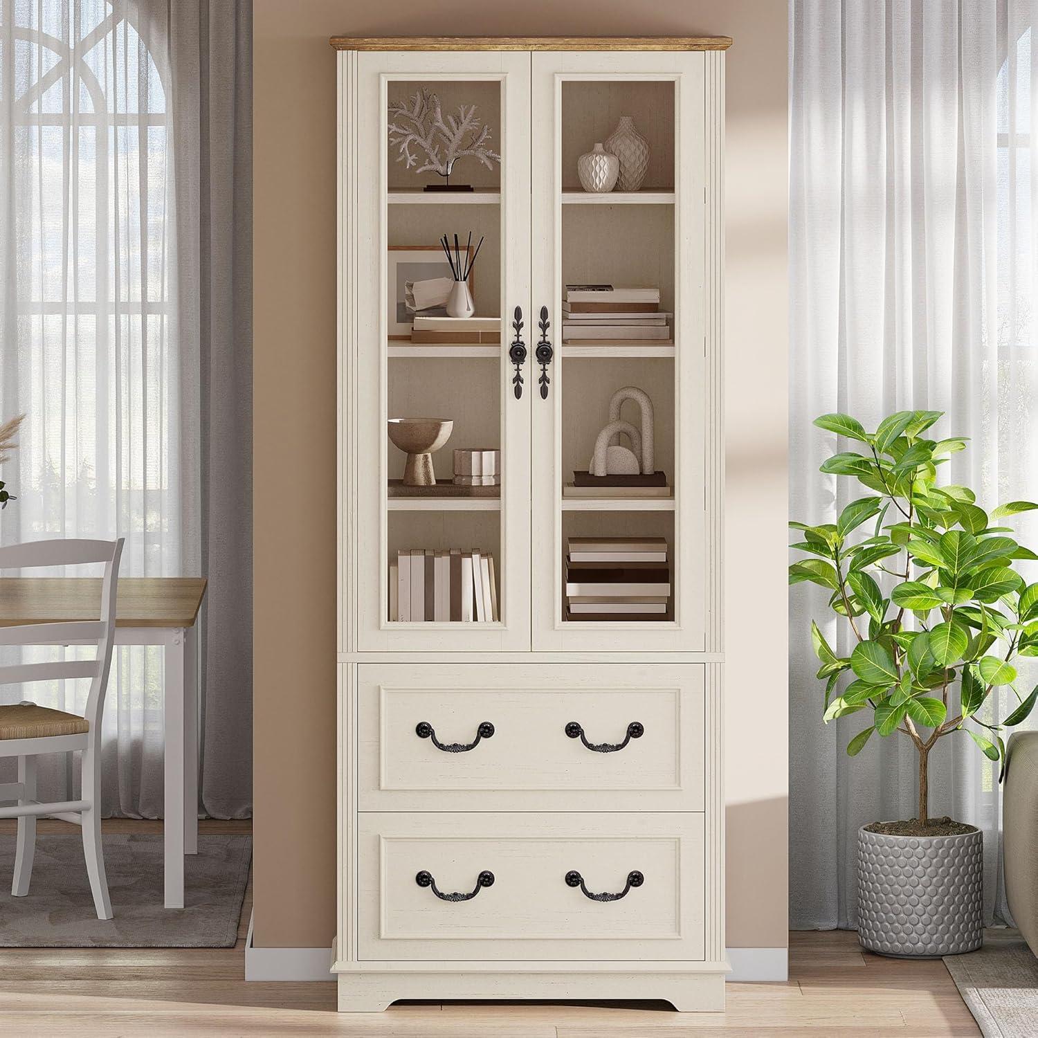 YITAHOME 76'' Kitchen Pantry Cabinet with 2 Drawers, Tall Storage Cabinet with Glass Doors & Adjustable Shelves, Freestanding Display Curio Cabinet for Collectibles, Living Room, Off-White(White Walnut)
