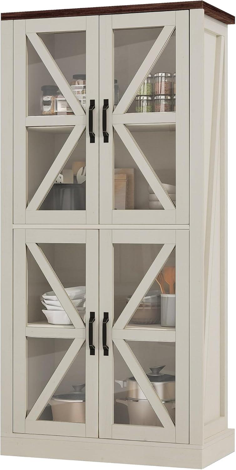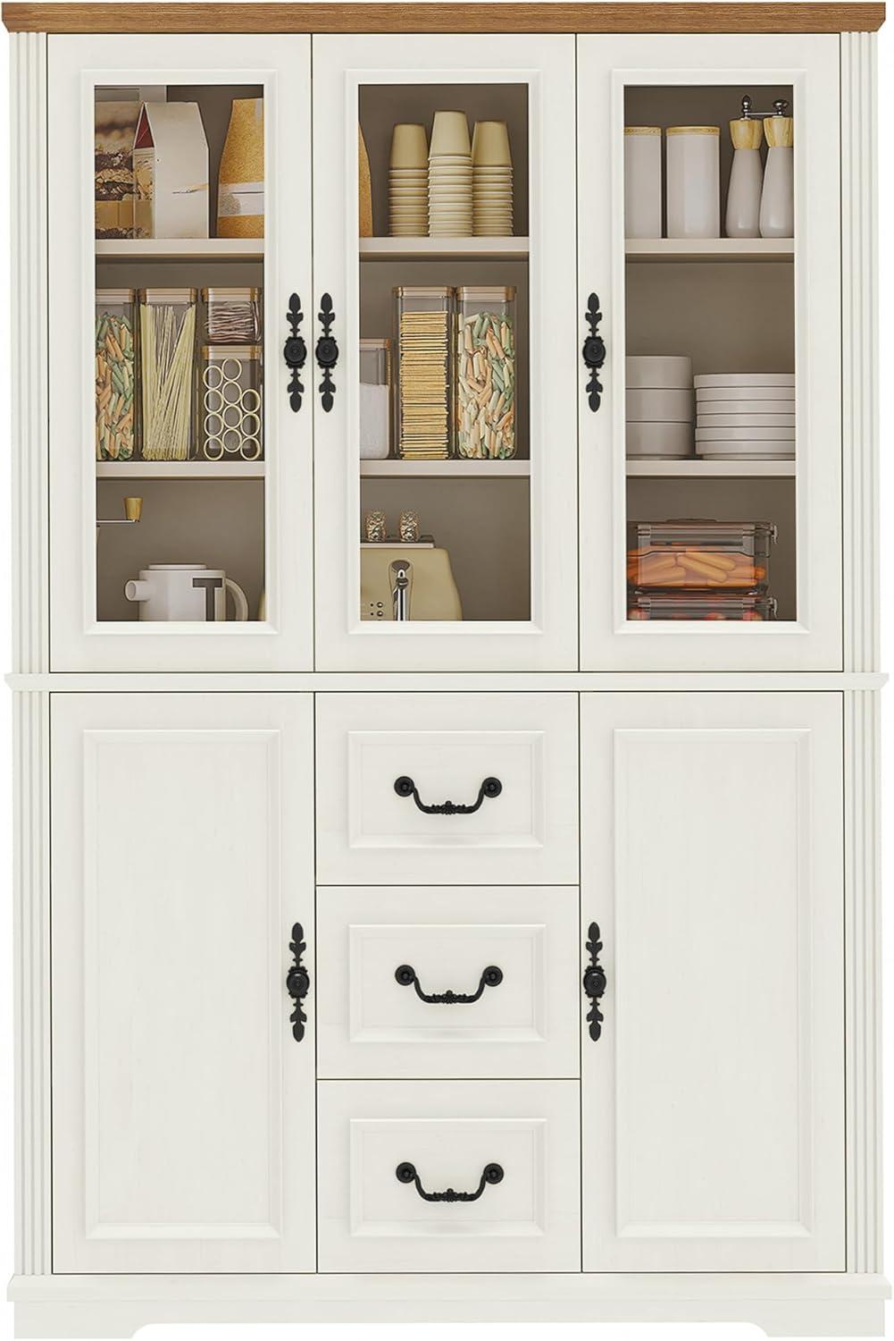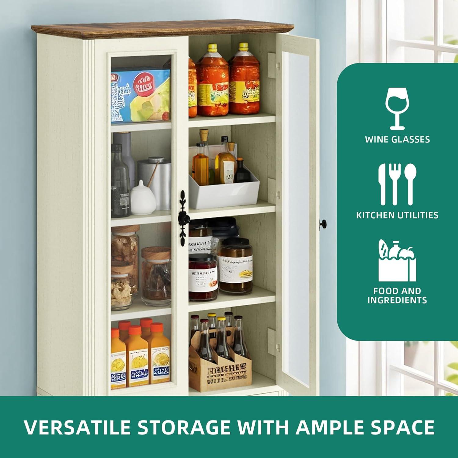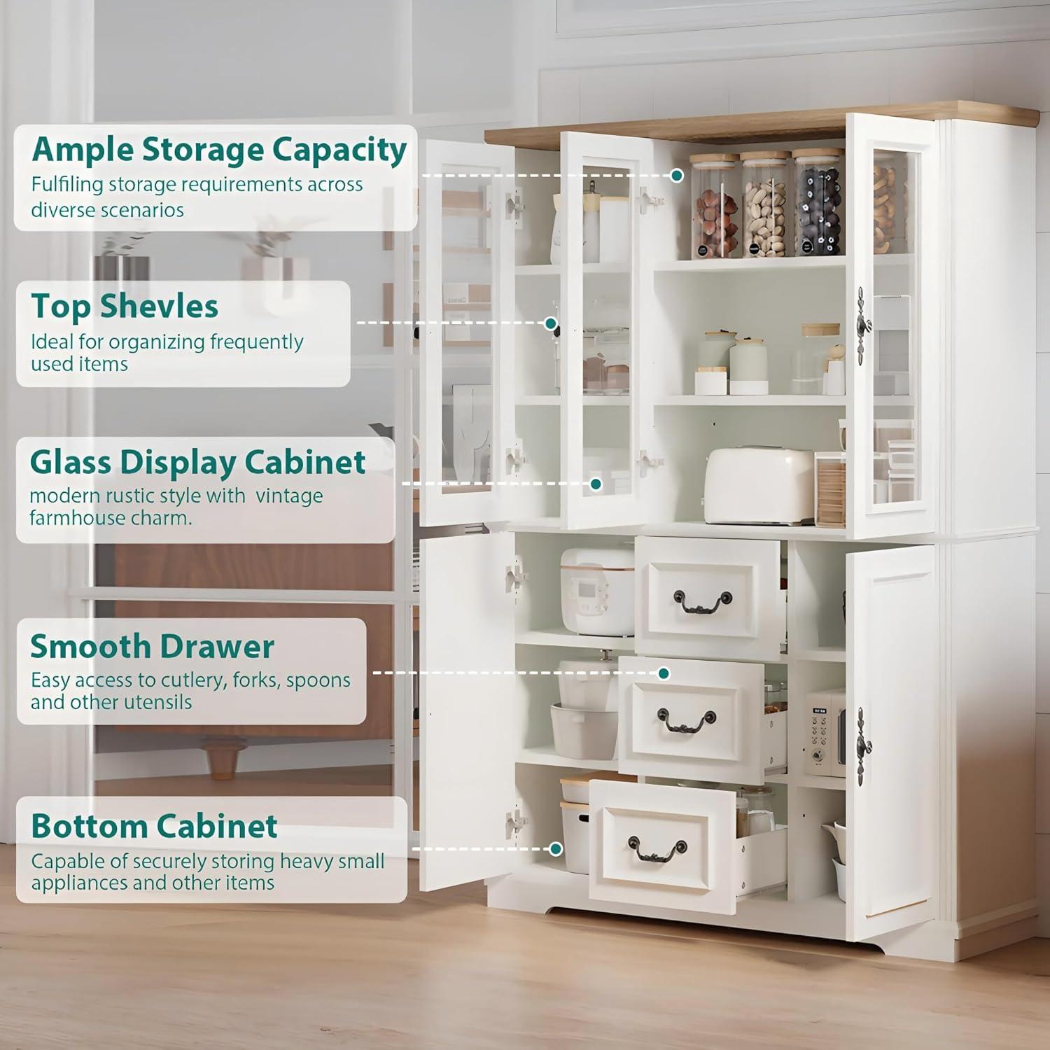 Farmhouse Appeal & Versatile Functionality: It features rustic vintage handles, textured details, and glass doors for a warm farmhouse look. Glass doors bring a modern touch, allowing you to spot items instantly while enhancing your kitchen's aesthetic