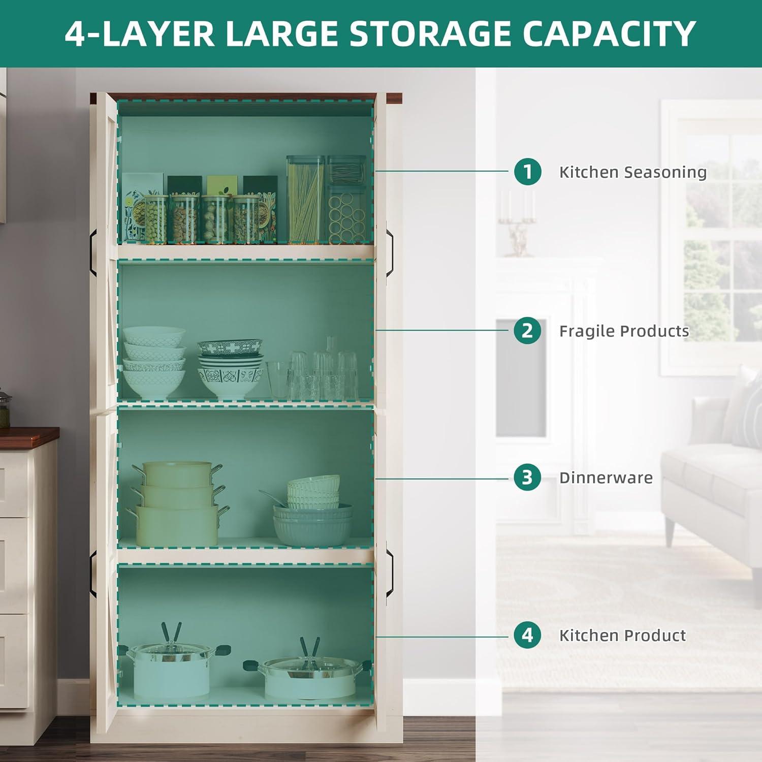 Ample & Customizable Storage: Measuring 76″ x 31.5″ x 15.7″, provides sufficient space for pantry staples, cookware, tall jars, and large pots.Offers four shelves and two large drawers, along with two adjustable shelves. You can easily tailor the storage to meet your ever-changing needs.