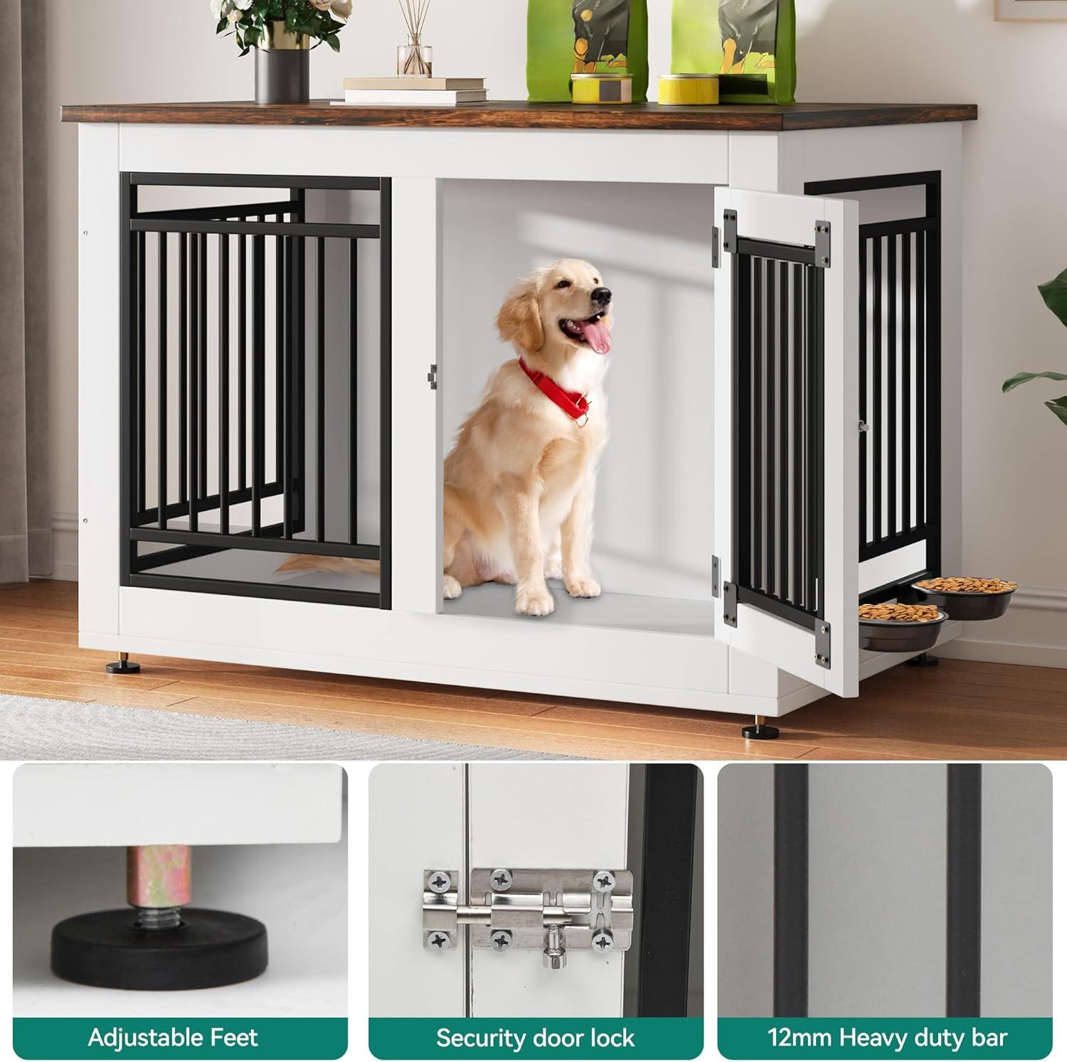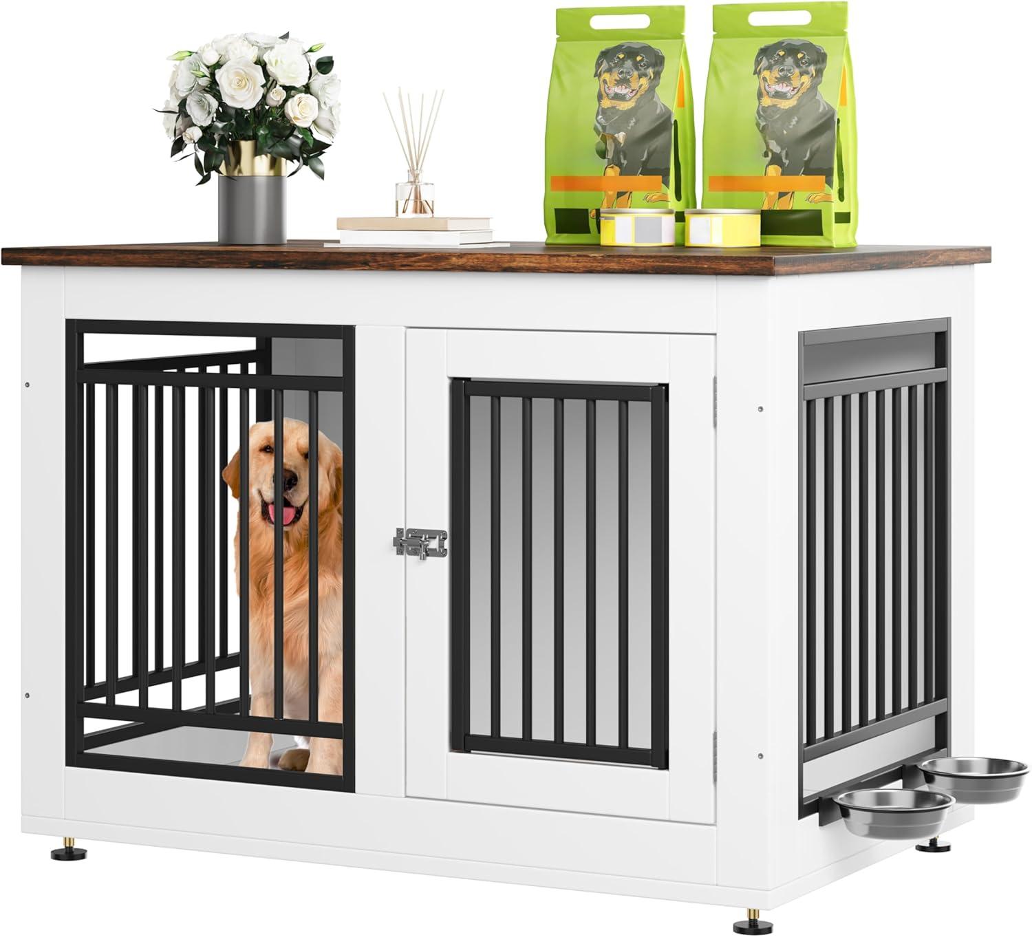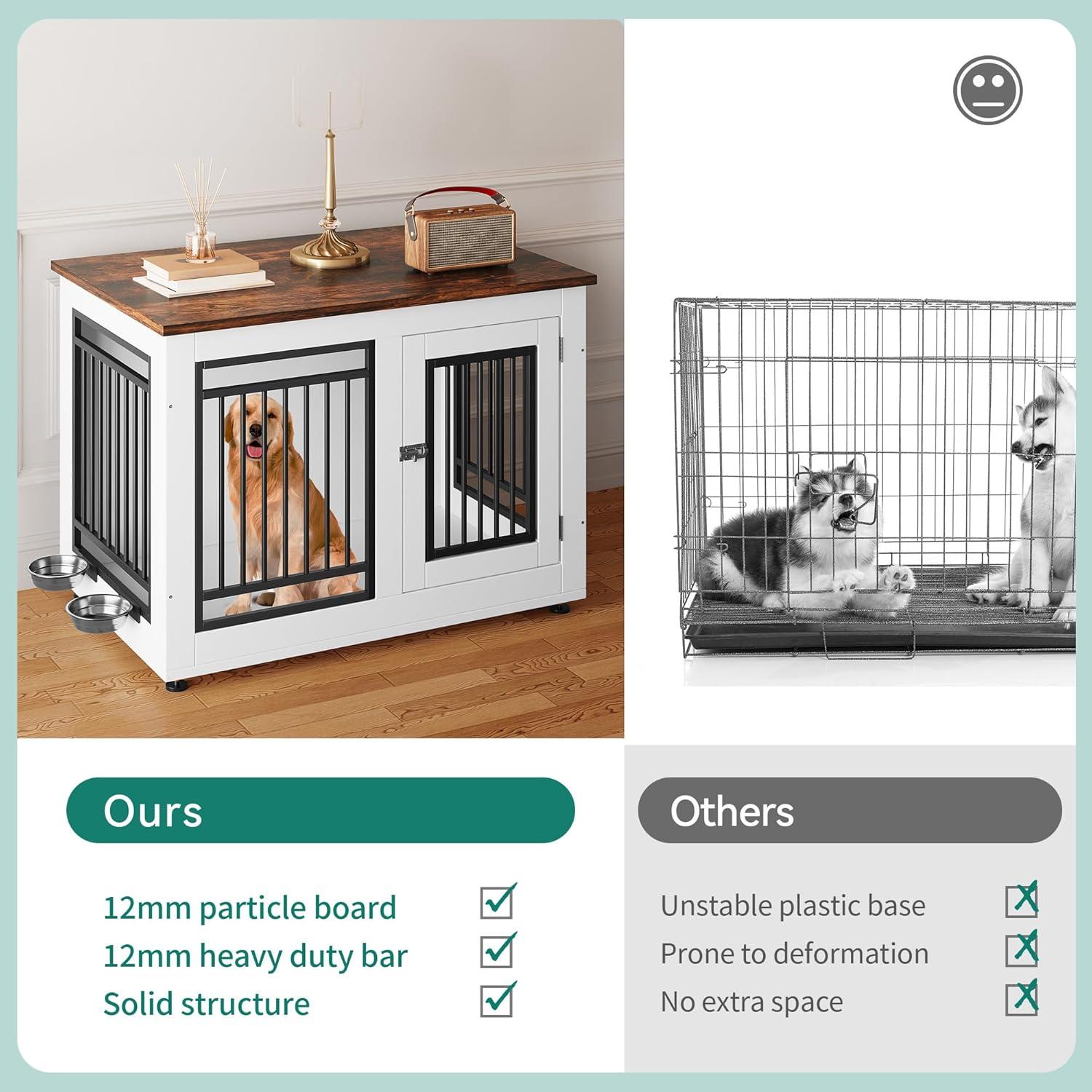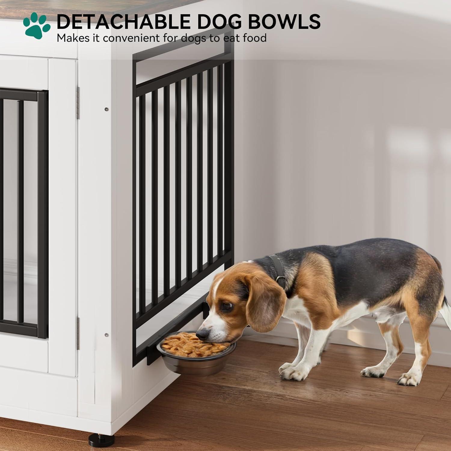 Decorative Dog Crate with Bowls: This large dog kennel is equipped with 2 360° rotatable stainless steel bowls, providing a comfortable resting space for your pet, the dog kennel can also be used as a TV stand and side table to save space. The color scheme is ideal for modern furniture and the spacious desktop provides additional storage space for pet supplies