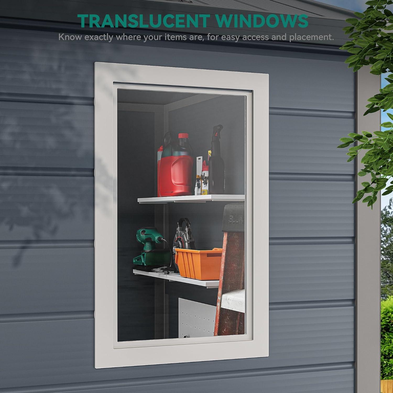 Ventilated and Clear: This outdoor storage shed includes a secure entrance to deter theft and damage; Its translucent side windows invite natural light, while louvered vents encourage airflow and deter water accumulation; The sloped roof assists in drainage, prolonging the shed's longevity
