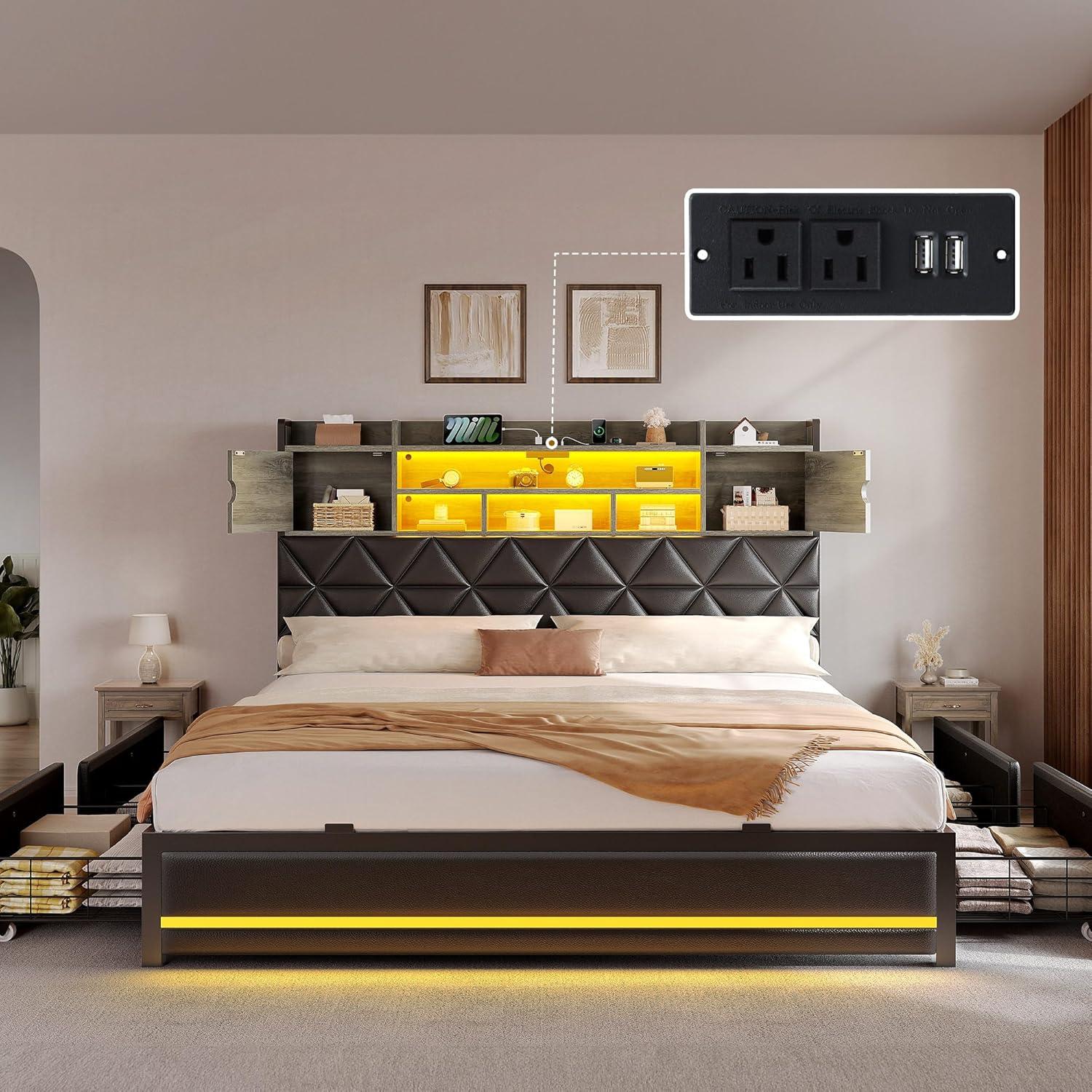 RGB LED LIGHT BED FRAME – This bookcase bed frame is equipped with RGB LED light , can be controlled by remote control or mobile app, more than 60,000 colors can be selected. You can freely set the brightness, color, mode and timing functions.