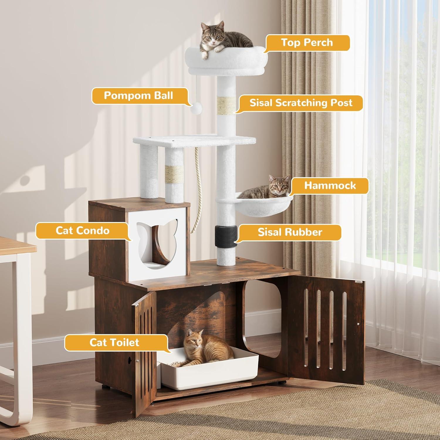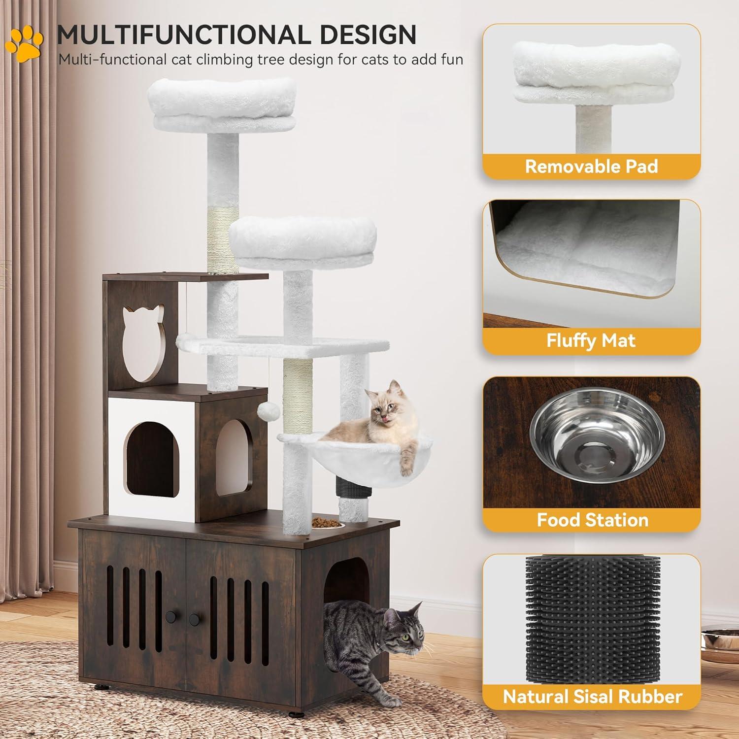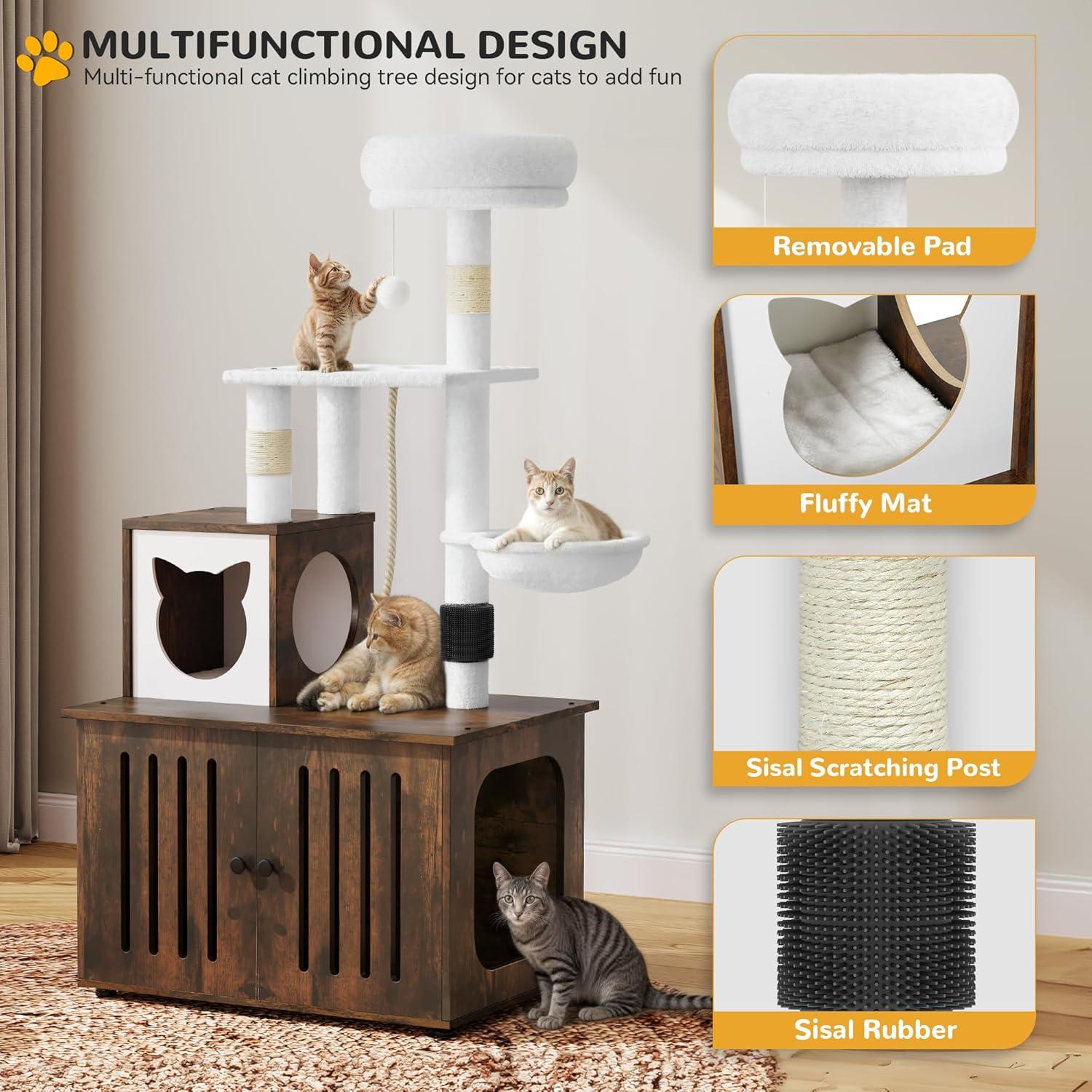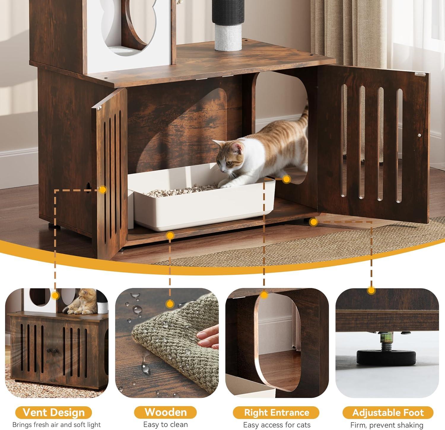 2-in-1 Cat Furniture: This innovative cat tree comes with a hidden litter box to achieve a multifunctional space that caters to all your feline companion's needs; It serves as a designated area for your cat to the washroom, relax, sleep and have meals conveniently.