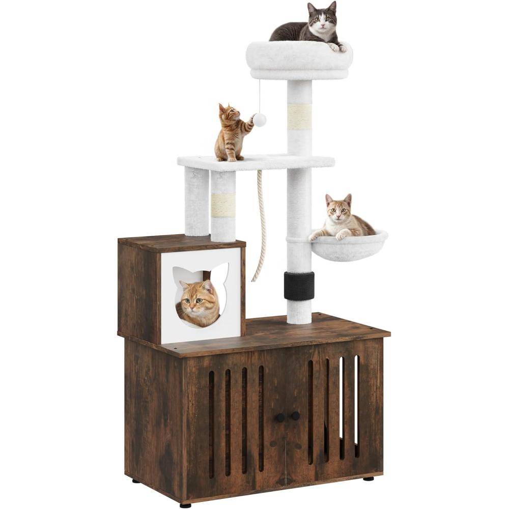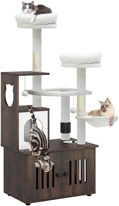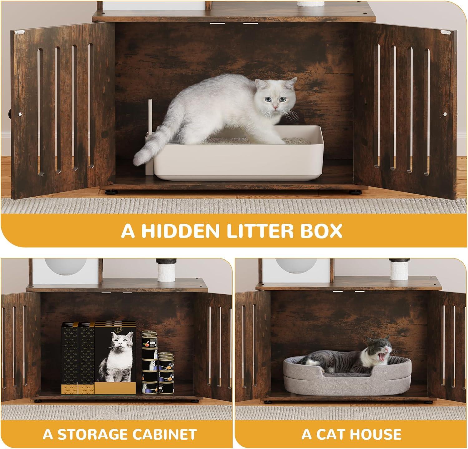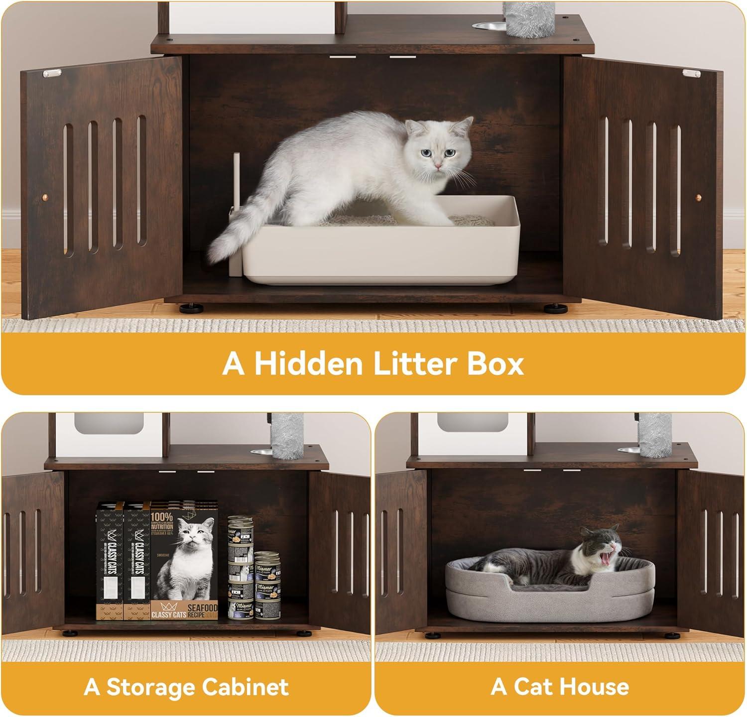 2-in-1 Cat Furniture: This innovative cat tree comes with a hidden litter box to achieve a multifunctional space that caters to all your feline companion's needs; It serves as a designated area for your cat to the washroom, relax, sleep and have meals conveniently.