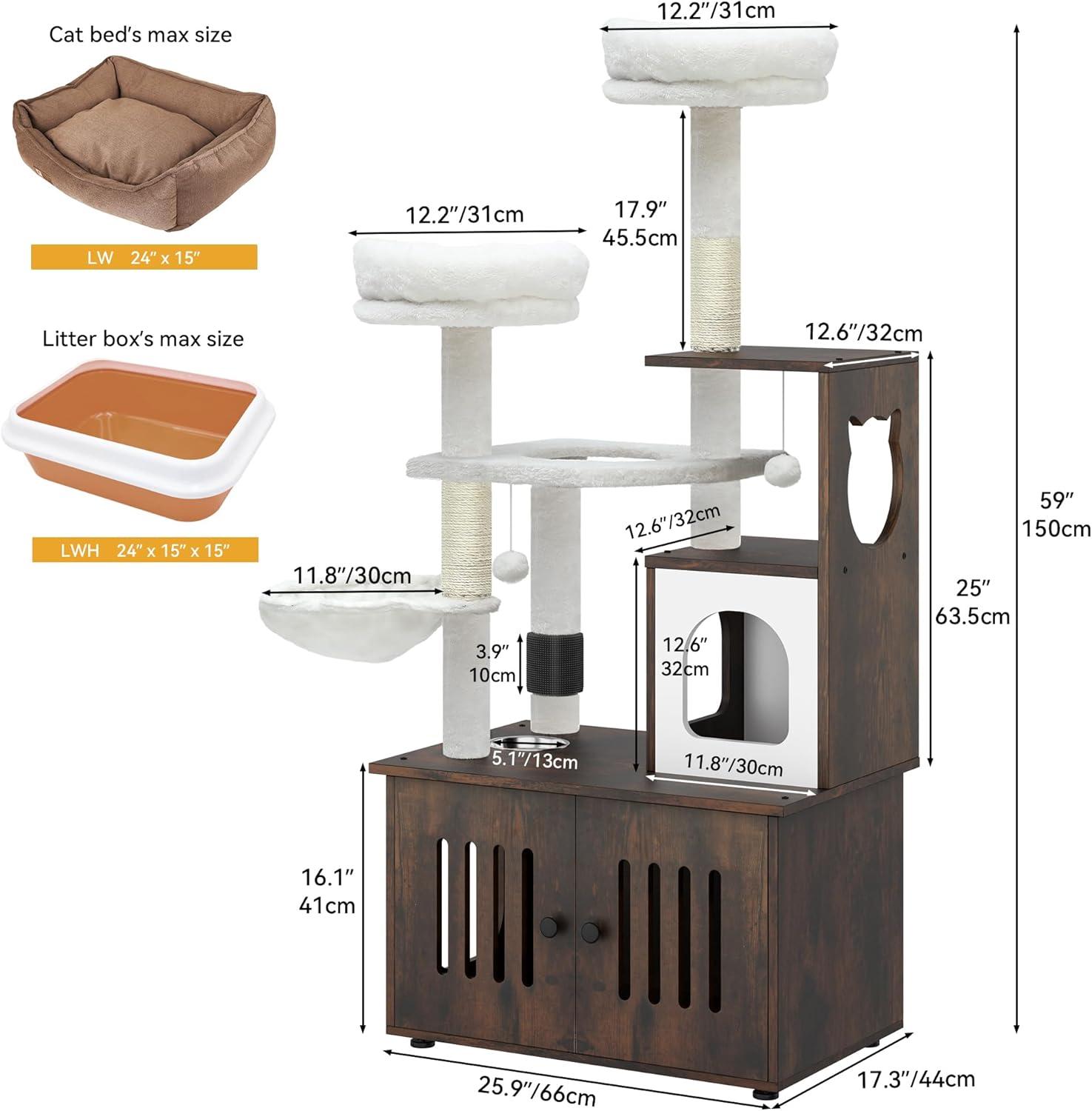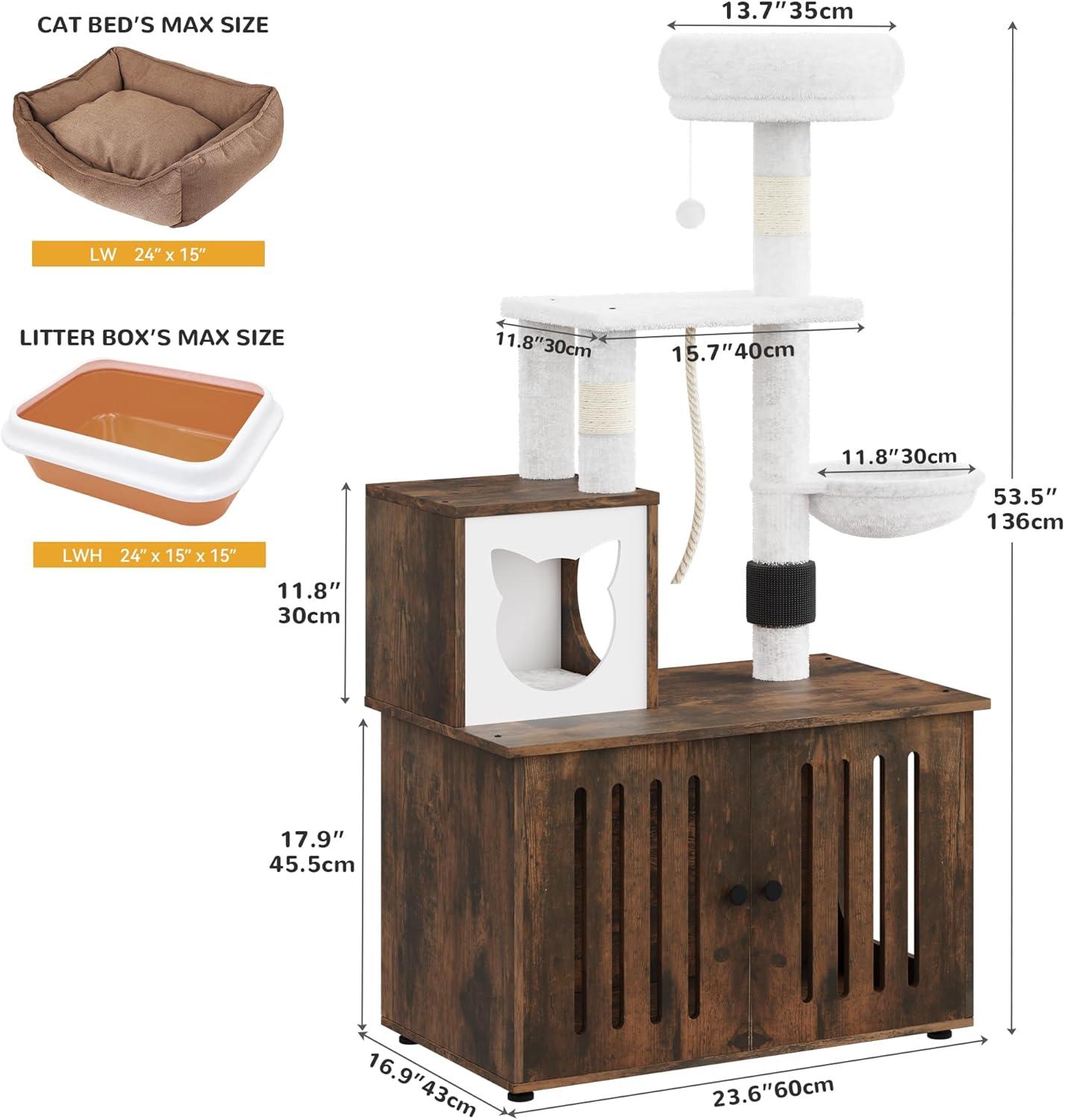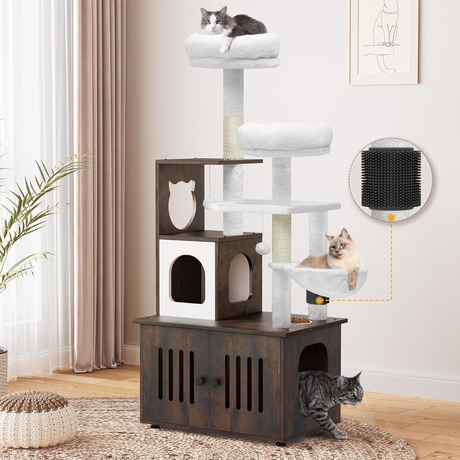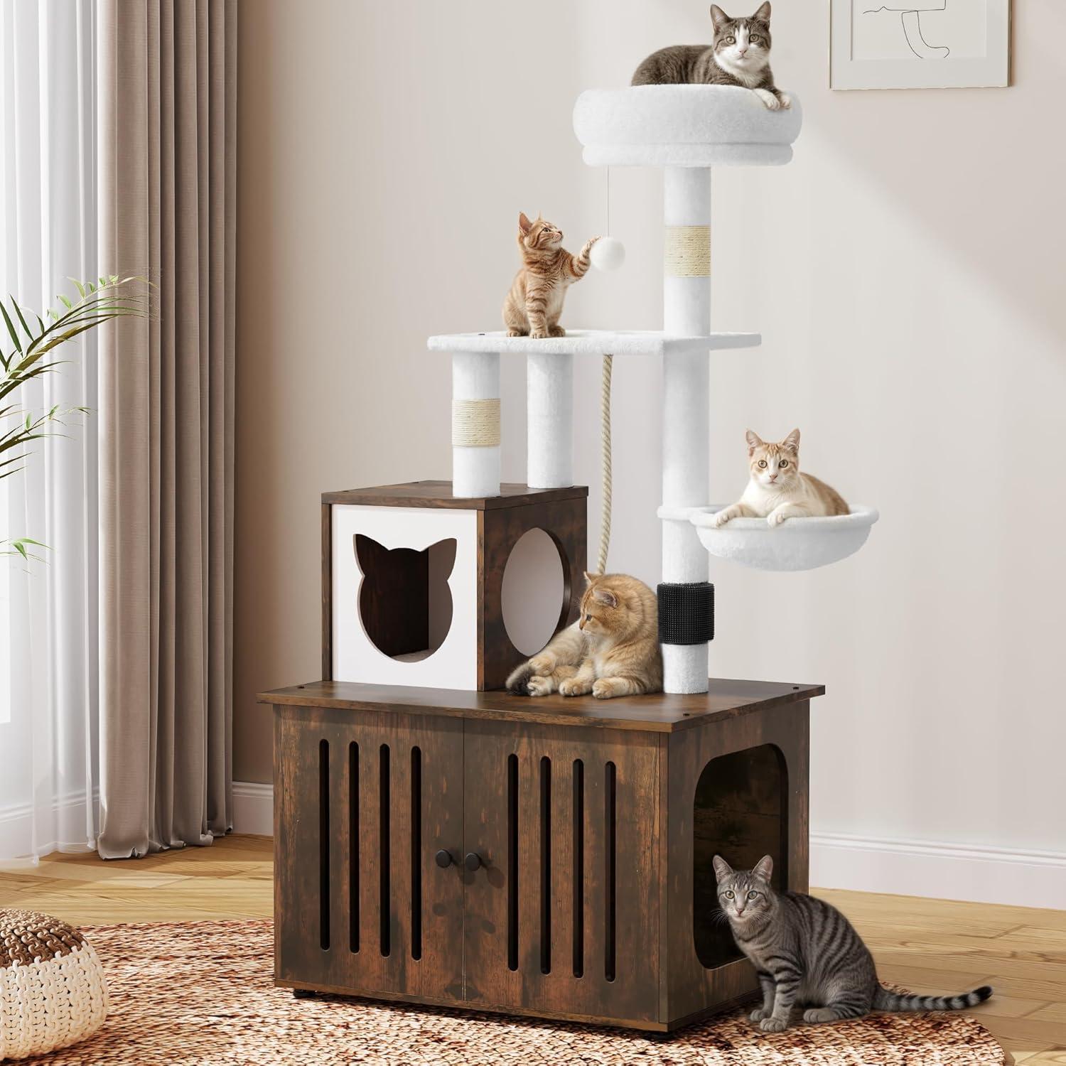 2-in-1 Cat Furniture: This innovative cat tree comes with a hidden litter box to achieve a multifunctional space that caters to all your feline companion's needs; It serves as a designated area for your cat to the washroom, relax, sleep and have meals conveniently.
