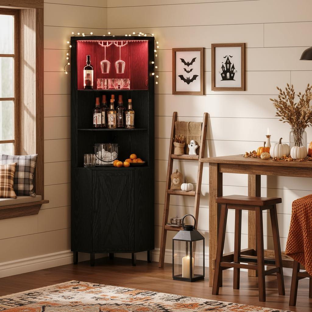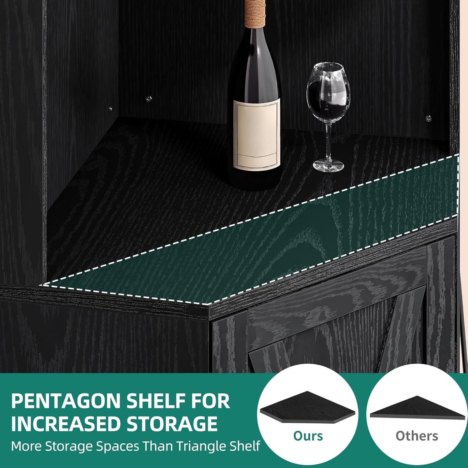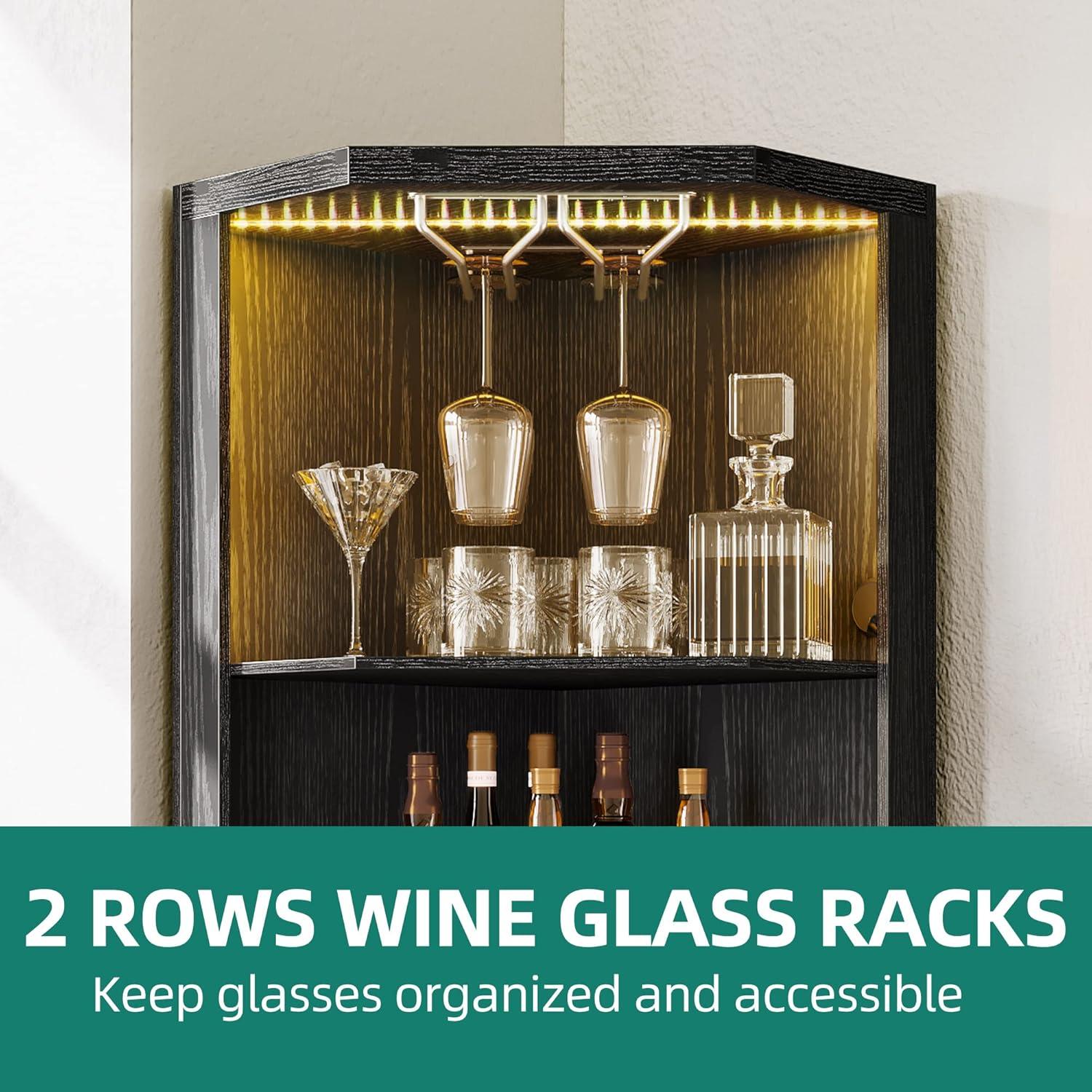 Corner bar cabinet: with 2 rows wine glass racks, you can hang your wine glasses to keep them neatly organized and easily accessible, while avoiding accidental collisions. At the bottom of the corner liquor bar is a double tier storage cabinet,The middle shelf can be removed or adjustable position for storing items of different heights