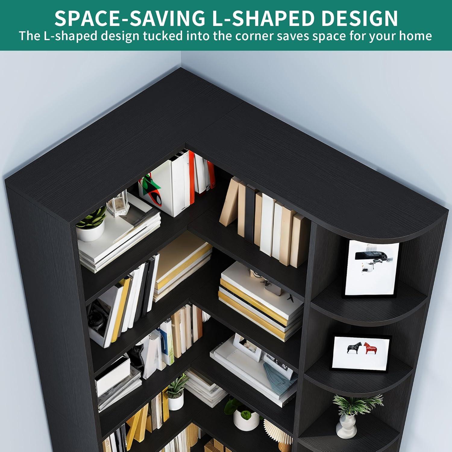 Elegant Assortment: Elevate your space with this black corner book shelf. Its six tiers offer endless display or storage possibilities, while its modern design adds sophistication to any room. Ideal for a cozy reading nook or a stunning centerpiece