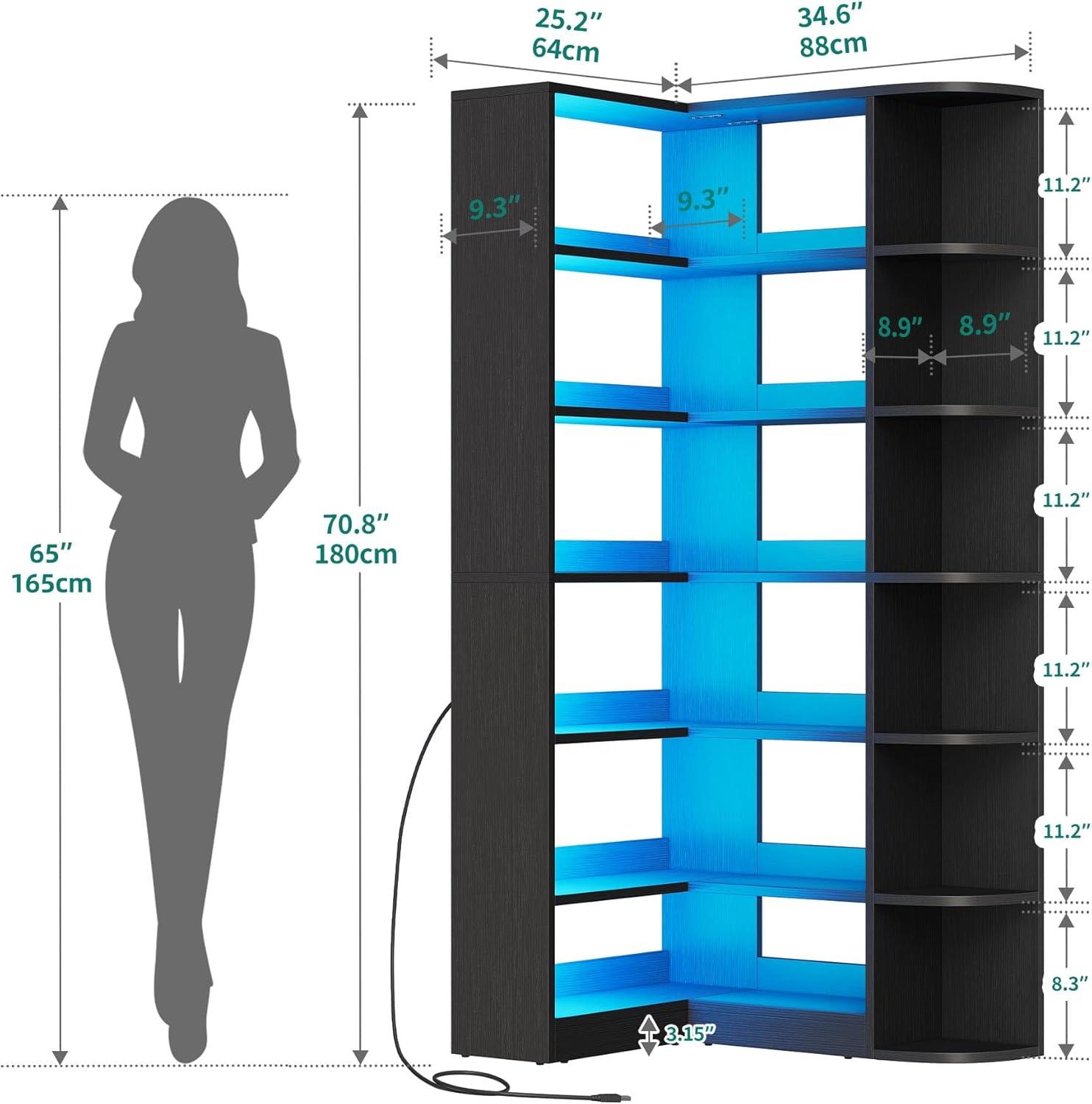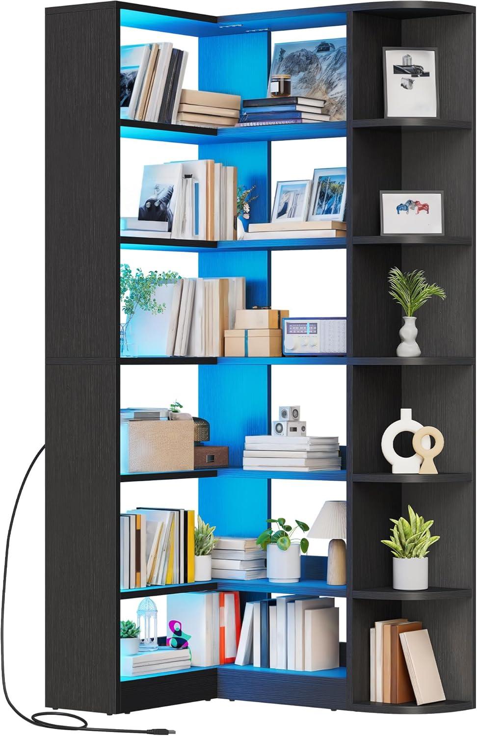 YITAHOME Corner Bookshelf and Bookcase with LED Light, Black Bookshelf 6 Tier Corner Shelf L-Shaped Bookcase Storage Display Shelf for Home Office, Living Room, Bedroom, Black(White)