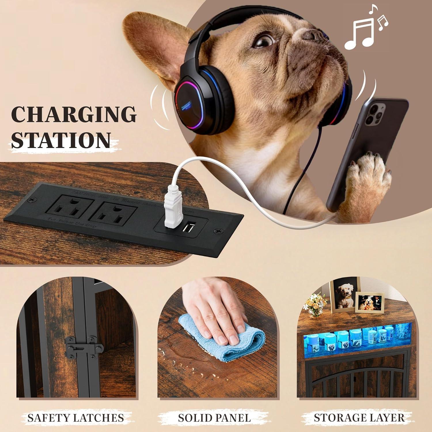 LED Dog Kennel with Power Ports: Add style to your home with our indoor dog kennel, featuring a colorful LED light strip with 16+ colors, controlled by remote or app. It also includes 2 AC outlets and 2 USB ports for convenient device charging
