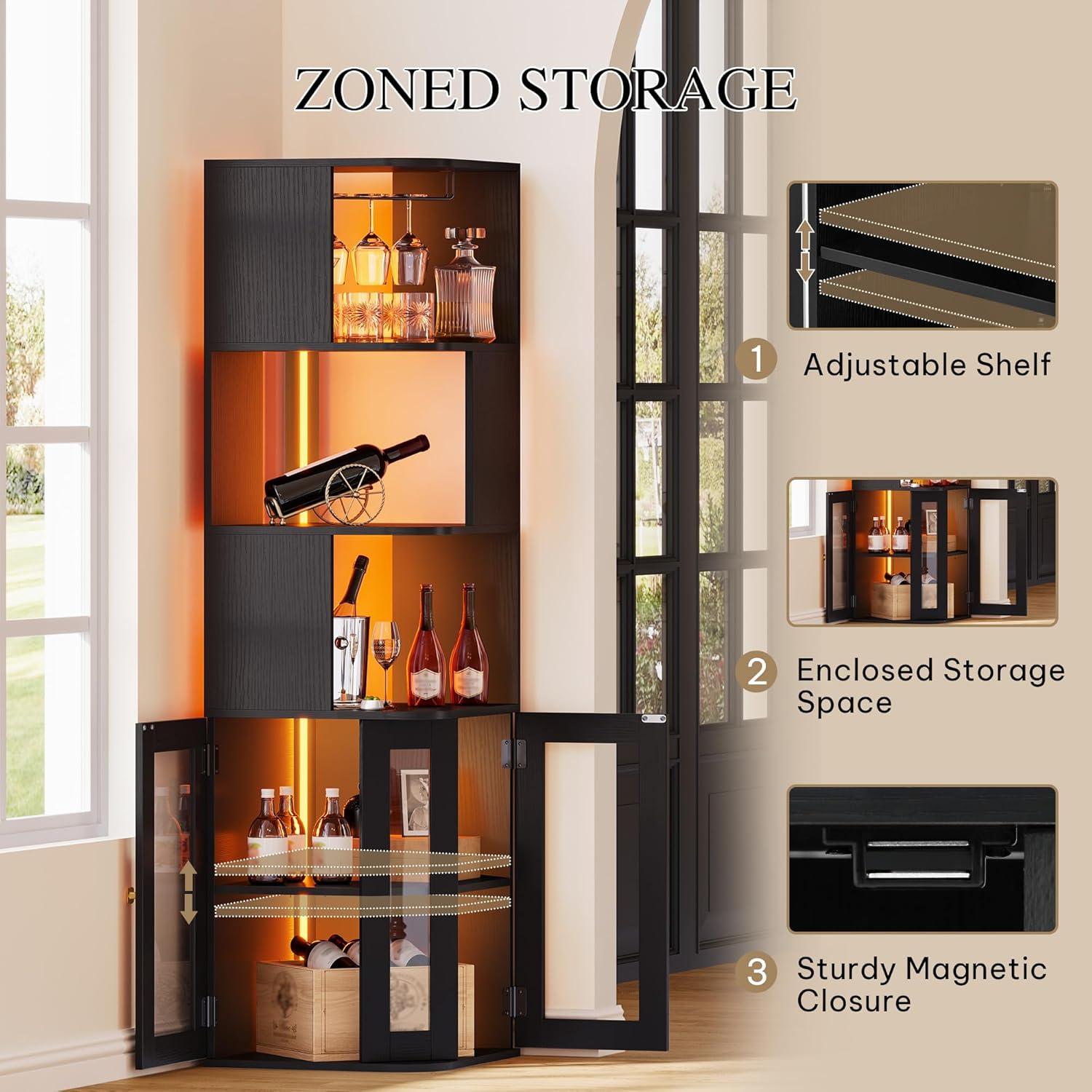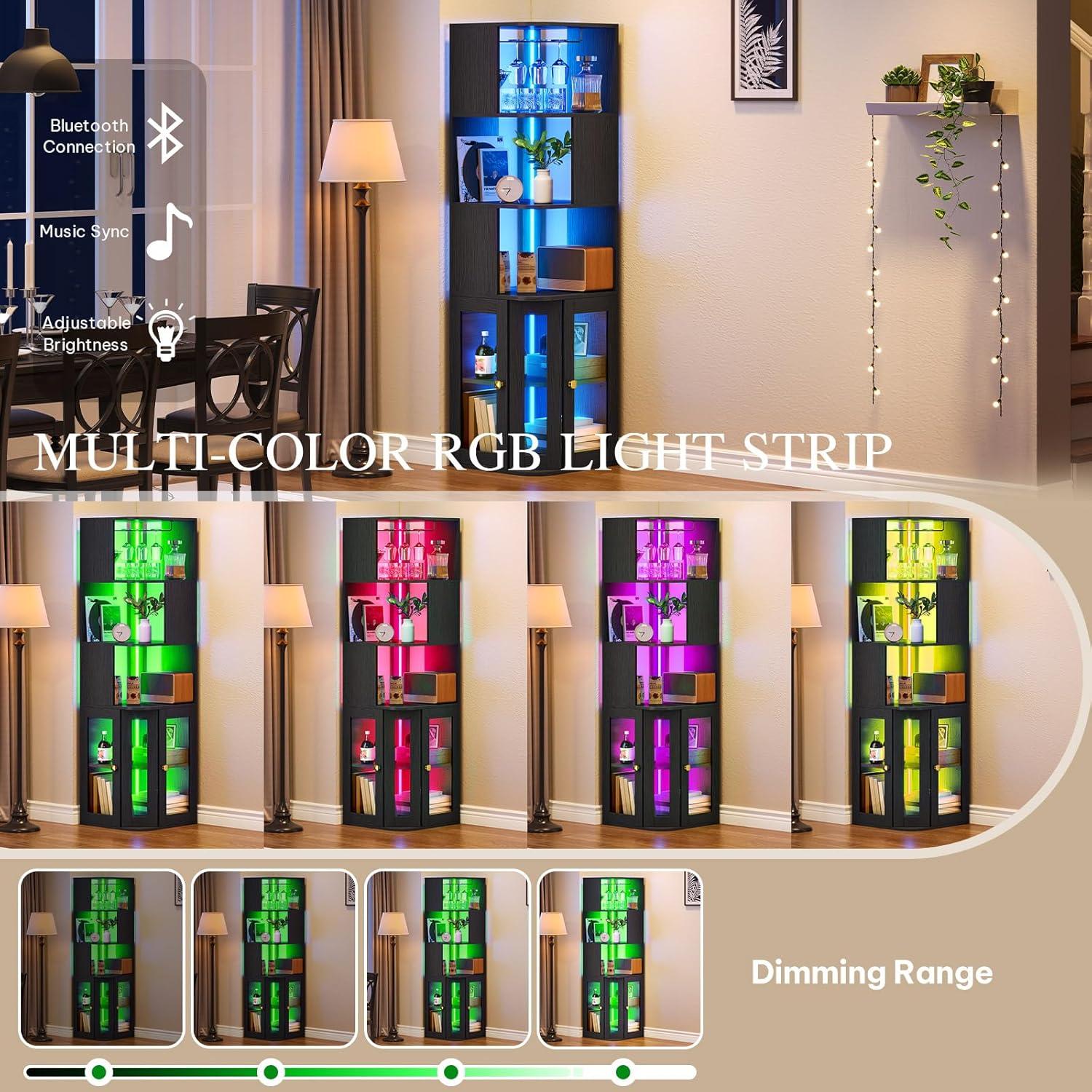 Lighting for Every Occasion: A light string runs through the entire corner wine cabinet, casting a warm or serene glow depending on your preference. With Bluetooth control and remote, you can easily adjust the color and brightness to match the vibe of any occasion