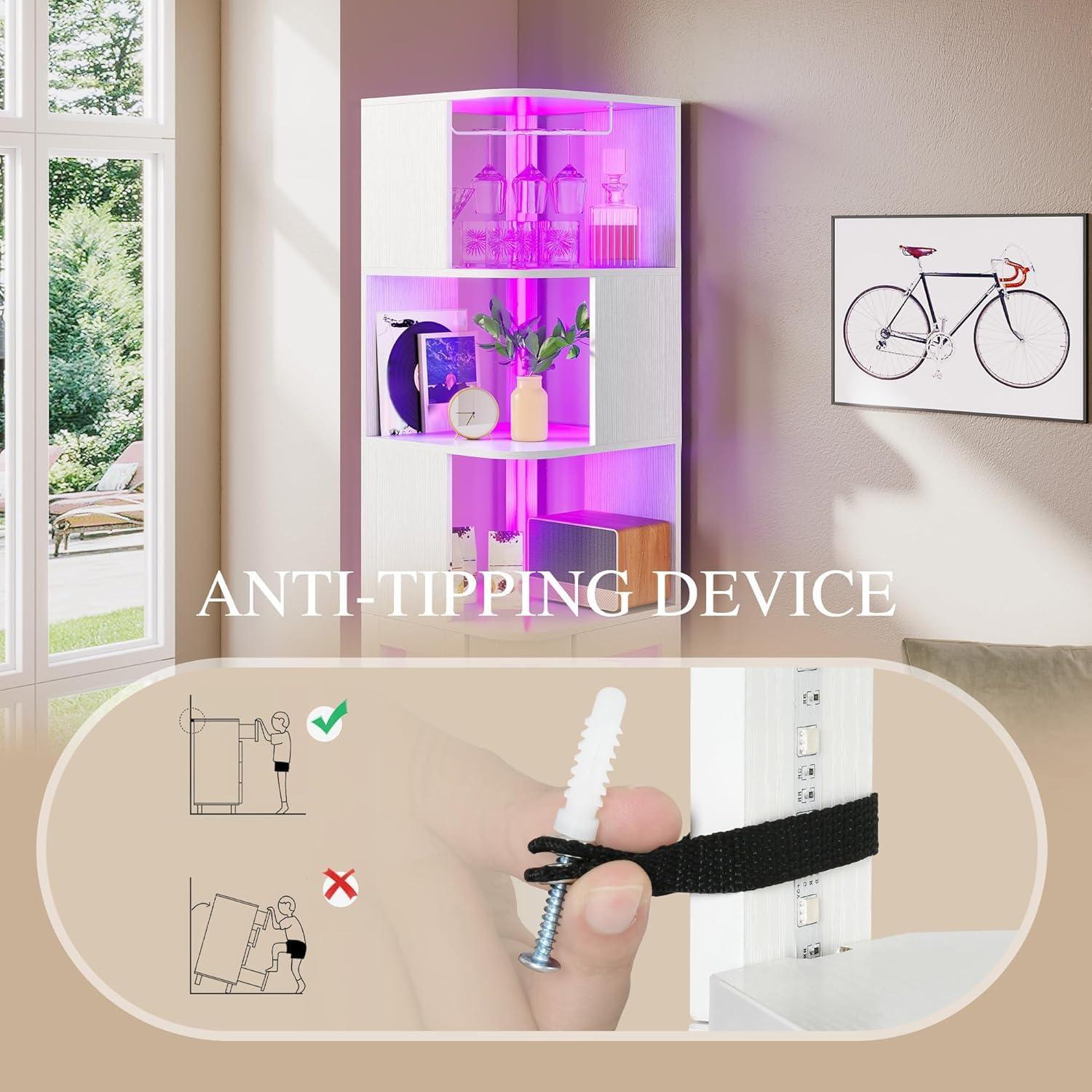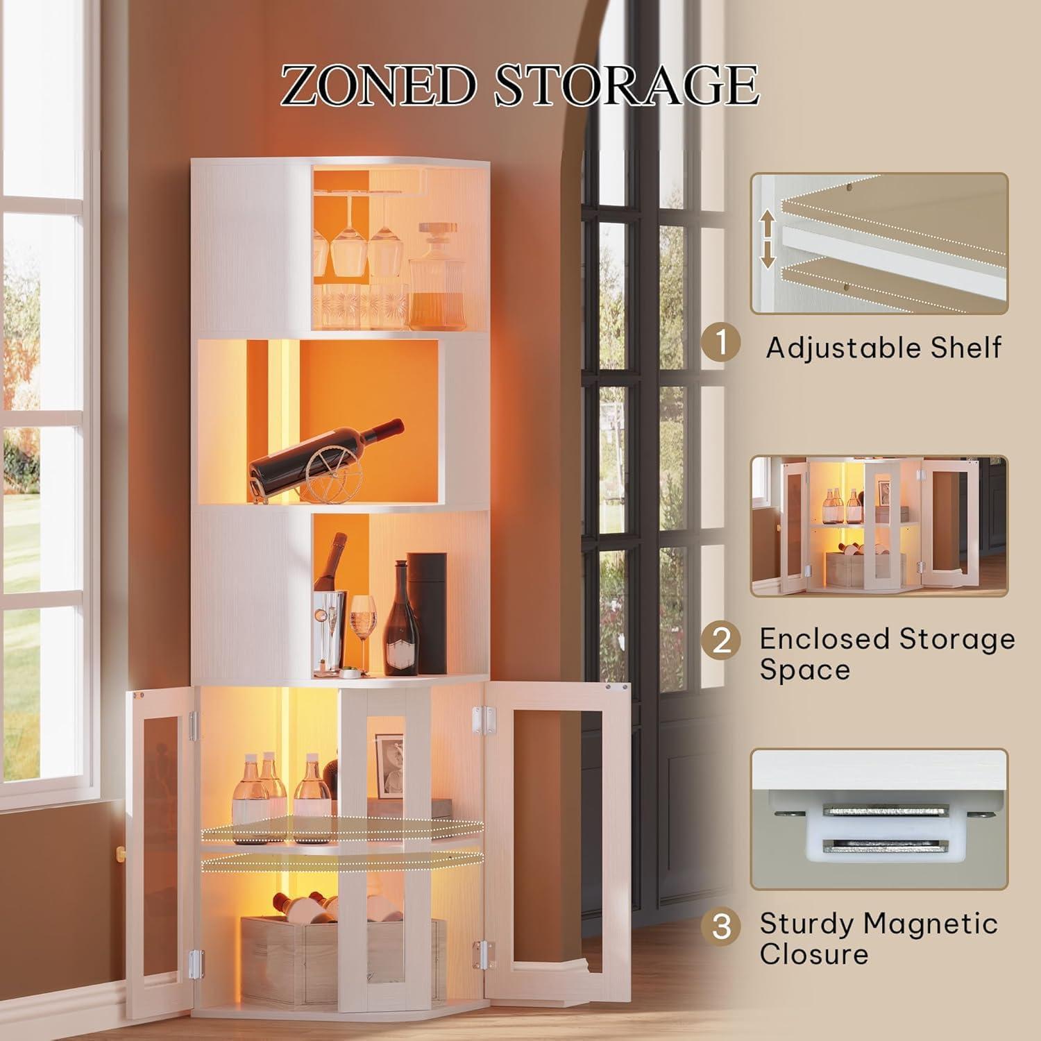 Stylish Design: The unique scattered shelf design adds a modern flair to your space, whether our LED corner wine cabinet in the dining room, living room, or kitchen. Its angled structure fits seamlessly into any corner, maximizing your room's potential