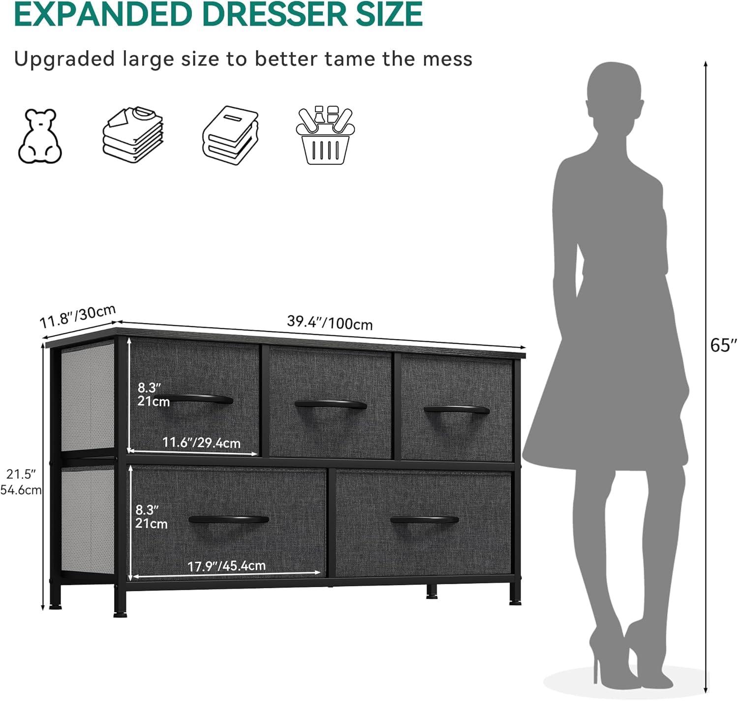 LARGE CAPACITY- 5 drawers in different sizes provide multiple storage options and ample room to make your living space neat and tidy; Overall dimensions: 39.4″ L x 11.8″ W x 21.5″ H, Drawer dimensions: 17.9″ L x 11.2″ W x 8.5″ H / 11.6″ L x 11.2″ W x 8.5″ H