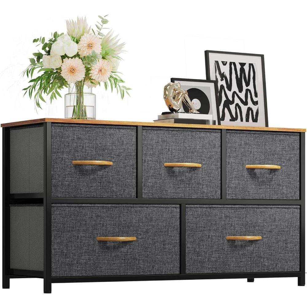 YITAHOME Dresser with 5 Drawers – Fabric Storage Tower, Organizer Unit for Bedroom, Living Room, Closets – Sturdy Steel Frame, Wooden Top(Cool Dark Grey)