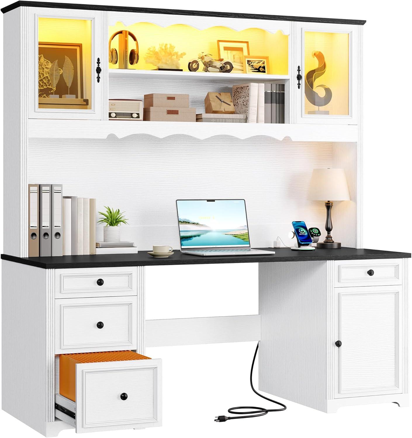 Stay Organized Effortlessly: The computer desk with hutch features cabinets with glass door , open shelves, and cubbies for displaying decor or organizing books, while the office desk offers 4 spacious drawers (a file drawer for A4 size) + a built-in storage cabinet, adapting to your storage need