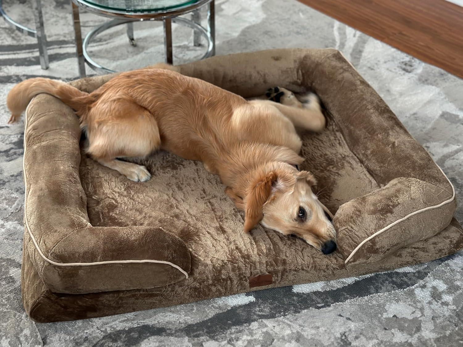 【BOLSTERS DESIGN】This dog couch is designed with three side pillows, the fence-like design makes your dog feel more secure when lying on it. And the 3-inch side pillows provide extra support to relax and soothe your pet's neck and head for a better rest on the dog sofa.