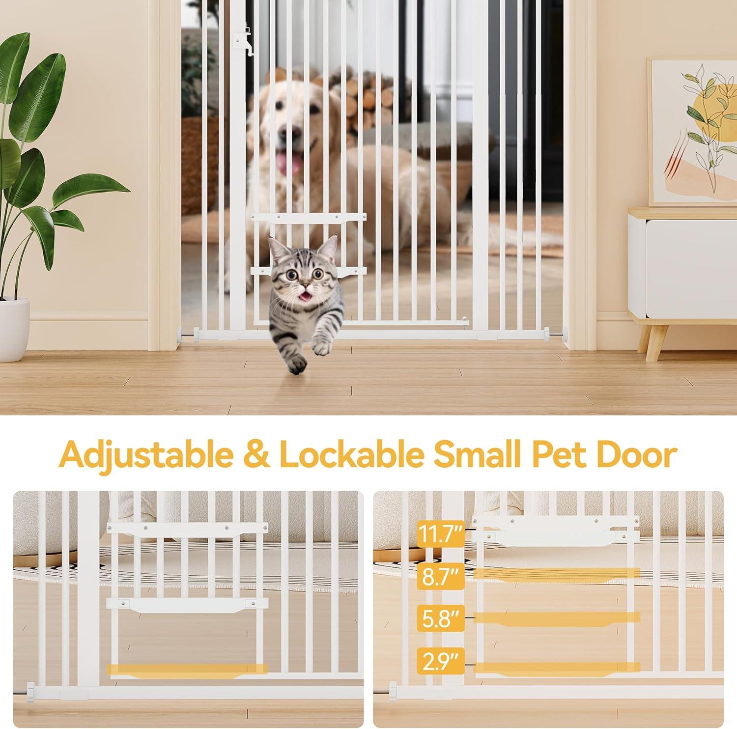 SAFE AND STRONG: Our pet safety gate is made of steel and can with stand heavy impacts up to 200 lbs. The dual-lock design pulls and lifts with one pull, so adults can open the door with one hand. The pet door is also equipped with an auto-closing feature that closes automatically when the angle is less than 90°, preventing small animals from slipping out!