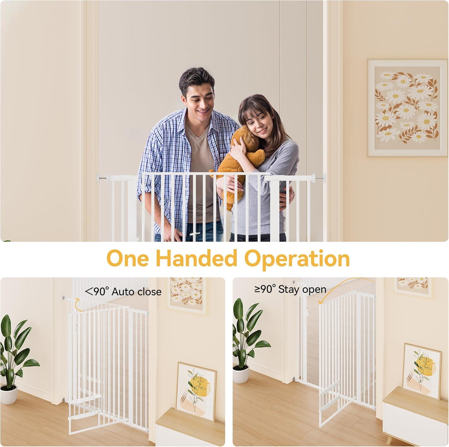 SAFE AND STRONG: Our pet safety gate is made of steel and can with stand heavy impacts up to 200 lbs. The dual-lock design pulls and lifts with one pull, so adults can open the door with one hand. The pet door is also equipped with an auto-closing feature that closes automatically when the angle is less than 90°, preventing small animals from slipping out!