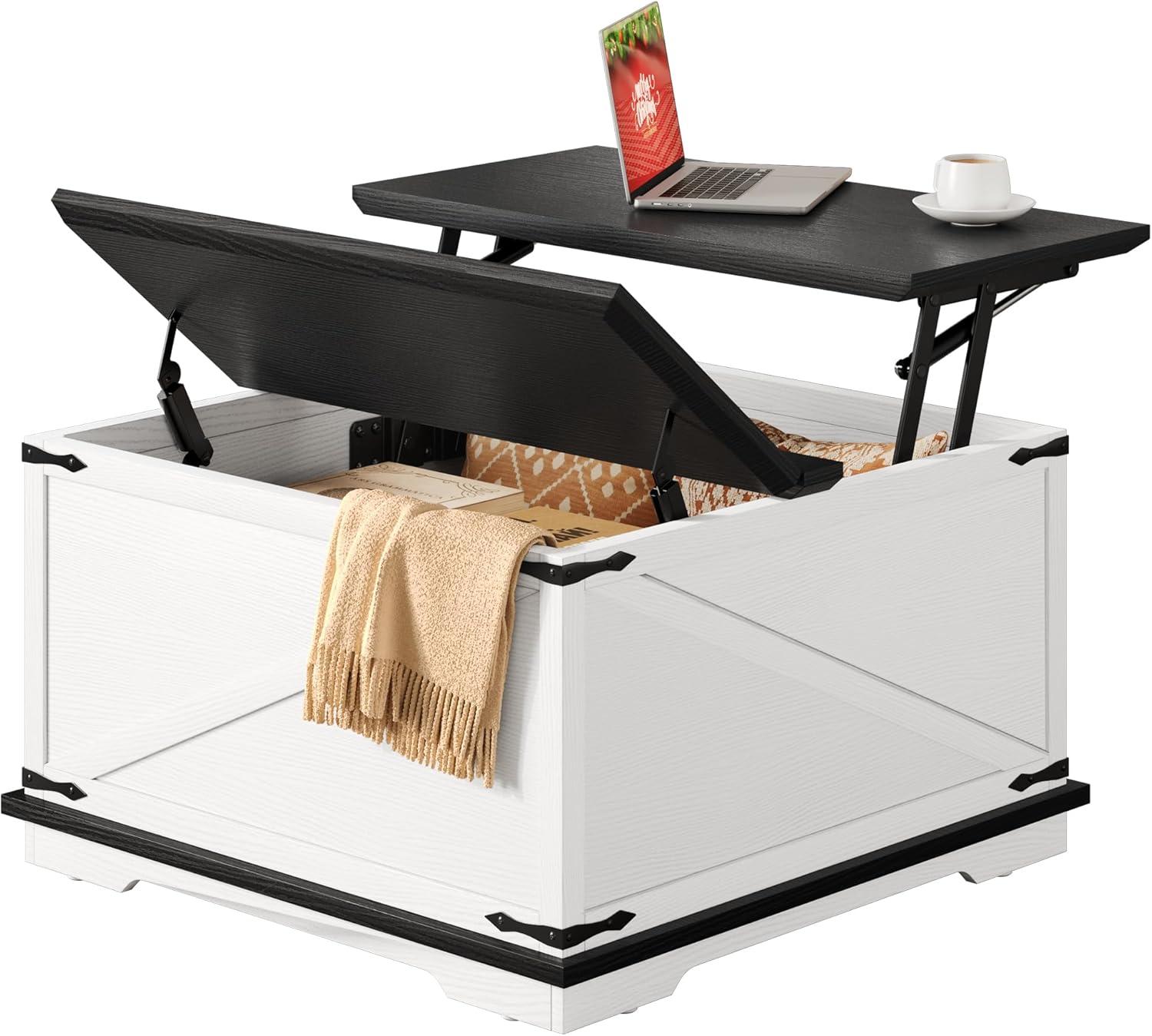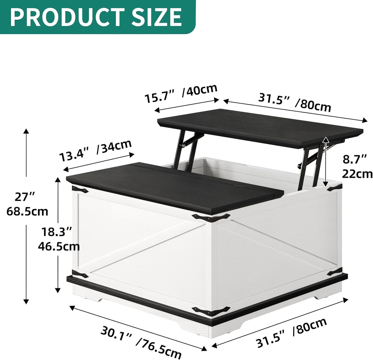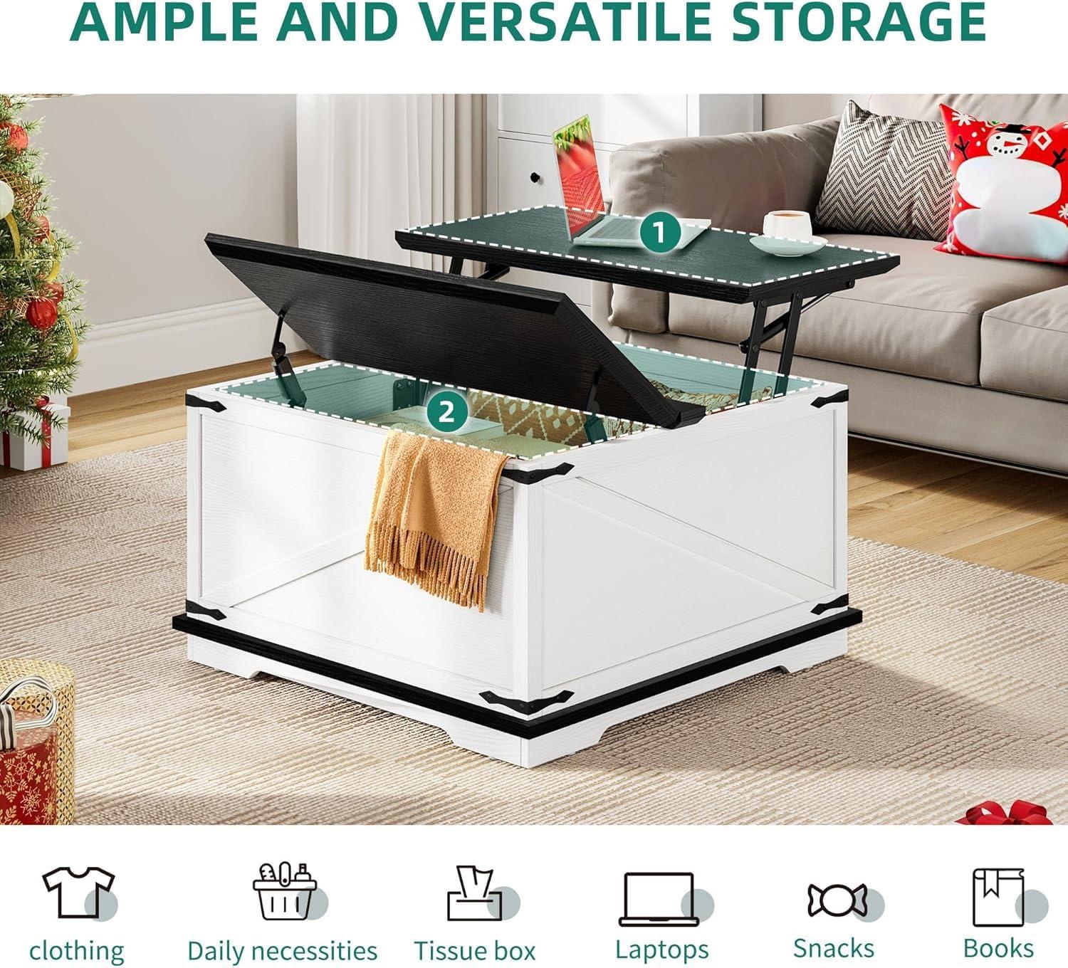 Large hidden storage space: The coffee table has a hidden compartment design (storage space: 31.5″x31.5″x18.1″. The tabletop on one side can be lifted up, cleverly providing a hidden space suitable for storing pillows and blankets and board games, while also keeping them away from dust, keeping your living room clean and tidy, and items within easy reach
