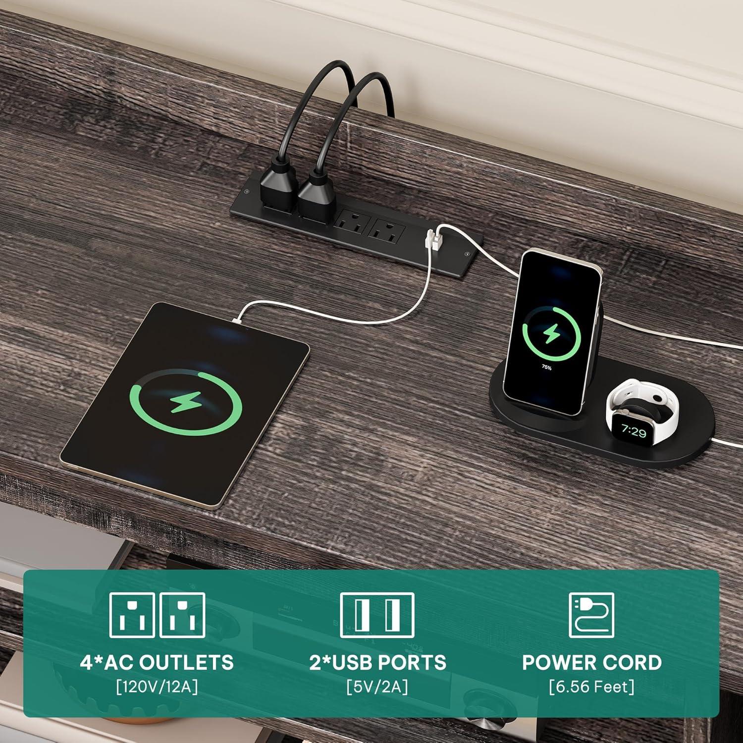 Power Outlet for Easy Charging: Equipped with 4 AC outlets and 2 USB ports on the tabletop, this entertainment center with storage makes charging your devices effortless. The convenient cord cutout behind the middle compartment keeps wires organized, ensuring a tidy space at all times