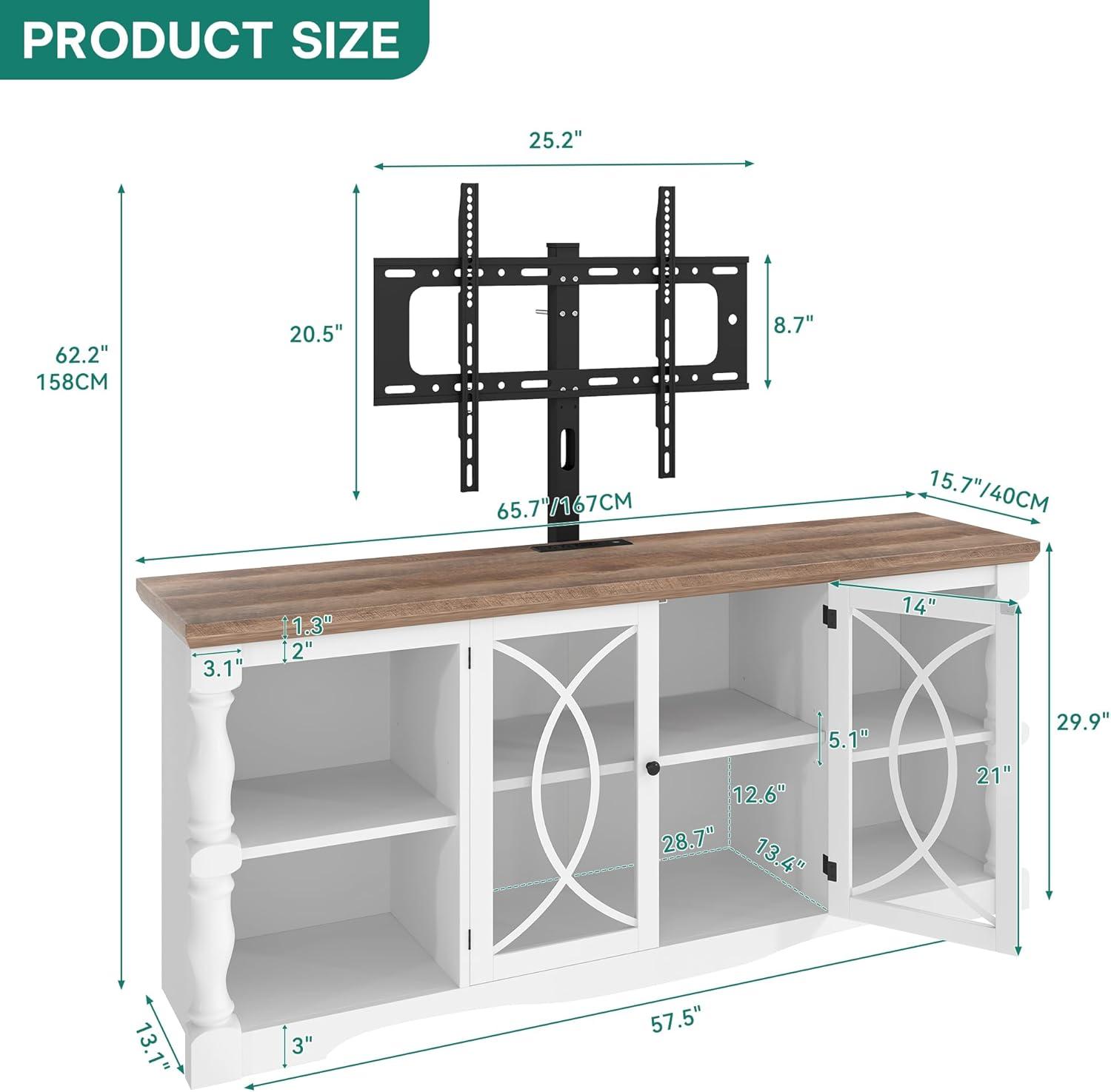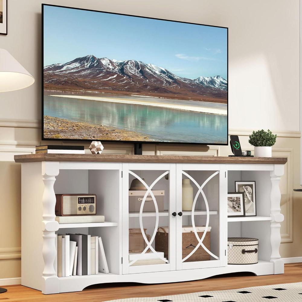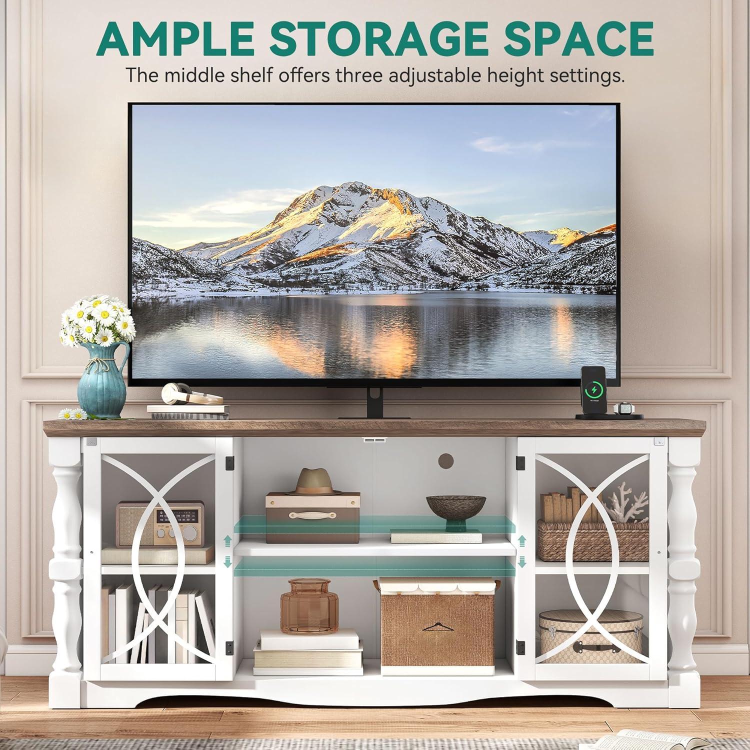 Smart Storage with Glass Doors: Our farmhouse TV stand features 2 open side shelves to keep essentials within reach, while the enclosed cabinet with an adjustable shelf and sleek tempered glass doors makes storing and finding items effortless