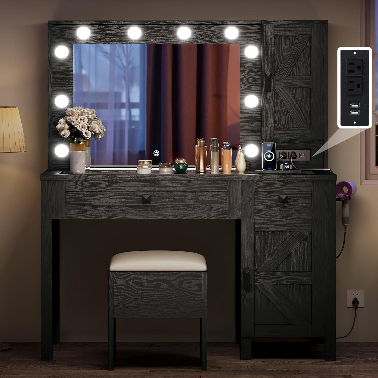 YITAHOME Farmhouse Vanity Desk with Mirror: Retro Makeup Table Set with Charging Station 10 Dimmable Lights, 2 Drawers & 2 Cabinets, Rustic Brown(Black)