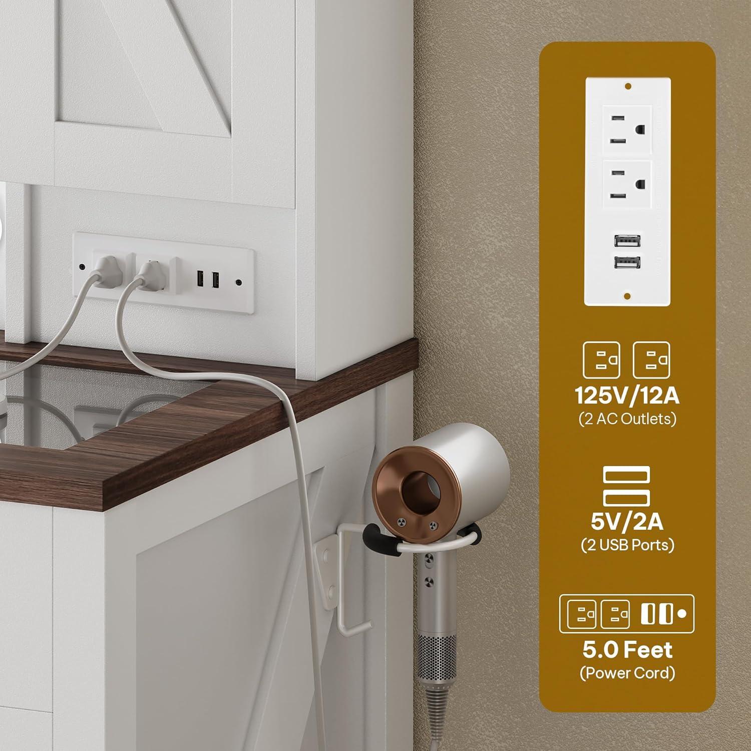 ​Built-in Power Strip with Hair Dryer Holder​ – This ​vanity with charging station​ features 2 USB ports and 2 AC outlets for convenient device charging. The integrated hair dryer holder keeps styling tools organized and accessible, creating an efficient ​makeup vanity with storage​ station for daily beauty routines