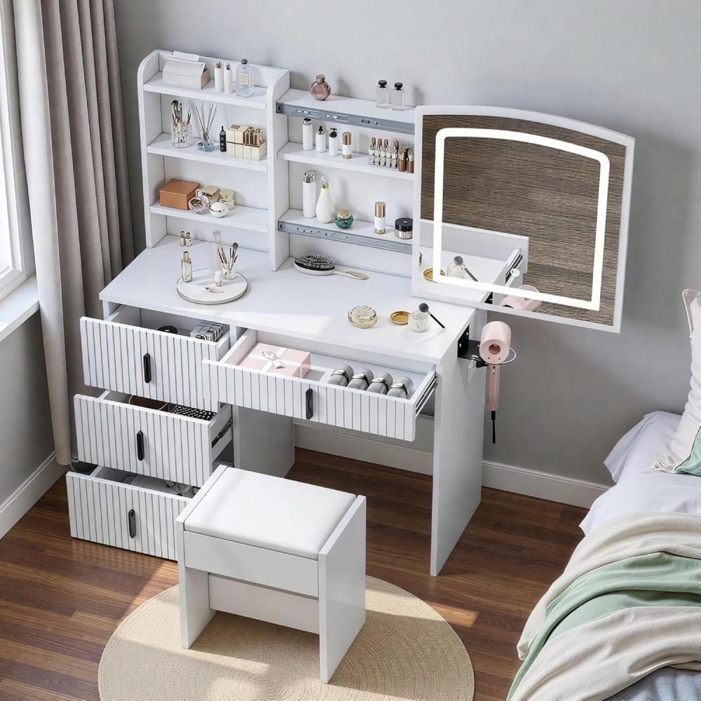 Storage Makeup Vanity with LED Mirror​ – This ​vanity makeup table​ features ​4 drawers and 3 open shelves​ for organized cosmetics display. The hidden compartment behind the ​LED mirror​ securely stores jewelry, while the fluted design adds elegance to any room. Ideal as a ​vanity for small spaces