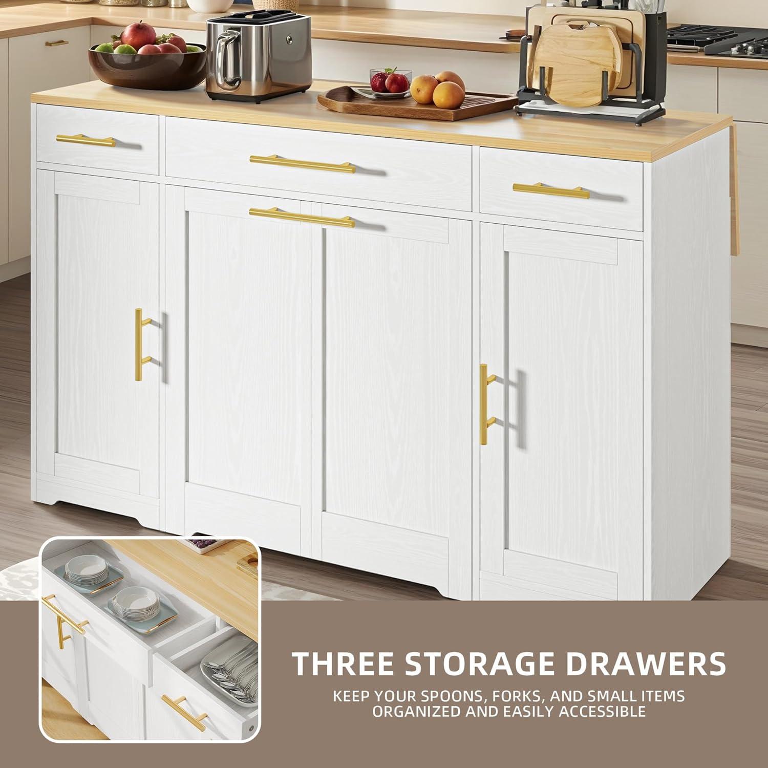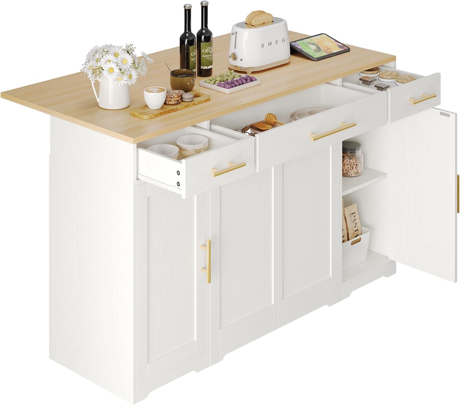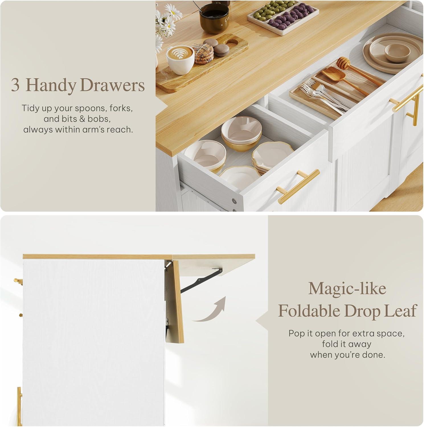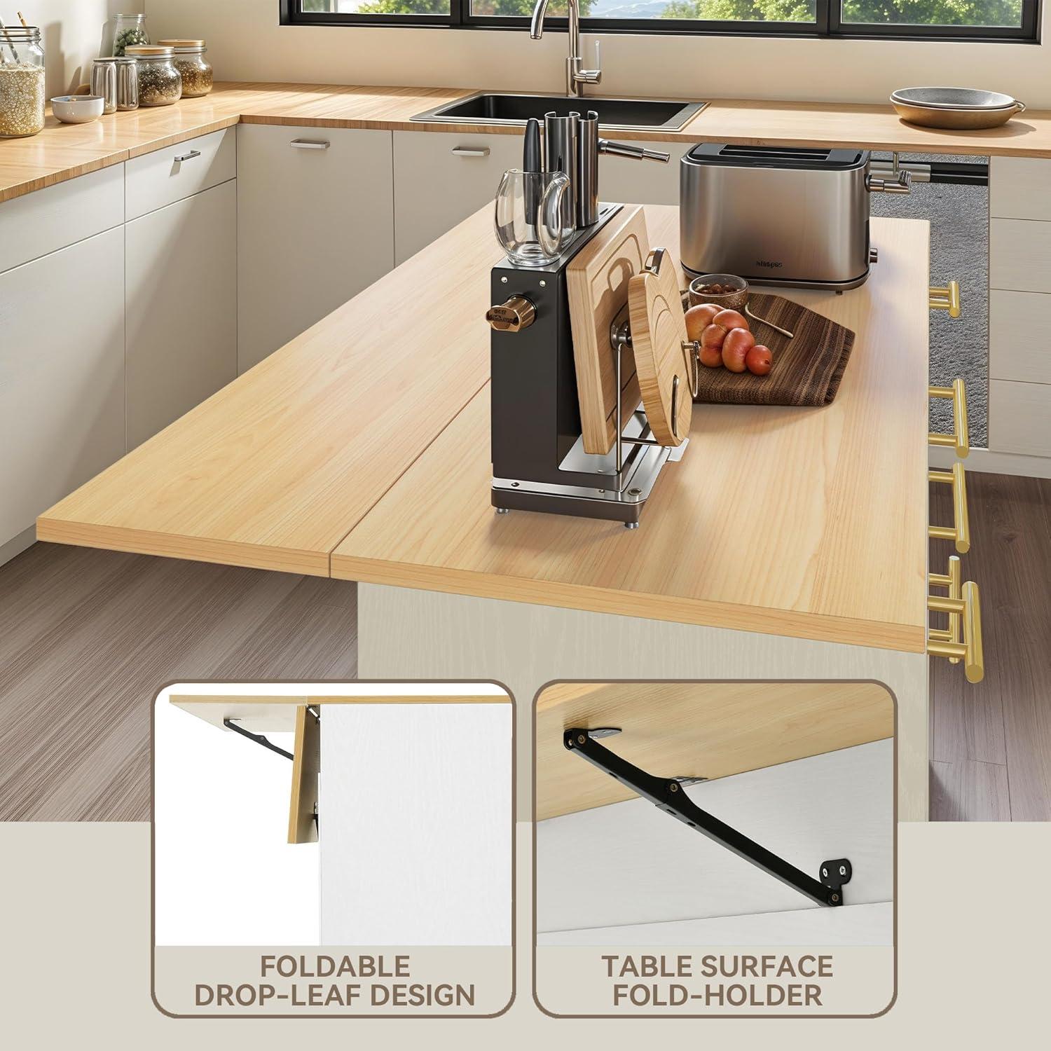 Folding Island: Our kitchen island transforms like magic with its foldable design. Use it as a spacious dining table or a compact kitchen island whenever you need extra space. Hidden buckles ensure secure locking of the drop leaf panels